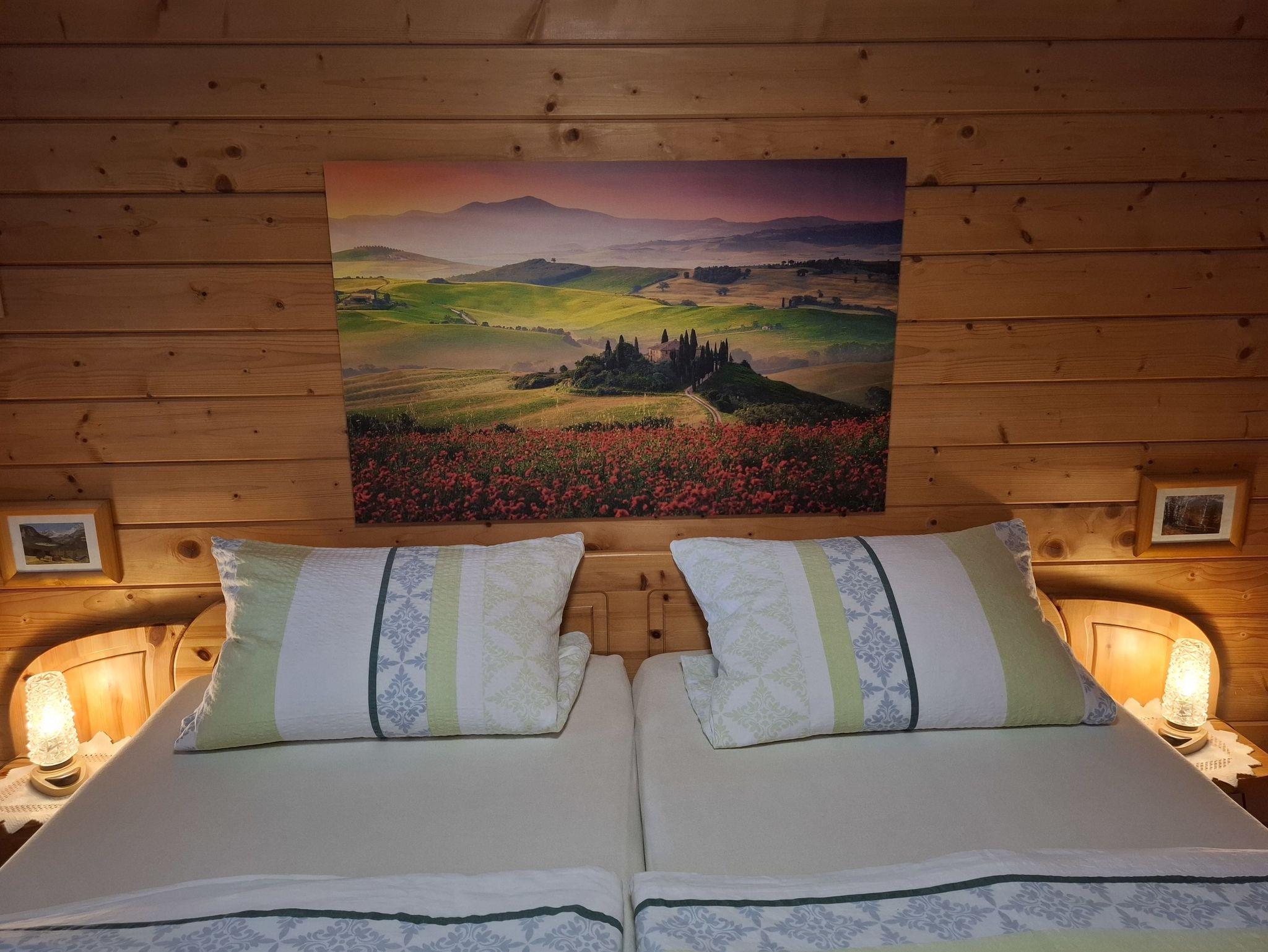 Das Schlafzimmer ist mit einem Doppelbett und einem Kleiderschrank ausgestattet. Die Betten sind bezogen und ein Wäschepaket (Handtücher, Geschirrhandtücher) sind im Reisepreis inkludiert.