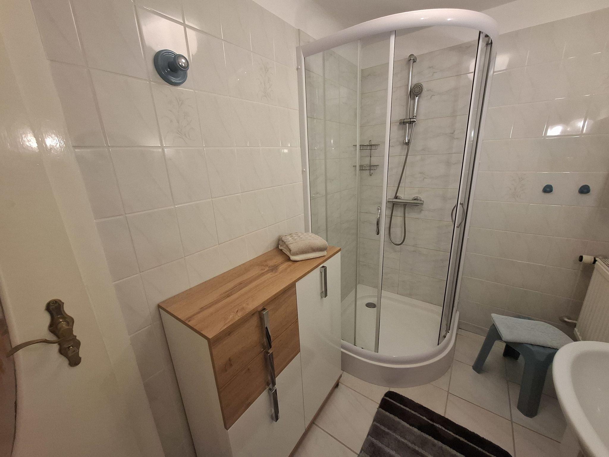 Das Wohnzimmer ist großzügig und hell und verfügt über eine große Einbauküche mit Ceranfeld, Herd, Kühlschrank mit Gefriermöglichkeit. Ein großer Esstisch und eine Couch laden zum Verweilen ein. Direkt über das Wohnzimmer erreichen Sie das Schlafzimmer mit einem Doppelbett und einem Kleiderschrank. Hinter dem Schlafzimmer befindet sich das innenliegende Bad mit Dusche und WC. Die Betten sind bezogen und ein Wäschepaket (Handtücher, Geschirrtuch) stehen kostenlos zur Verfügung.