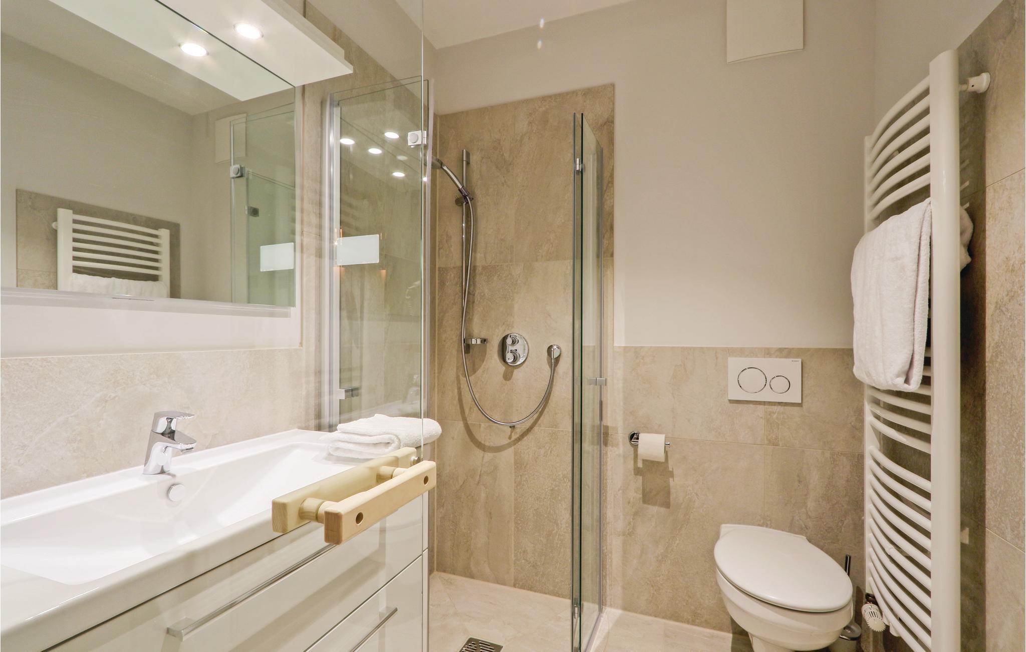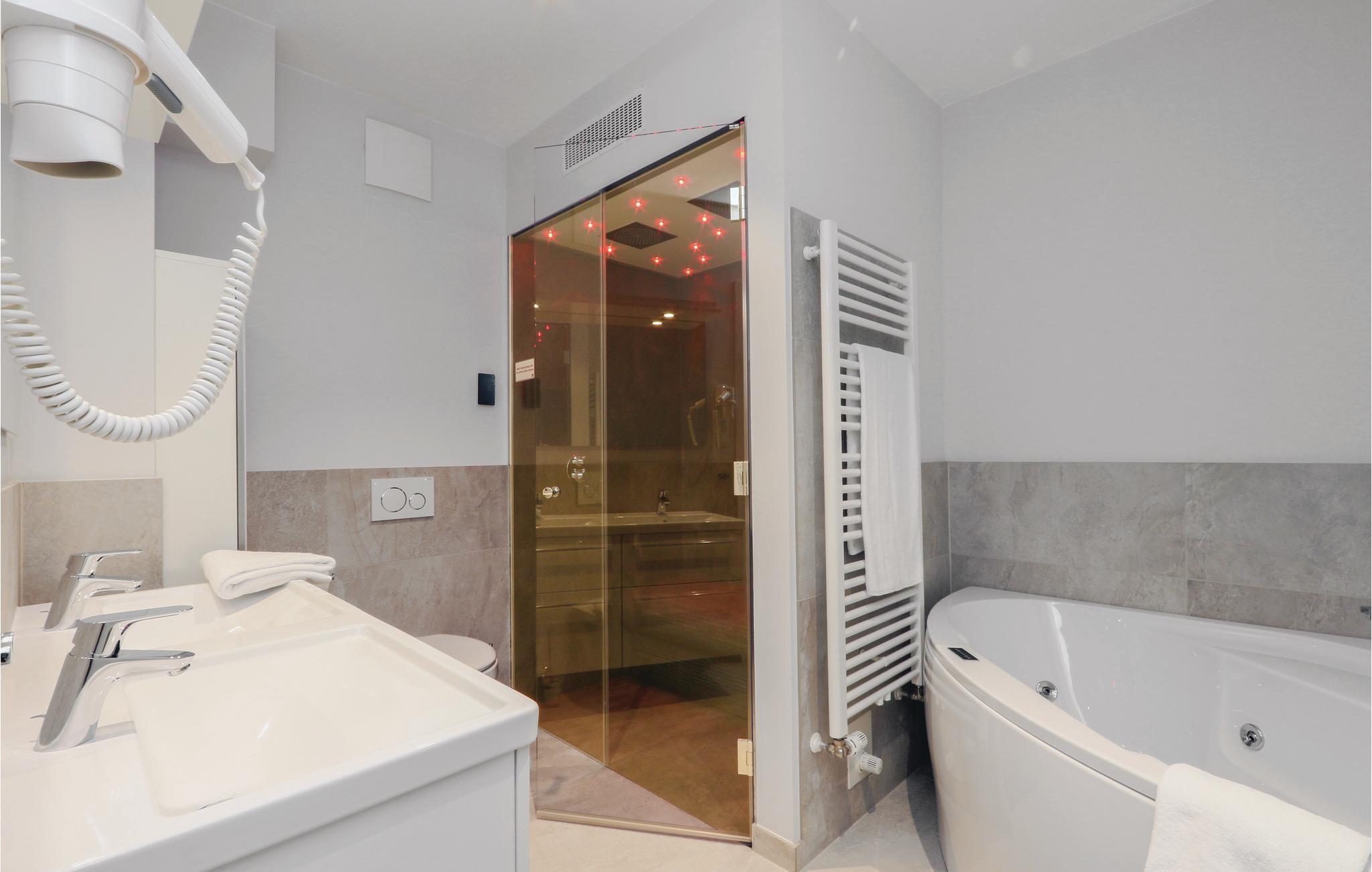 Det første badeværelse har en dobbelt regnbruser, dampbad og jacuzzi. I det andet badeværelse kan I varme dig i saunaen efter en lang gåtur.