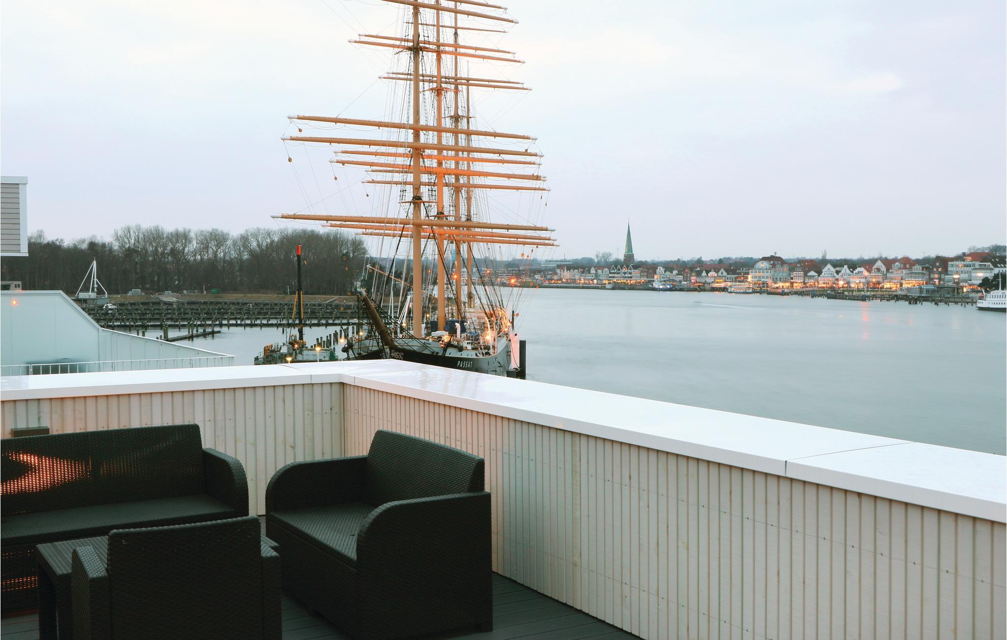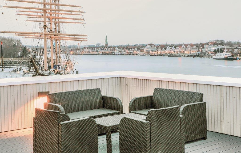 Som et highlight har penthouselejligheden en tagterrasse, hvorfra man kan nyde en fantastisk udsigt over havnen i Travemünde, Trave og Østersøen. I ser også på det imponerende museumsskib "Passat" og de store færger - en enestående panoramaudsigt! Penthouse er den eneste lejlighed på denne etage, så I kan også nyde privatlivets fred.