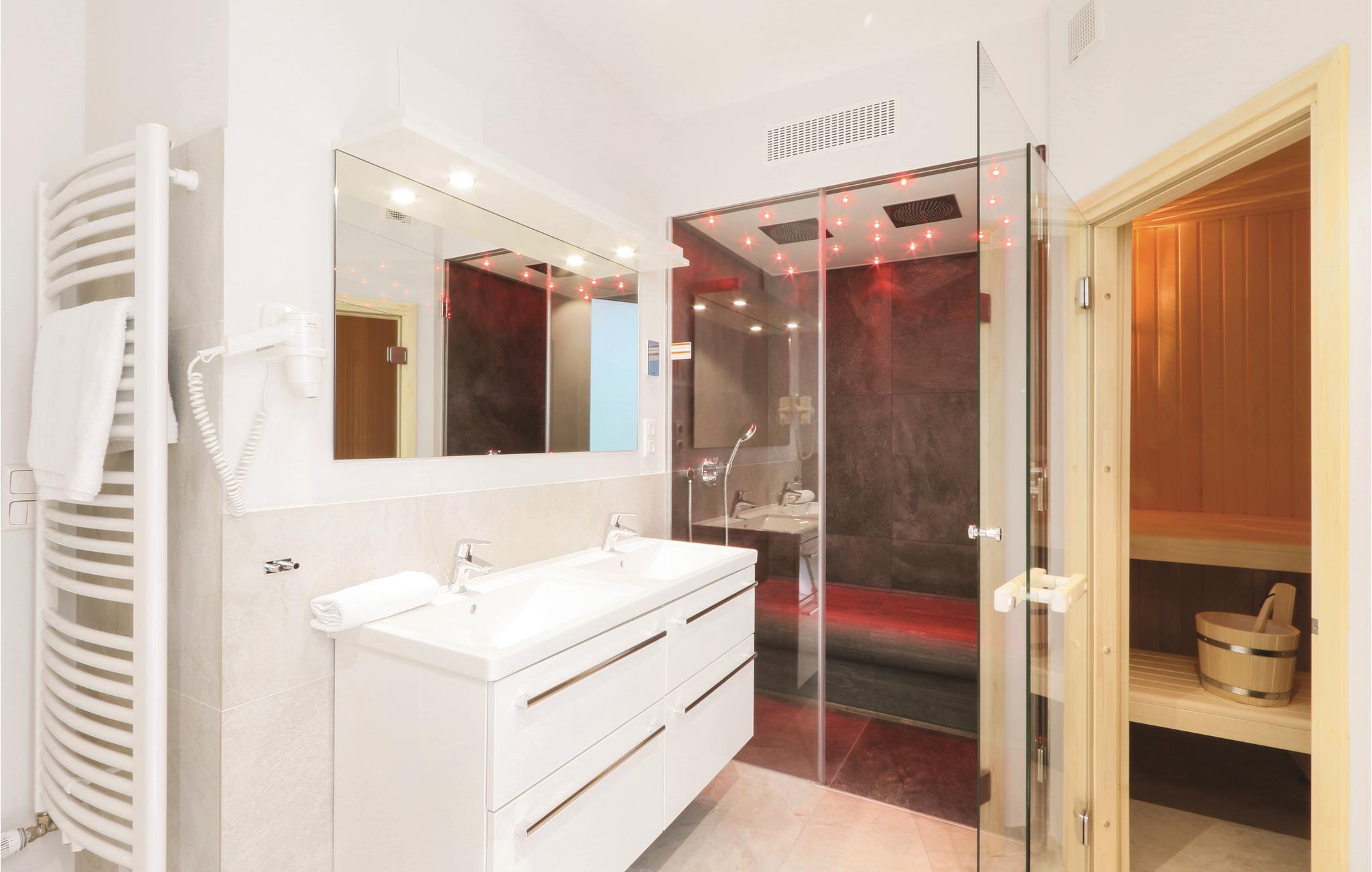 Noget særligt er badeværelset, der er jeres helt personlige lille wellnessområde med sauna, whirlpool og dampbad med integreret dobbelt regnskovsbruser. Her kan I slappe af og lade tankerne glide på langfart, glemme alt om hverdagens problemer og lade de flade batterier op igen.