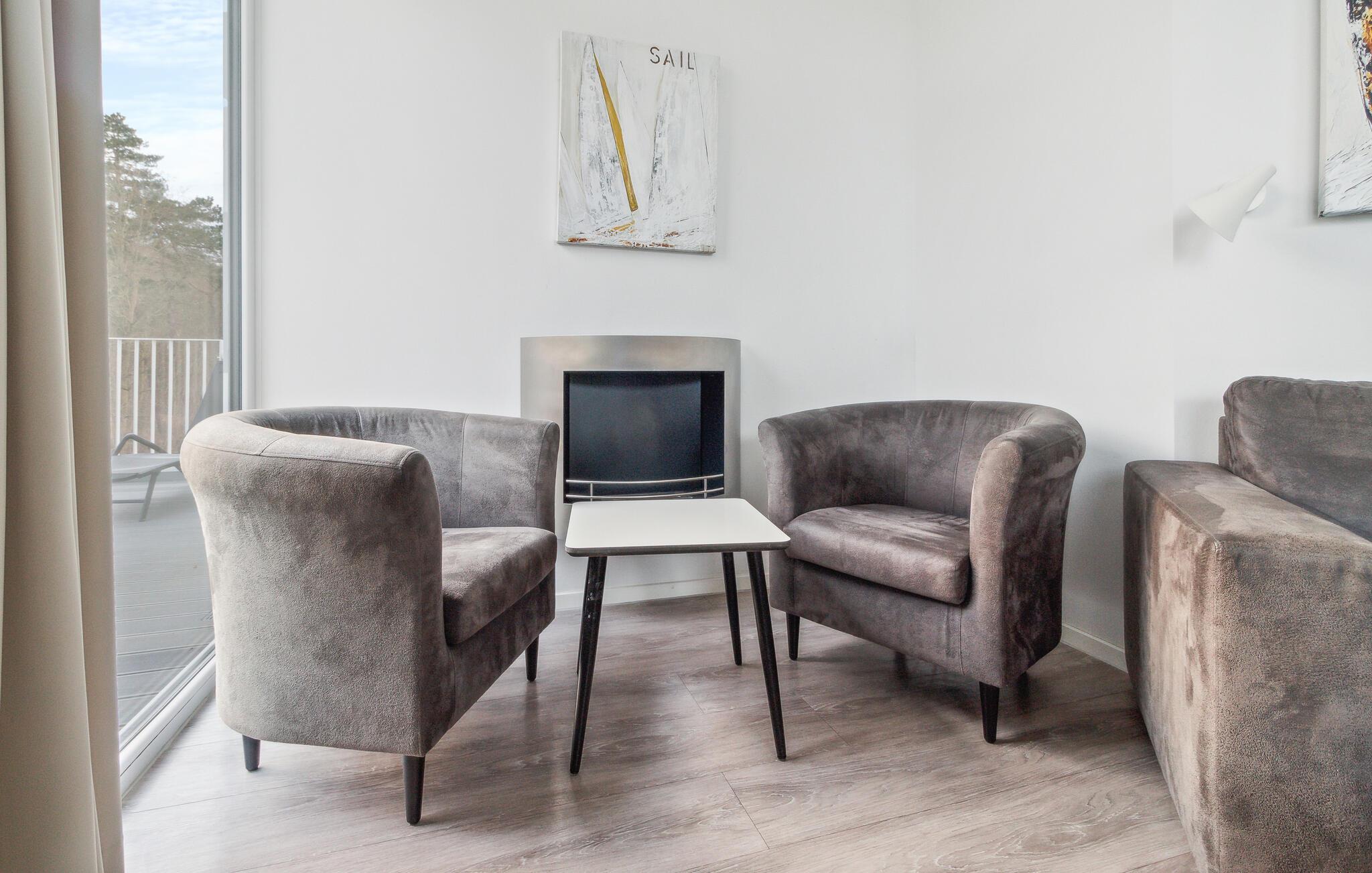 De tre soveværelser har hver en dobbeltseng. Endnu en sovemulighed finder I i stuen, hvor der er en sovesofa til to personer. fra et af soveværelserne kommer I direkte til badeværelset. Her kan I nyde en fantastisk udsigt fra whirlpoolen eller den dobbelte regnskovsdouche. I det andet badeværelse er der en privat sauna, som inviterer til ren afslapning. Ikke nok med det, når badet er slut, kan I sætte jer foran de flakkende flammer i bioetanol-kaminen, som giver et hyggeligt lys.