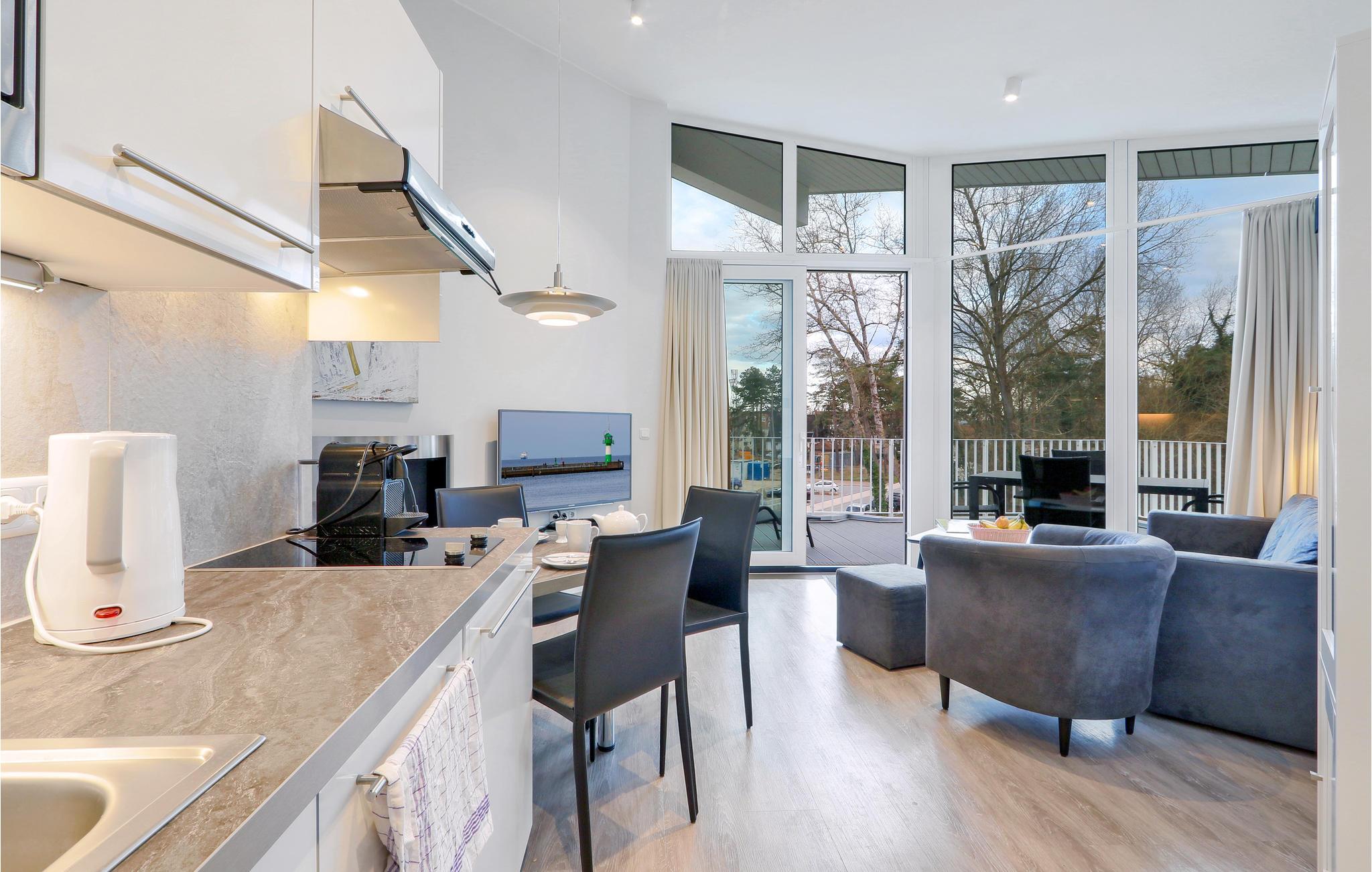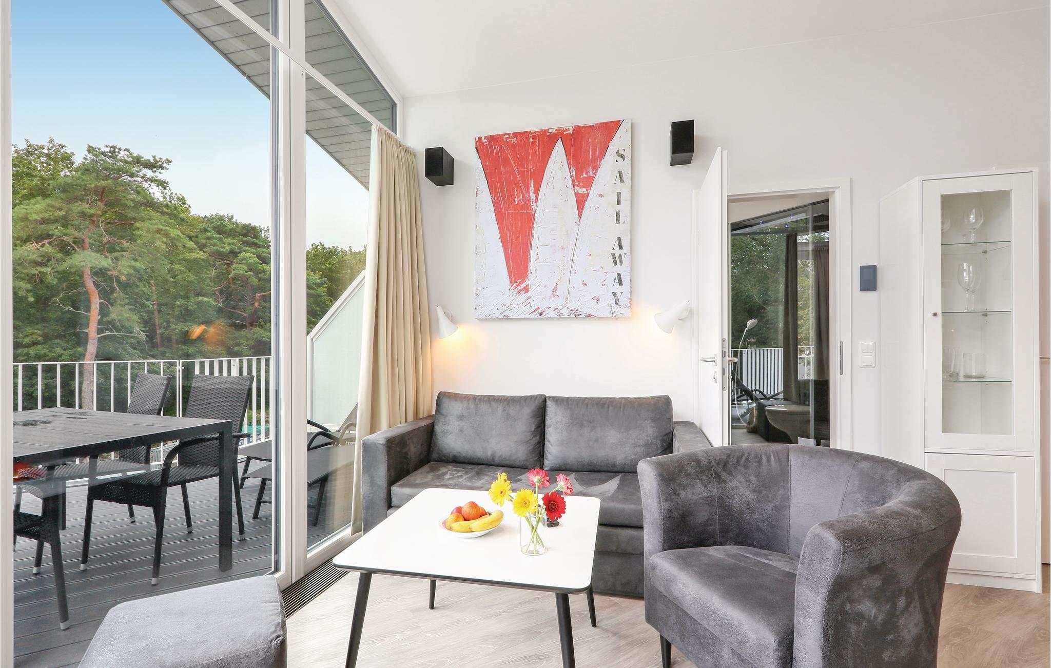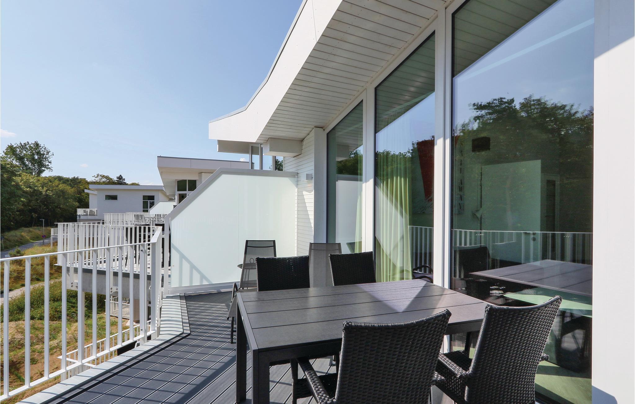 Ferielejligheden er flot indrettet i moderne design. I det separate soveværelse finder I en fin dobbeltseng, og i stuen er der yderligere to sovepladser. Herfra kan I gå ud på den store tagterrasse, hvor I kan sidde og spise jeres morgenmad eller bare nyde den friske Østersøluft. I stuen finder I en biokaminen, som bidrager til en hyggelig atmosfære i rummet. Badeværelset præsenterer sig som jeres helt eget wellnessområde med dampbad og dobbelt regnbruser. Lejligheden har desuden et moderne entertainment-system med bluray-afspiller, to fjernsyn, og et musikanlæg med mp3-tilslutning.