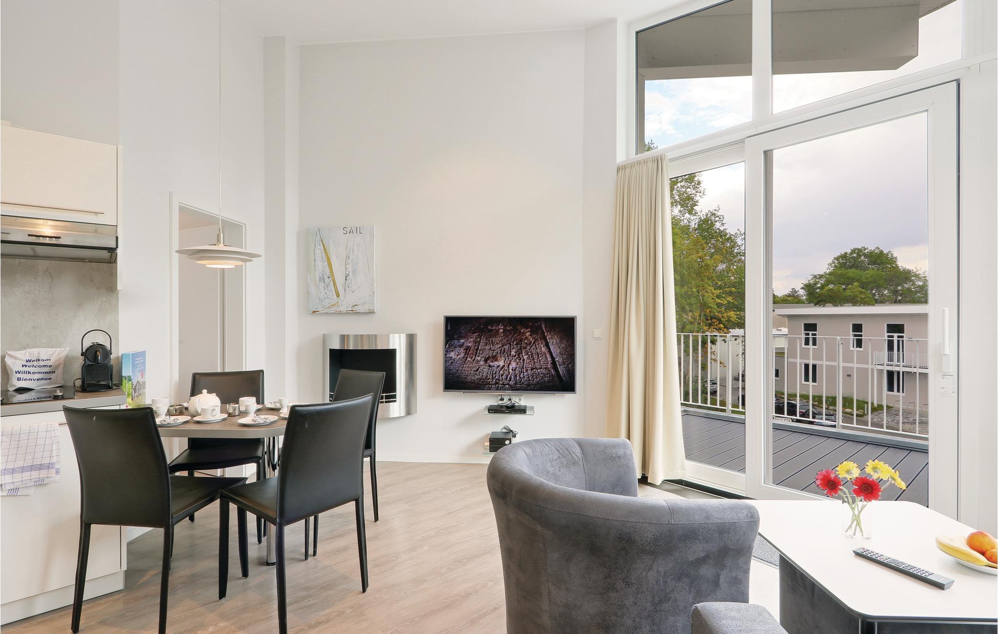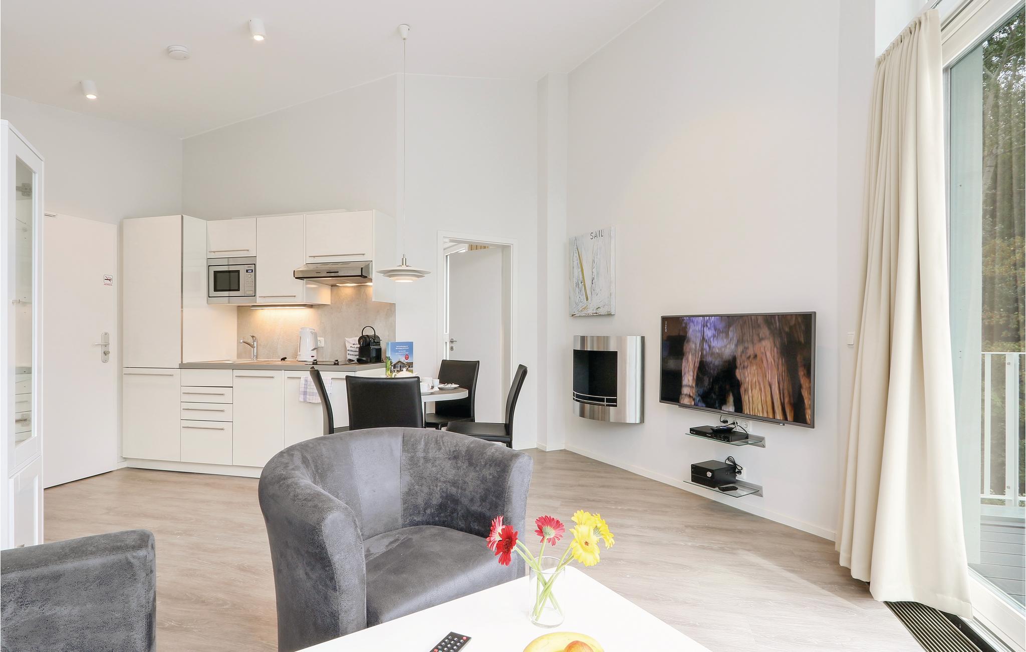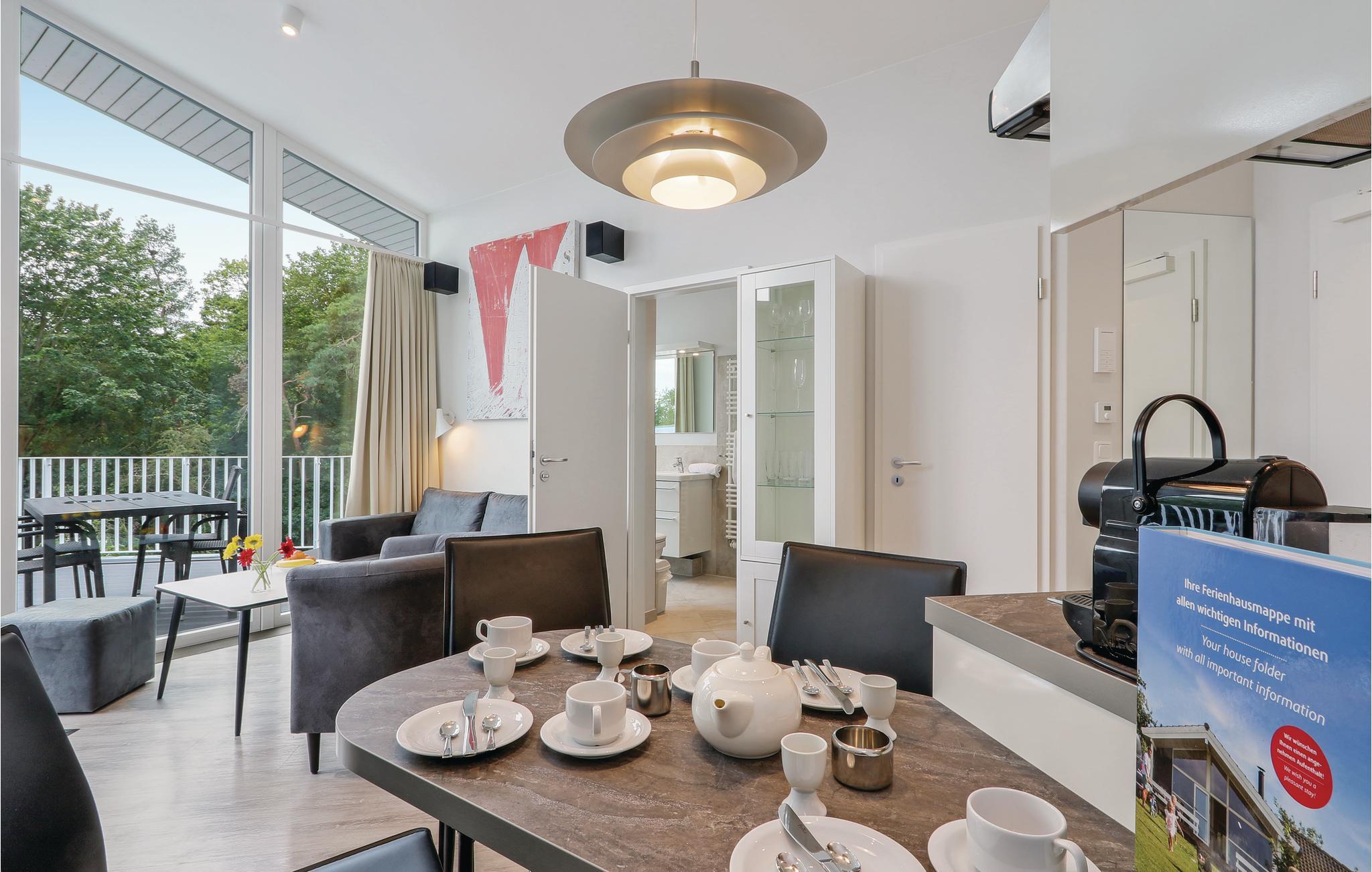 Ferielejligheden er flot indrettet i moderne design. I det separate soveværelse finder I en fin dobbeltseng, og i stuen er der yderligere to sovepladser. Herfra kan I gå ud på den store tagterrasse, hvor I kan sidde og spise jeres morgenmad eller bare nyde den friske Østersøluft. I stuen finder I en biokaminen, som bidrager til en hyggelig atmosfære i rummet. Badeværelset præsenterer sig som jeres helt eget wellnessområde med dampbad og dobbelt regnbruser. Lejligheden har desuden et moderne entertainment-system med bluray-afspiller, to fjernsyn, og et musikanlæg med mp3-tilslutning.
