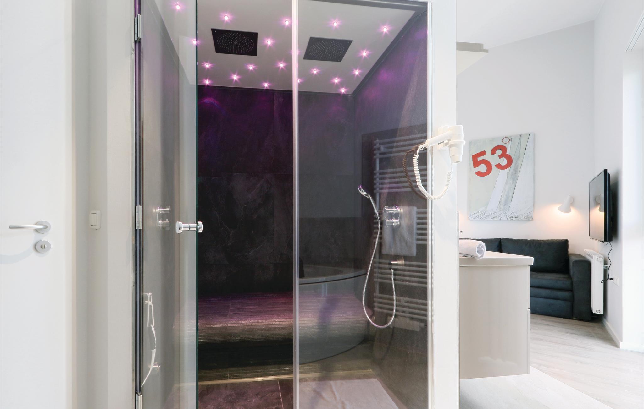 Det åbne badeværelse præsenterer sig som jeres helt eget wellnessområde med dampbad og dobbelt regnbruser. I kan også slappe af i whirlpoolen og svede igennem i saunaen.