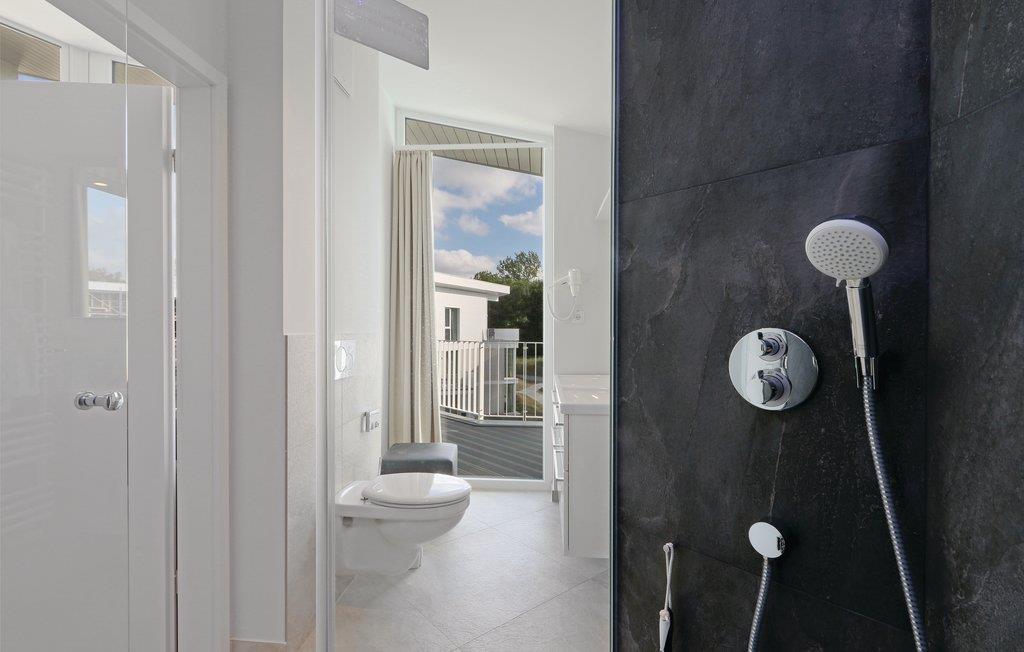 Badeværelset præsenterer sig som jeres helt eget wellnessområde med dampbad og dobbelt regnbruser.