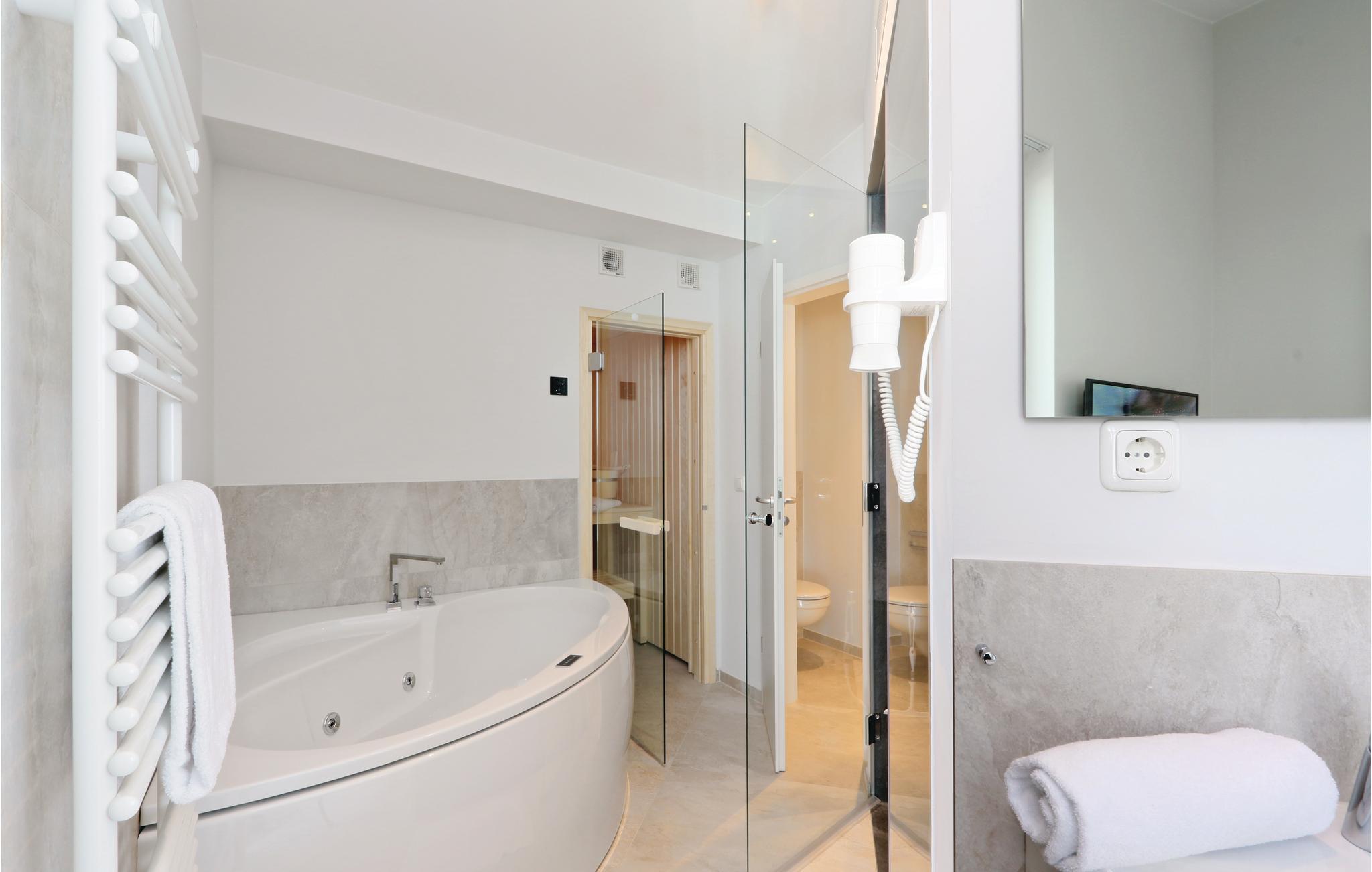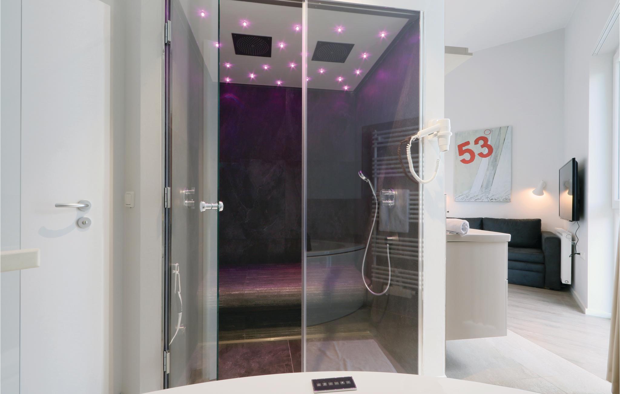 Det åbne badeværelse præsenterer sig som jeres helt eget wellnessområde med dampbad og dobbelt regnbruser. I kan også slappe af i whirlpoolen og svede igennem i saunaen.