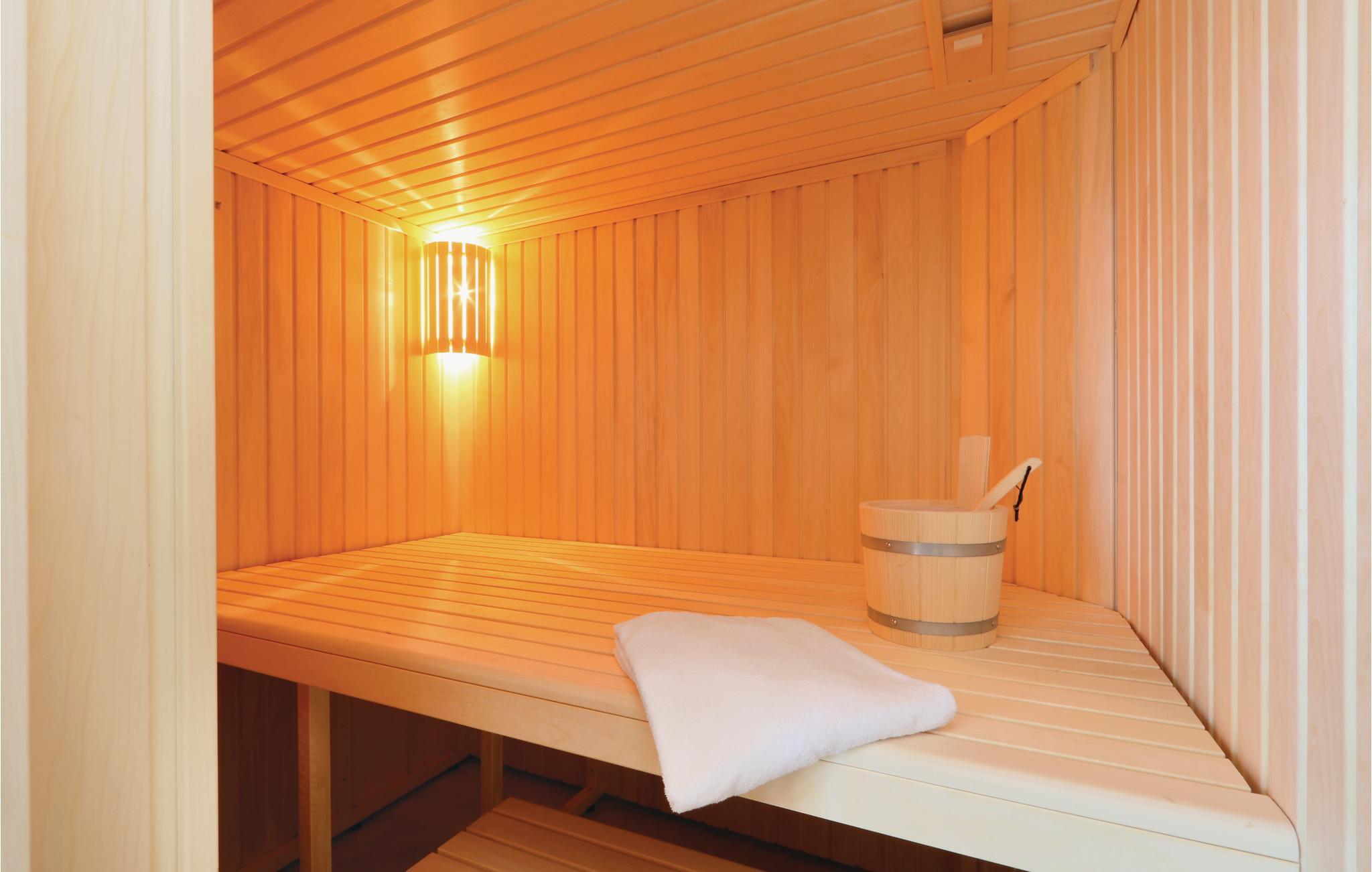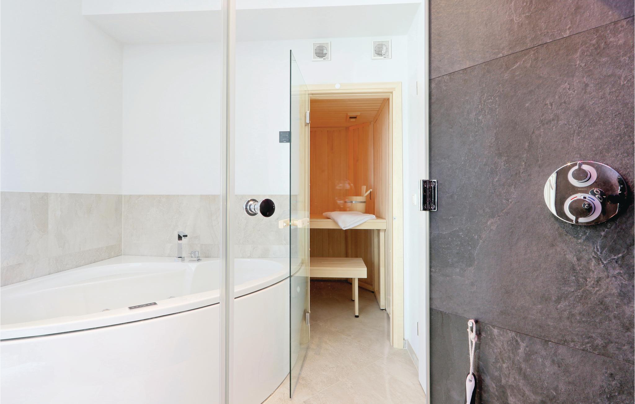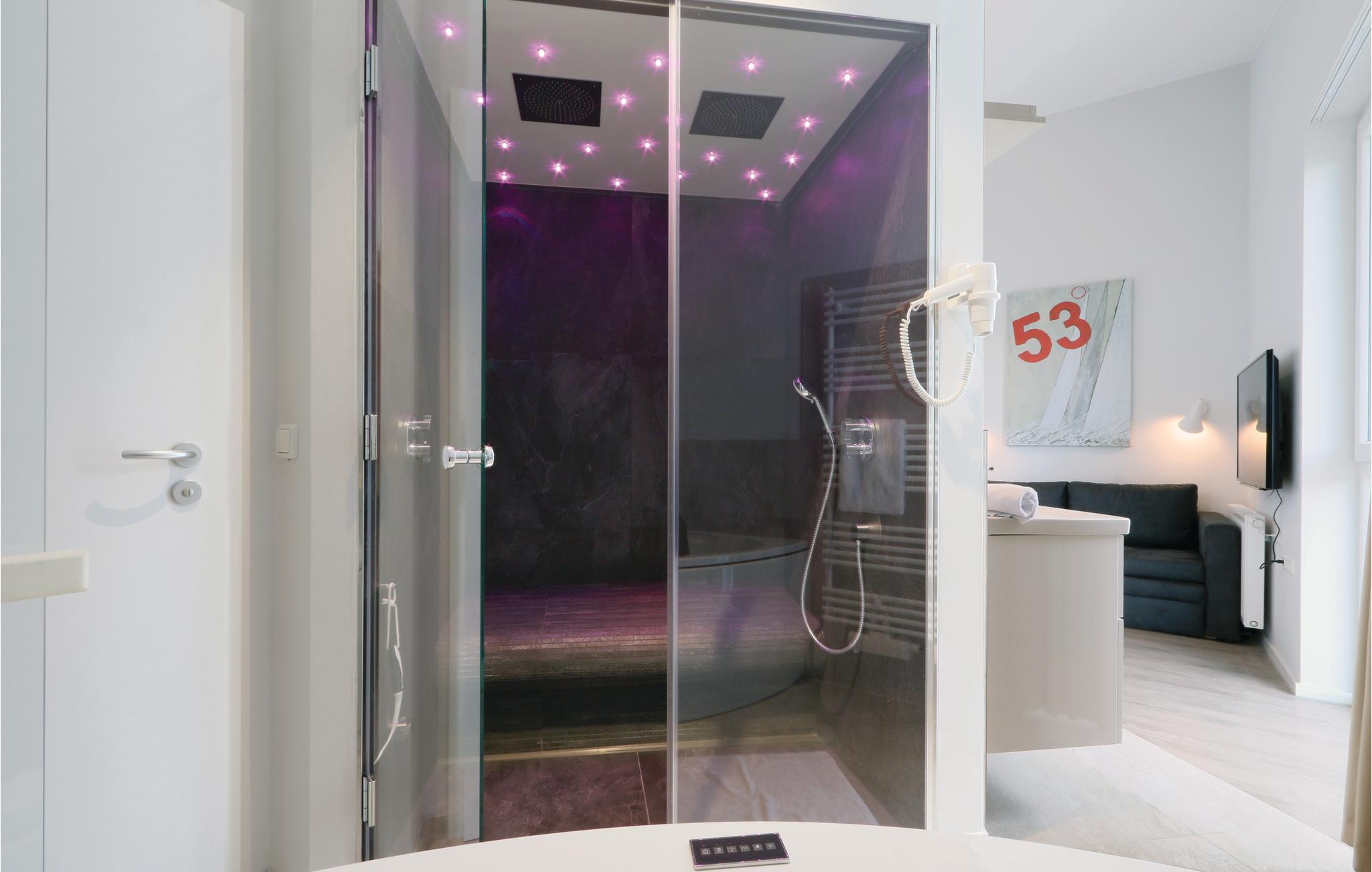 Det åbne badeværelse præsenterer sig som jeres helt eget wellnessområde med dampbad og dobbelt regnbruser. I kan også slappe af i whirlpoolen og svede igennem i saunaen.