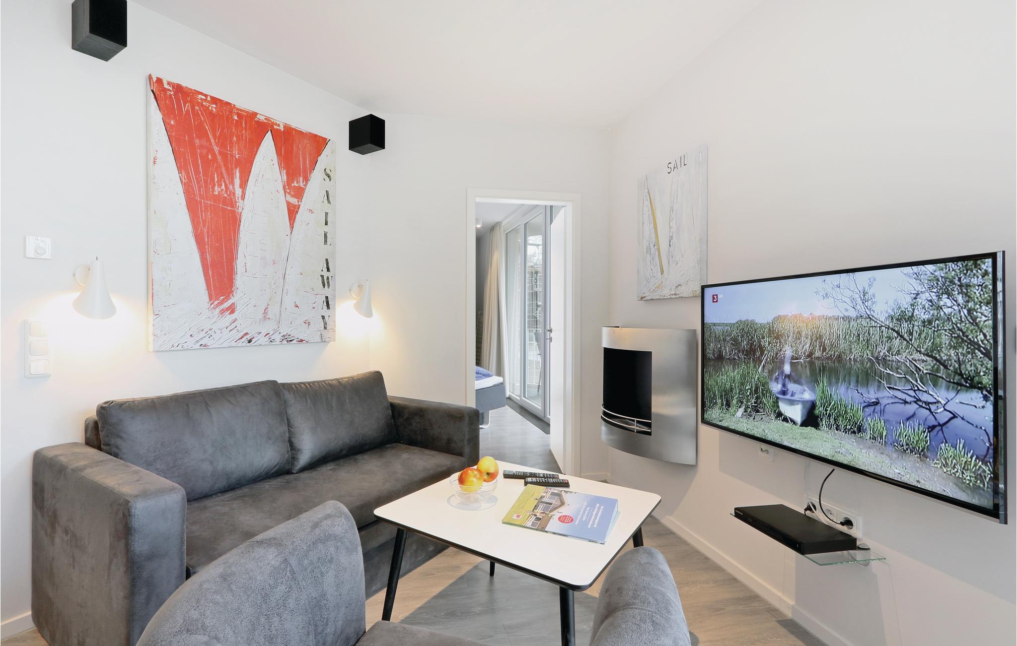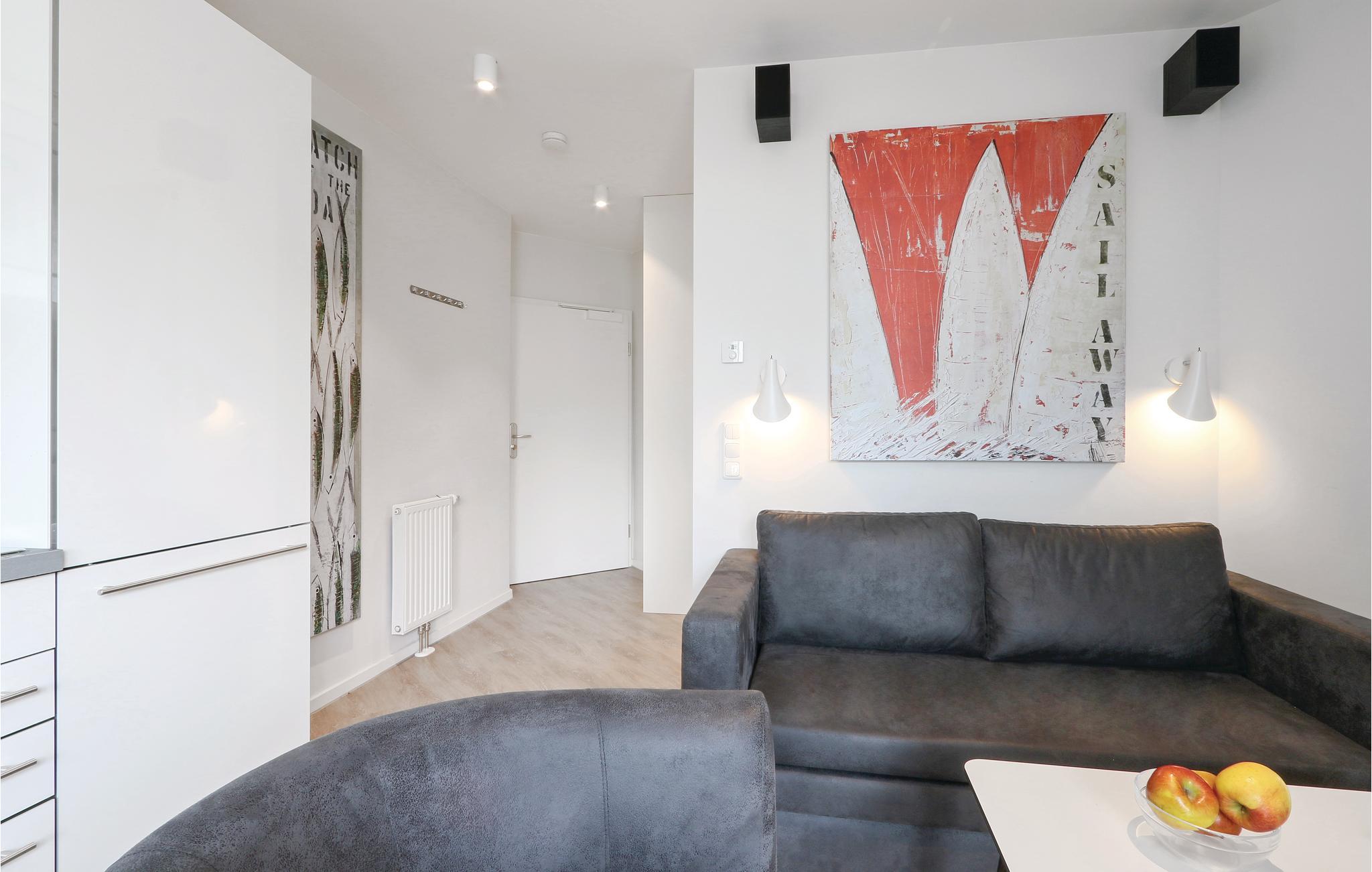 Den moderne indrettede ferielejlighed har rigelig plads til fire personer. Soveværelset har en fin dobbeltseng, og i opholdsstuen er der en sovesofa til to personer. Her er ligeledes en køkkenniche og en spiseplads. Efter en lang dag kan I hygge jer foran biokaminen, som bidrager til en hyggelig atmosfære i rummet. Altanerne kan nås enten fra soveværelset eller stuen. Her kan I sidde og spise jeres morgenmad eller bare nyde den friske Østersøluft.
