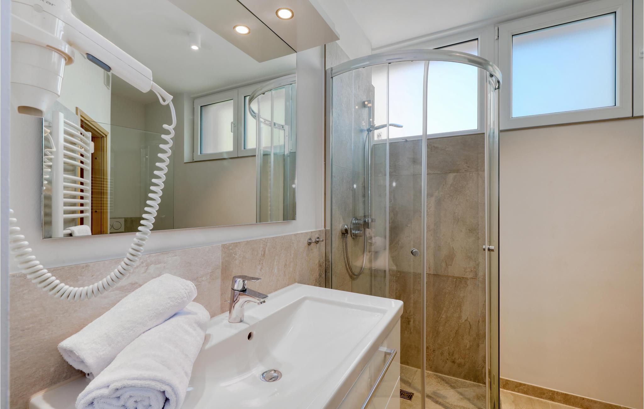 I det ene badeværelse er der en dobbelt regnvejrsbruser, dampbad og whirlpool. I det andet soveværelser er der sauna. Ninette Mathiessen, en lokal kunstner, har præget boligen med sine maritime malerier, hvor der optræder alt der har med hav og strand at gøre: sejlbåde, fisk, skaldyr mv.