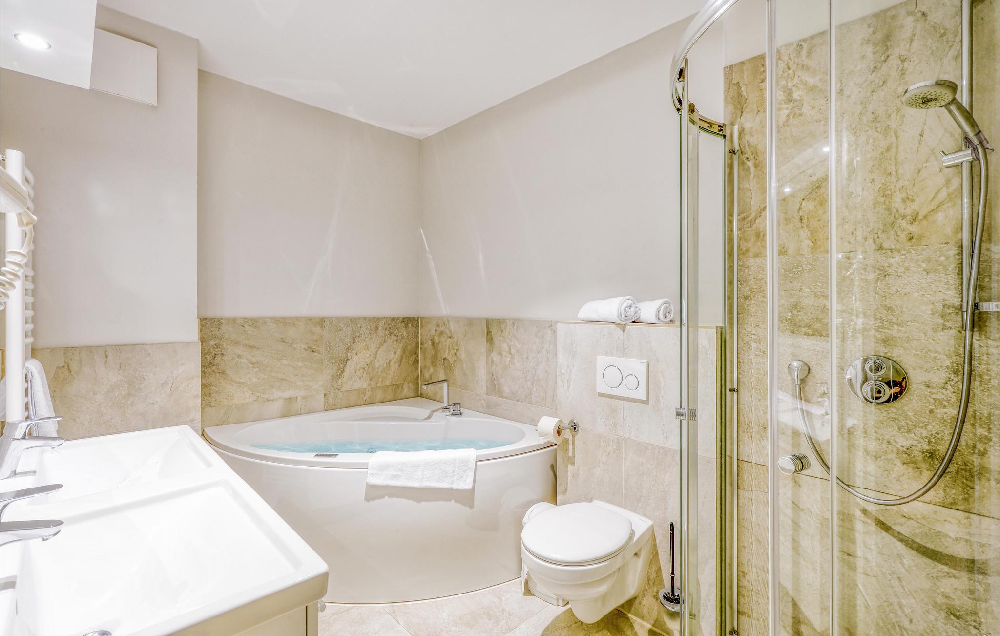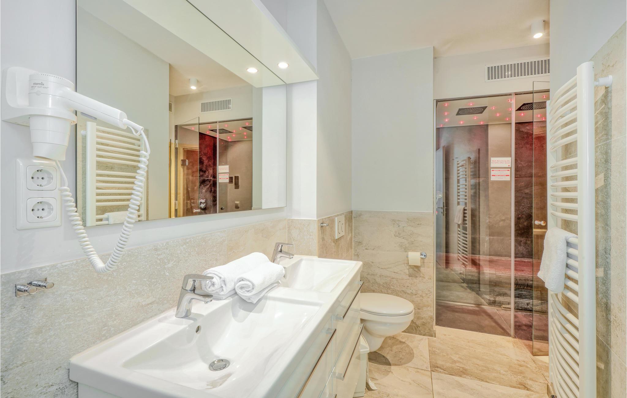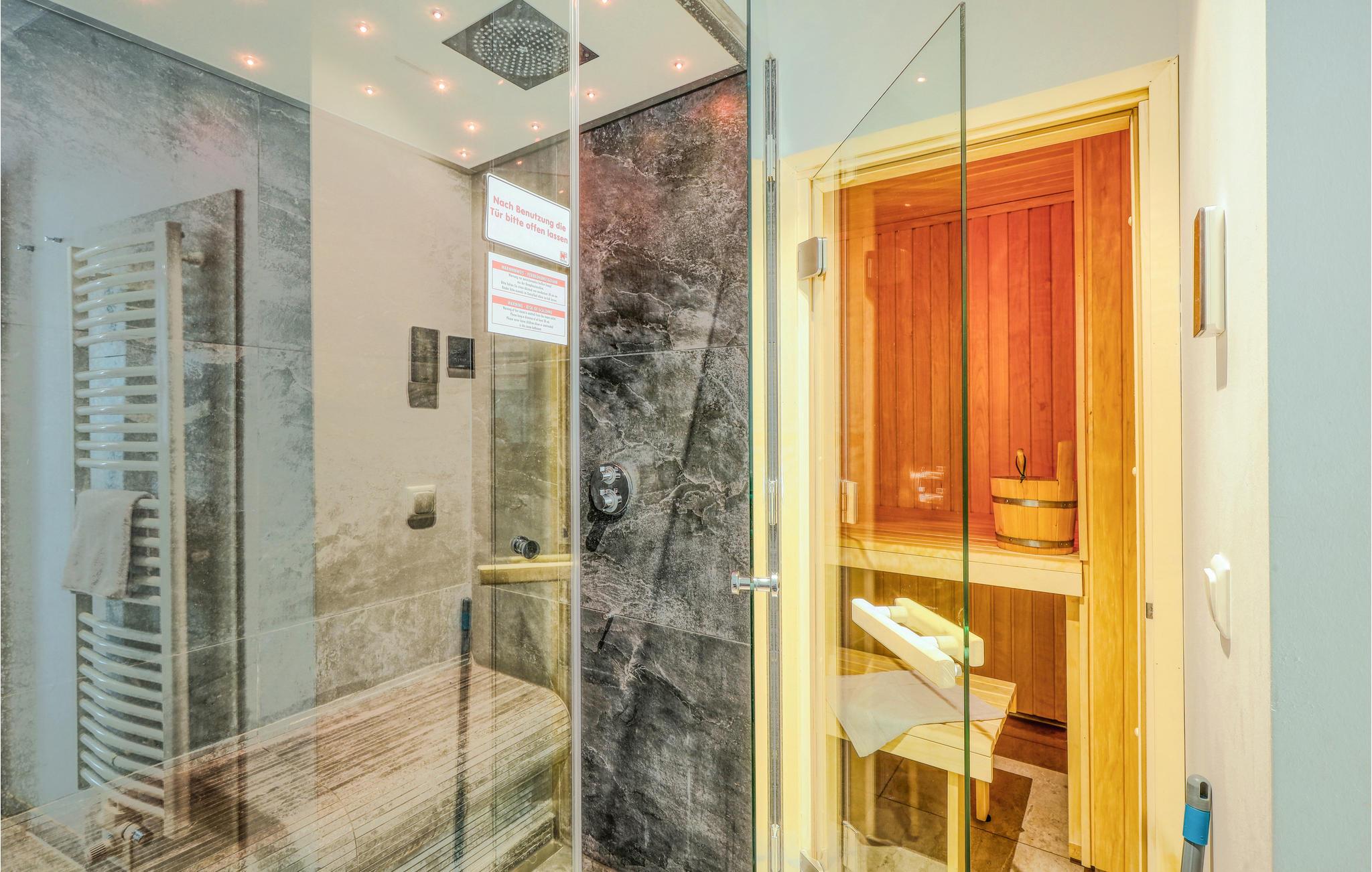 I det ene badeværelse er der en dobbelt regnvejrsbruser, dampbad og whirlpool. I det andet soveværelser er der sauna.