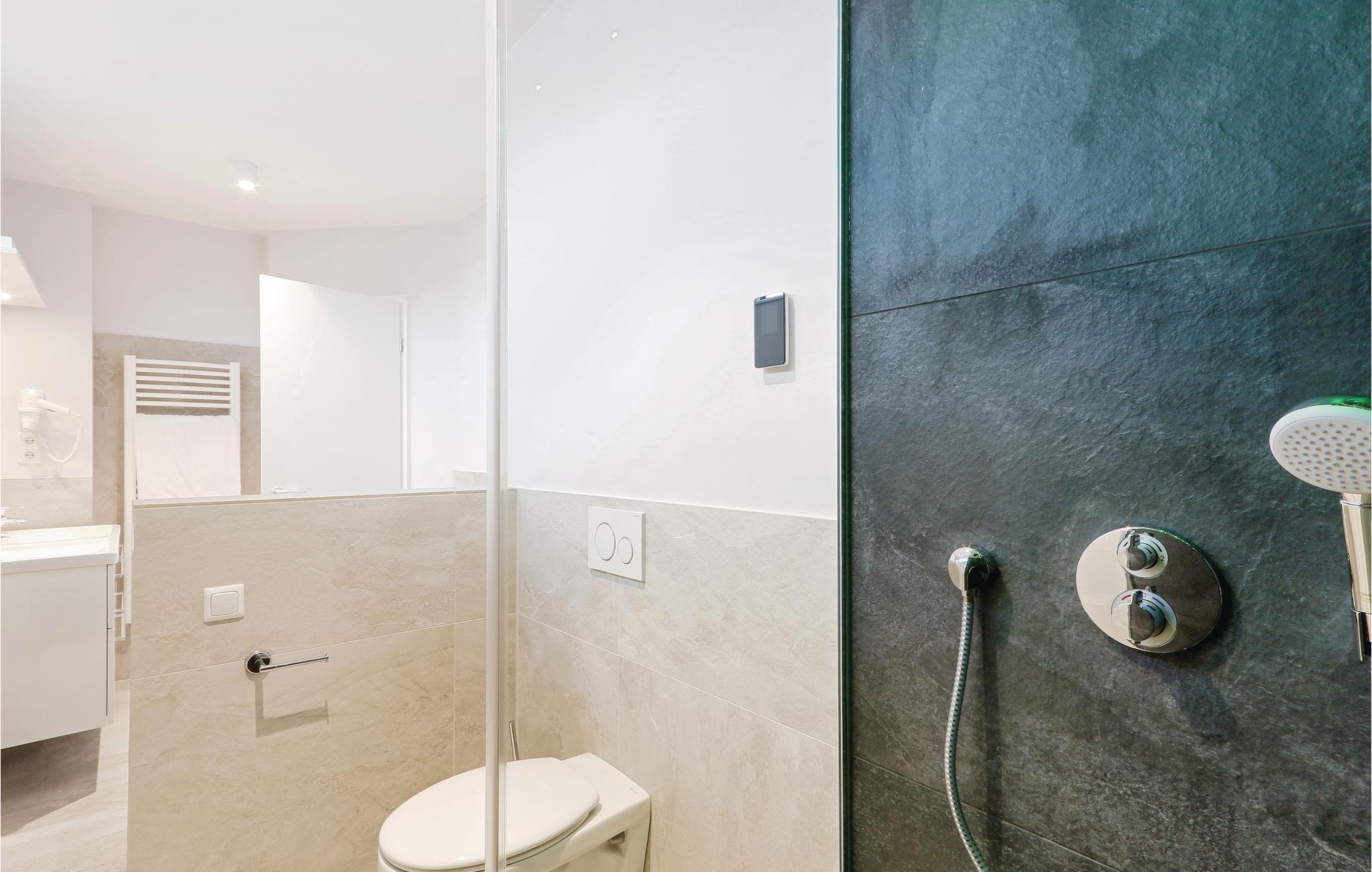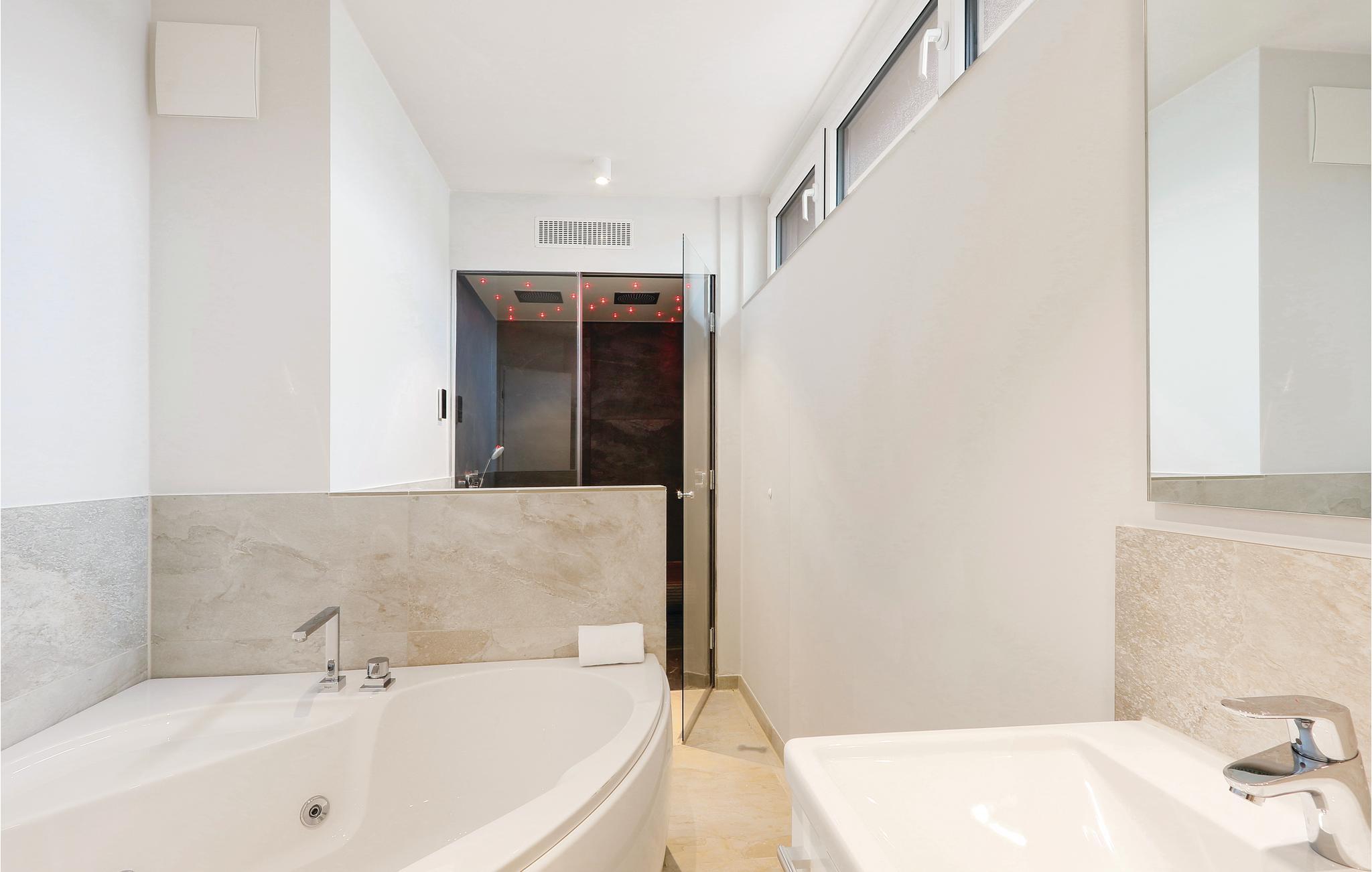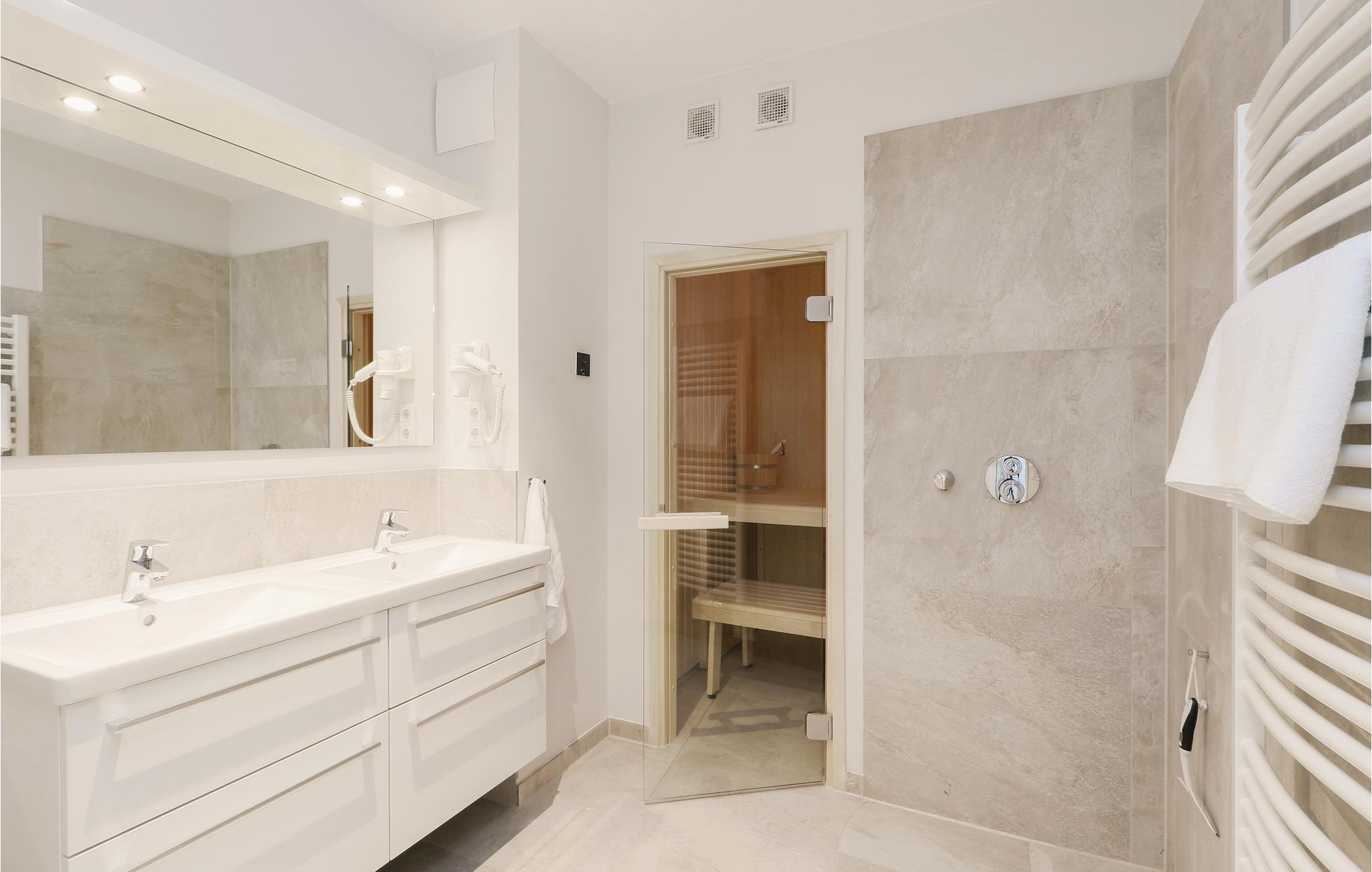 I det ene badeværelse er der en dobbelt regnvejrsbruser, dampbad og whirlpool. I det andet soveværelser er der sauna.