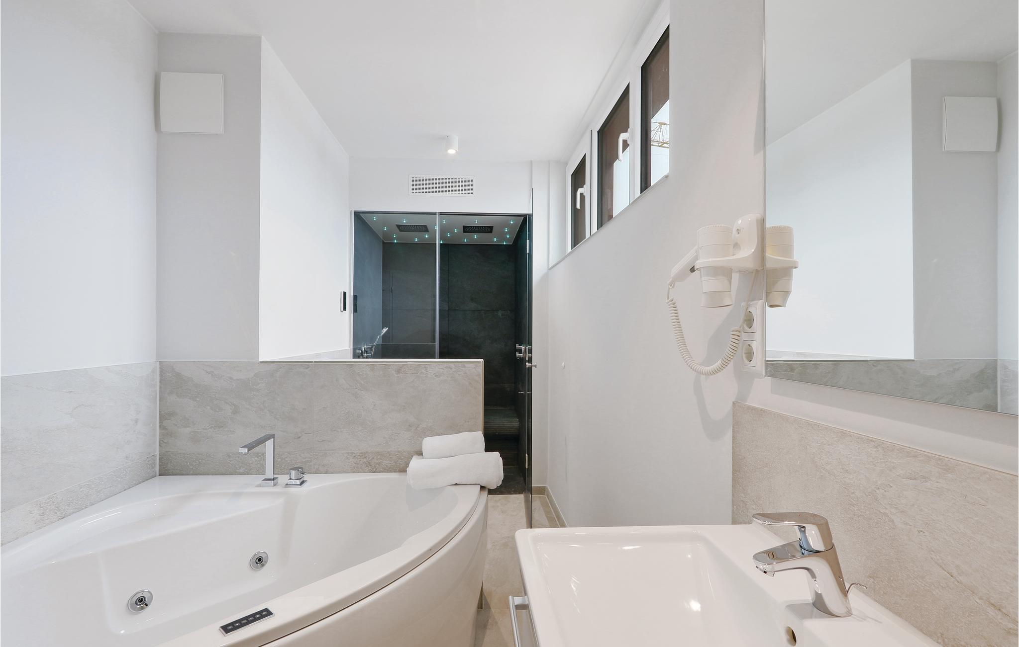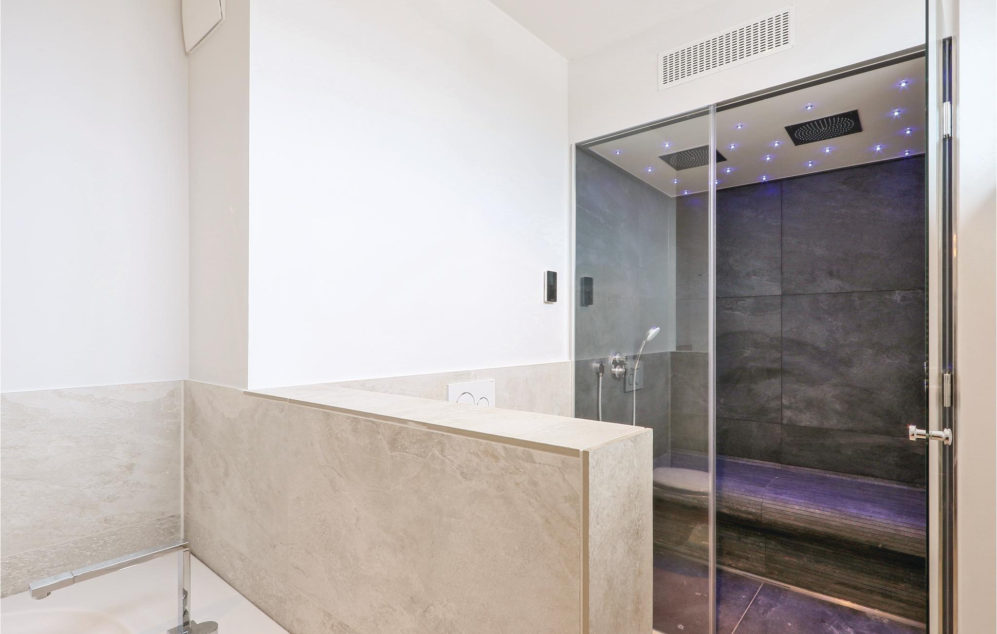 I det ene badeværelse er der en dobbelt regnvejrsbruser, dampbad og whirlpool. I det andet soveværelser er der sauna.