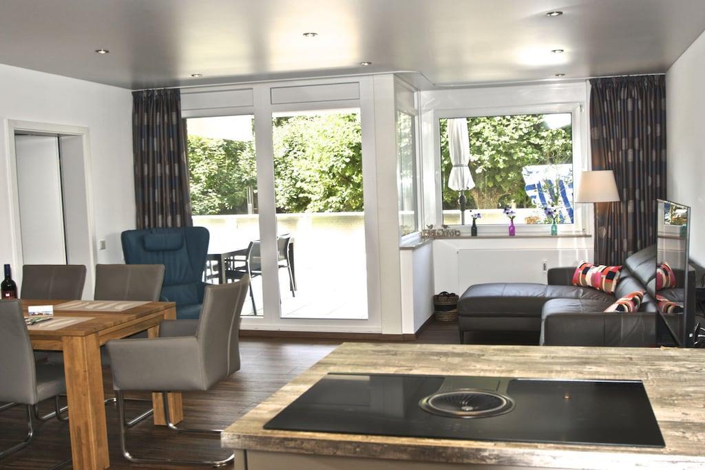 In Travemündes Prachtstraße – der Kaiserallee – finden Sie diese spektakuläre großzügige Wohnung mit 2 Zimmern in Villenlage - absolut ruhig und trotzdem zentral. Die Wohnung befindet sich im Erdgeschoss eines exklusiven Hauses direkt am Strand. Sie betreten die Wohnung über einen Flur mit Garderobe. Links befindet sich ein Gäste-WC in Naturstein. Geradeaus betreten Sie das große Wohn-/Esszimmer mit offener Designerküche. Die Küche ist mit Technik namhafter Hersteller u.a. Geschirrspüler, Induktions-Kochfeld mit Dunstabzug nach unten, Umluft Backofen, Dampfgarer, Mikrowelle, Kaffeemaschine, Wasserkocher, Toaster, Mixer, Saftpresse, Gewürzauswahl etc. ausgestattet. Vom Wohnbereich aus gelangen Sie auf die herrliche knapp 40m² große Terrasse mit überdachtem Freisitz. Hier laden moderne Geflecht Möbel, 2 Liegen und ein Strandkorb zu langen sonnigen Abenden. Das Schlafzimmer ist mit einem großzügigen Schrank und einem großen Doppelbett ausgestattet, von der Récamiere schauen Sie auf die Terrasse und die Kaiserallee. Vom Schlafzimmer gelangen Sie in Ihr Bad en Suite in Naturstein mit Glasdusche, großem Waschtisch und einem praktischen Waschtrockner. Die gesamte Wohnung ist mit einem Parkett-Fußboden ausgestattet, die Einrichtung ist exklusiv: 40-Zoll-Plasma-TV, hochwertige Möbel ….. Den Strand erreichen Sie über einen privaten Zugang / Garten.