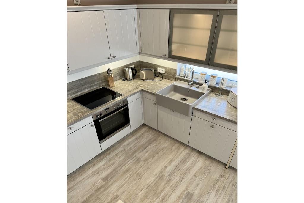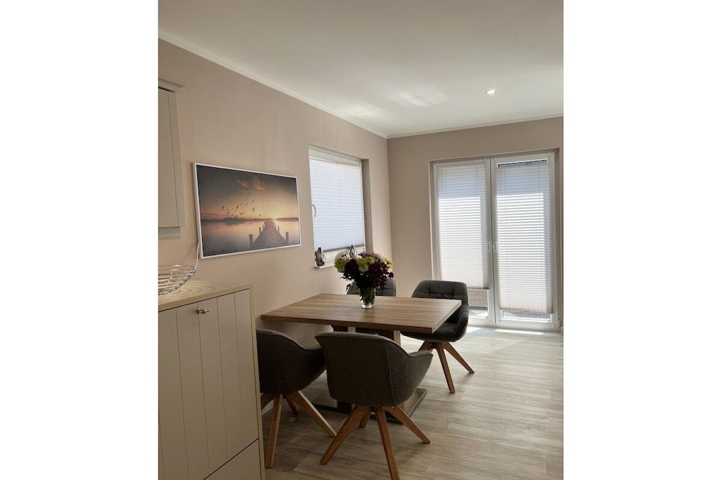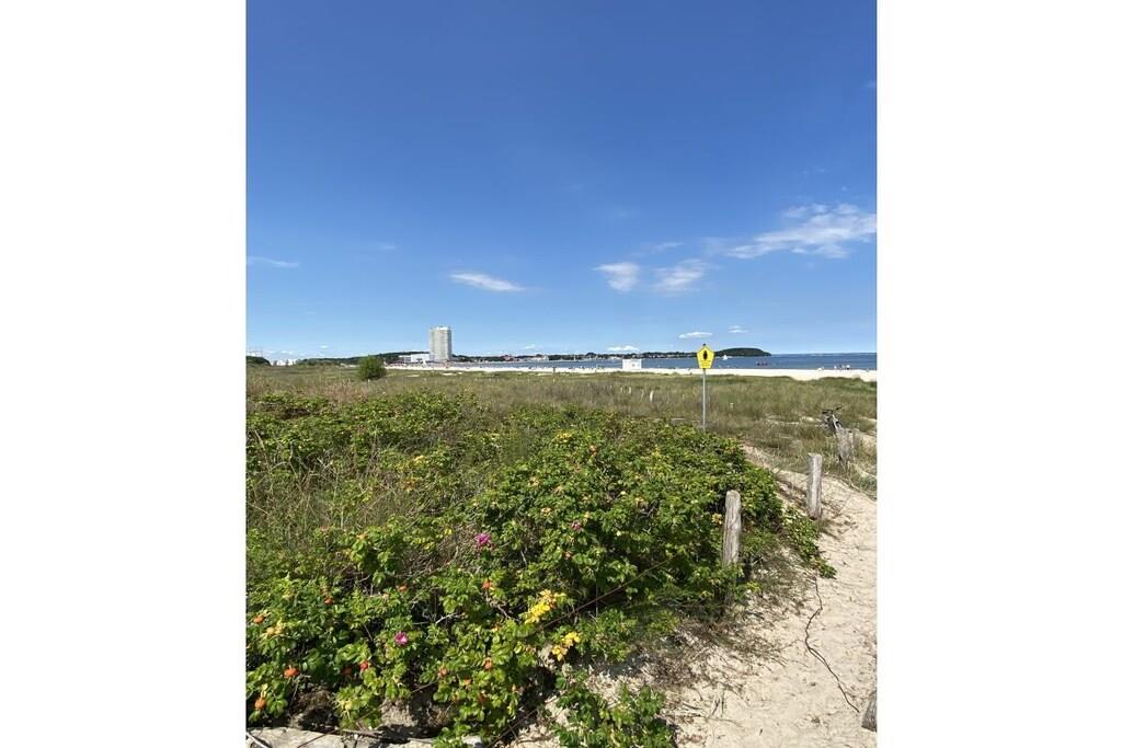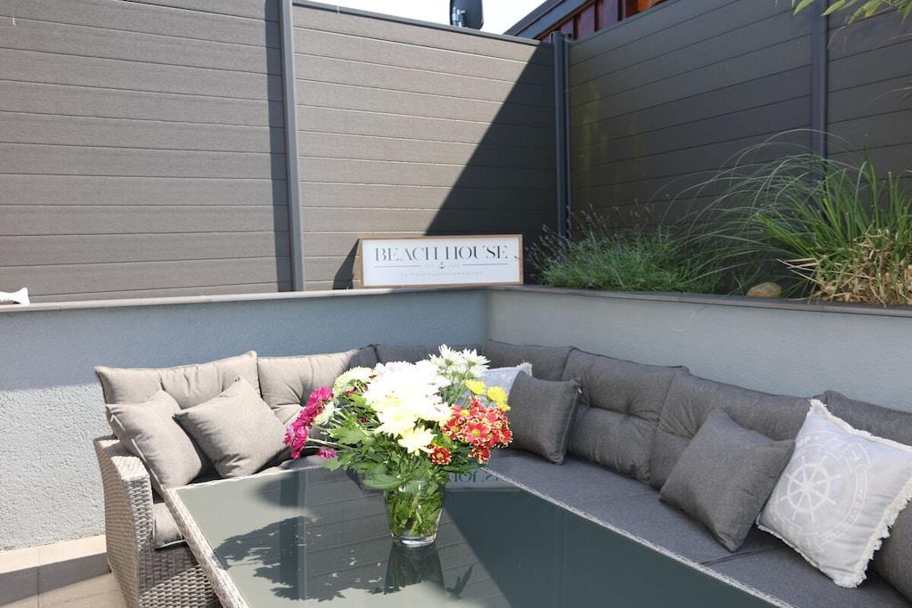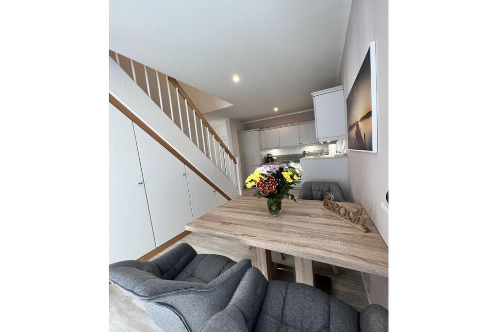 Sie betreten das 240 m² große eingezäunte Grundstück über das Doppelflügeltor – Strandhafer, Lavendel und Rosen umrahmen das gepflegte Objekt, das nach einem Eigentümerwechsel renoviert und vollständig neu möbliert wurde. Über die moderne Eingangstür mit Bullauge geht es in den kleinen Flur. Rechts befindet sich ein großzügiges Gäste-WC mit Waschtrockner. Links geht es in die offene moderne Küche mit Geschirrspülmaschine, Cerankochfeld, Backofen, Kühl-und Gefrierschrank und hochwertiger Ausstattung. Der offene Essbereich mit Holzesstisch und hellgrauen Loden/Holzstühlen ist durch die bodentiefen Fenster zur Terrasse lichtdurchflutet und im Winter durch einen Kaminofen zwischen dem Ess- und Wohnbereich kuschelig warm. Neben dem Essbereich schließt sich der Wohnbereich an, der auch vom Flur aus zugänglich ist. Ebenfalls mit bodentiefen Fenstern zur Terrasse gelegen hat man eher den Eindruck eines lichtdurchfluteten Wintergartens. Eine große graue Couch mit Schlaffunktion und Ottomane, viele Kissen und ein großer Flat Screen laden zu gemütlichen Abenden ein. Die vorgelagerte sehr große Terrasse verfügt über ein großes Ecksofa und einen modernen Hänge- bzw. Schaukelsessel. Ein Elektrogrill ist vorhanden und ebenso 2 Sonnenschirme und für die kleinen Gäste eine Kindersitzecke. Von der Terrasse oder auch über den Eingang gelangt man dann zur Liegewiese mit einem kleinen Gartenhäuschen. Vom Flur aus führt eine gerade gut zu begehende Treppe in den oberen Flur mit großem Einbauschrank. Rechts geht es in das Doppelschlafzimmer mit Bad en Suite. Das breite graue Boxspringbett und die weißen Kommoden sowie ein Flat TV laden zu gutem Schlaf ein. Das direkt vom Schlafzimmer zu betretende Badezimmer verfügt über eine Badewanne und ein separate Glasdusche. Vom Flur aus links geht es in das 2. Schlafzimmer mit 2 weissen Einzelbetten auch ideal als Kinderzimmer zu nutzen. Zwischen dem Bad und dem 2. Schlafzimmer liegt ein kleiner kuscheliger Raum mit zwei Sesseln und Tischchen für gemütliche Abende oder ein kleines Frühstück mit direktem Ostseeblick ! Das Haus ist mit seinem Farbkonzept weiss-grau-beige-anthrazit angenehm ruhig und modern ausgestattet, maritime Dekorationselemente vermitteln das Gefühl „Urlaub am Meer“. Im Seeweg und den umliegende Straßen herrscht Fahrverbot, nur zum Be- und Entladen dürfen hier PKWs genutzt werden. Das Beachhouse verfügt über einen eigenen festen Parkplatz auf dem Priwallhauptparkplatz (ca. 300 Meter) und Sie erhalten einen Schrankenschlüssel zum Be-und Entladen.