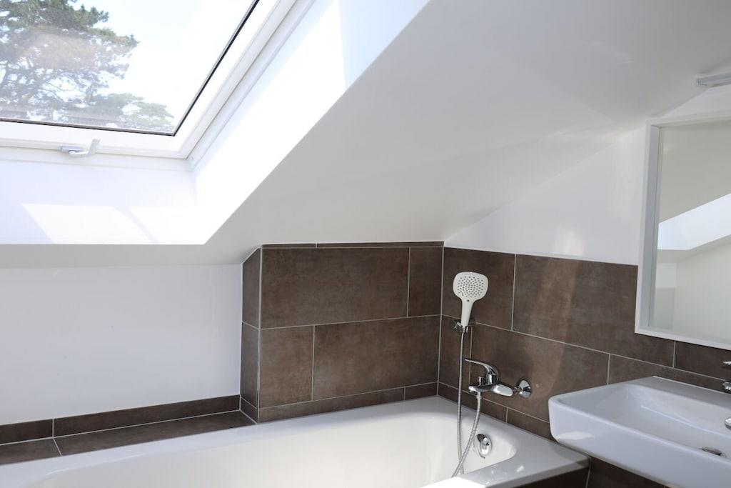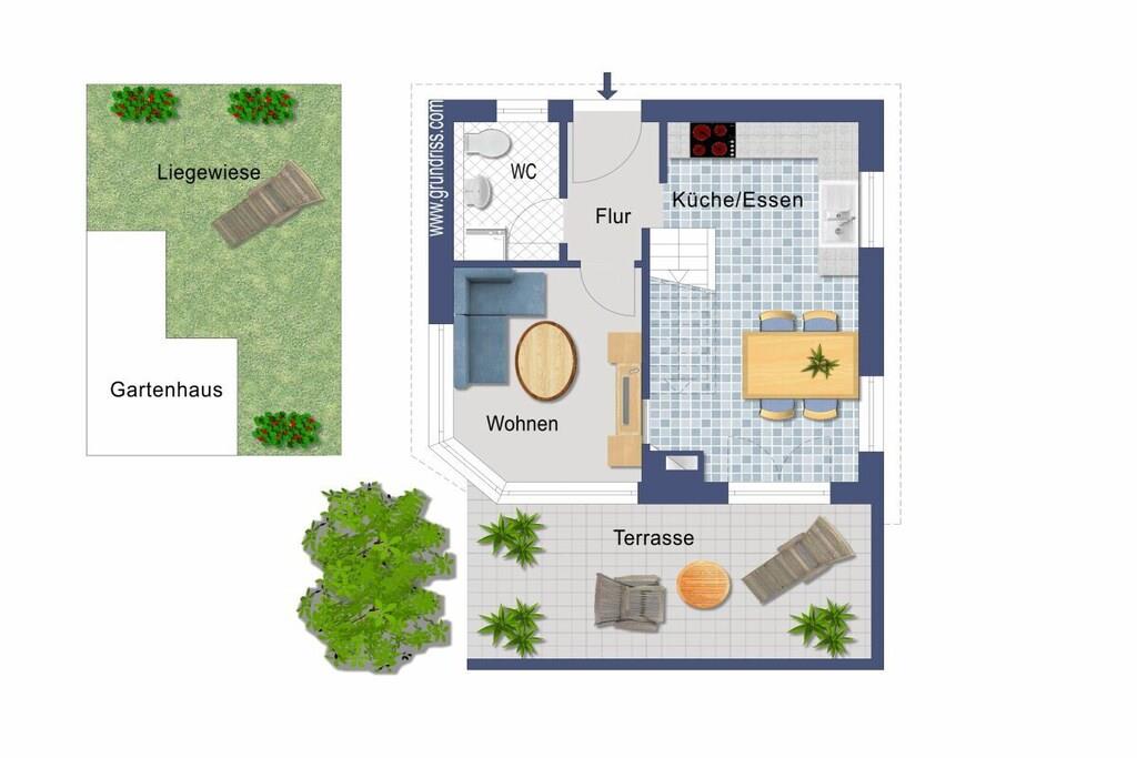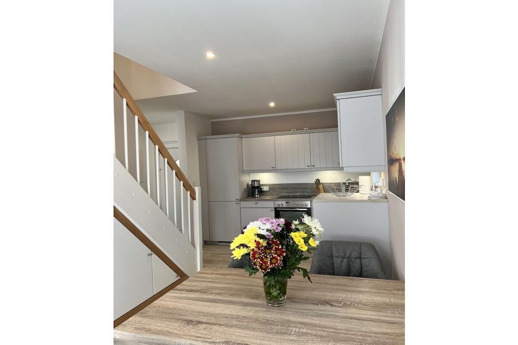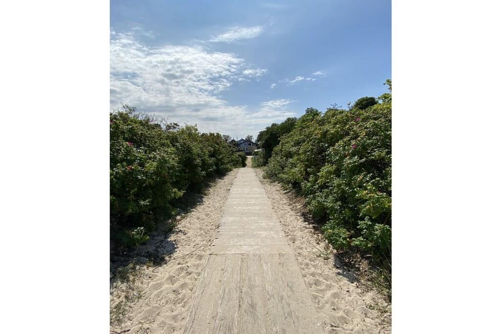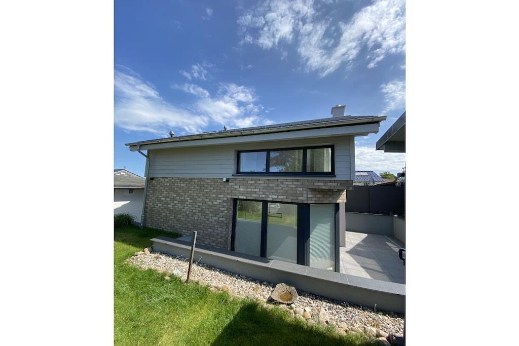 Sie betreten das 240 m² große eingezäunte Grundstück über das Doppelflügeltor – Strandhafer, Lavendel und Rosen umrahmen das gepflegte Objekt, das nach einem Eigentümerwechsel renoviert und vollständig neu möbliert wurde. Über die moderne Eingangstür mit Bullauge geht es in den kleinen Flur. Rechts befindet sich ein großzügiges Gäste-WC mit Waschtrockner. Links geht es in die offene moderne Küche mit Geschirrspülmaschine, Cerankochfeld, Backofen, Kühl-und Gefrierschrank und hochwertiger Ausstattung. Der offene Essbereich mit Holzesstisch und hellgrauen Loden/Holzstühlen ist durch die bodentiefen Fenster zur Terrasse lichtdurchflutet und im Winter durch einen Kaminofen zwischen dem Ess- und Wohnbereich kuschelig warm. Neben dem Essbereich schließt sich der Wohnbereich an, der auch vom Flur aus zugänglich ist. Ebenfalls mit bodentiefen Fenstern zur Terrasse gelegen hat man eher den Eindruck eines lichtdurchfluteten Wintergartens. Eine große graue Couch mit Schlaffunktion und Ottomane, viele Kissen und ein großer Flat Screen laden zu gemütlichen Abenden ein. Die vorgelagerte sehr große Terrasse verfügt über ein großes Ecksofa und einen modernen Hänge- bzw. Schaukelsessel. Ein Elektrogrill ist vorhanden und ebenso 2 Sonnenschirme und für die kleinen Gäste eine Kindersitzecke. Von der Terrasse oder auch über den Eingang gelangt man dann zur Liegewiese mit einem kleinen Gartenhäuschen. Vom Flur aus führt eine gerade gut zu begehende Treppe in den oberen Flur mit großem Einbauschrank. Rechts geht es in das Doppelschlafzimmer mit Bad en Suite. Das breite graue Boxspringbett und die weißen Kommoden sowie ein Flat TV laden zu gutem Schlaf ein. Das direkt vom Schlafzimmer zu betretende Badezimmer verfügt über eine Badewanne und ein separate Glasdusche. Vom Flur aus links geht es in das 2. Schlafzimmer mit 2 weissen Einzelbetten auch ideal als Kinderzimmer zu nutzen. Zwischen dem Bad und dem 2. Schlafzimmer liegt ein kleiner kuscheliger Raum mit zwei Sesseln und Tischchen für gemütliche Abende oder ein kleines Frühstück mit direktem Ostseeblick ! Das Haus ist mit seinem Farbkonzept weiss-grau-beige-anthrazit angenehm ruhig und modern ausgestattet, maritime Dekorationselemente vermitteln das Gefühl „Urlaub am Meer“. Im Seeweg und den umliegende Straßen herrscht Fahrverbot, nur zum Be- und Entladen dürfen hier PKWs genutzt werden. Das Beachhouse verfügt über einen eigenen festen Parkplatz auf dem Priwallhauptparkplatz (ca. 300 Meter) und Sie erhalten einen Schrankenschlüssel zum Be-und Entladen.