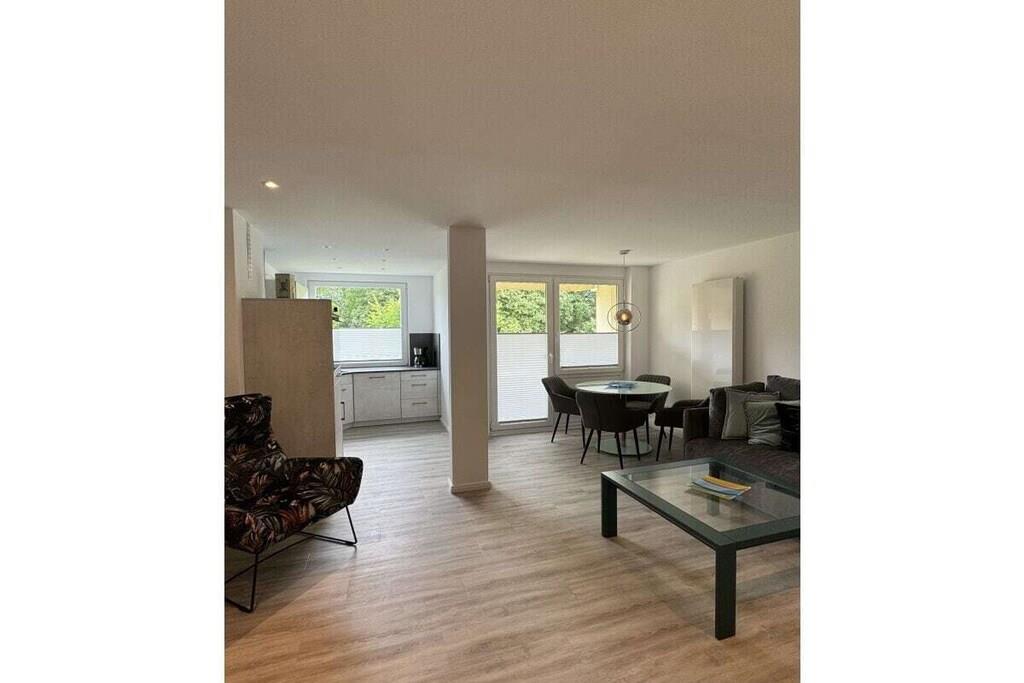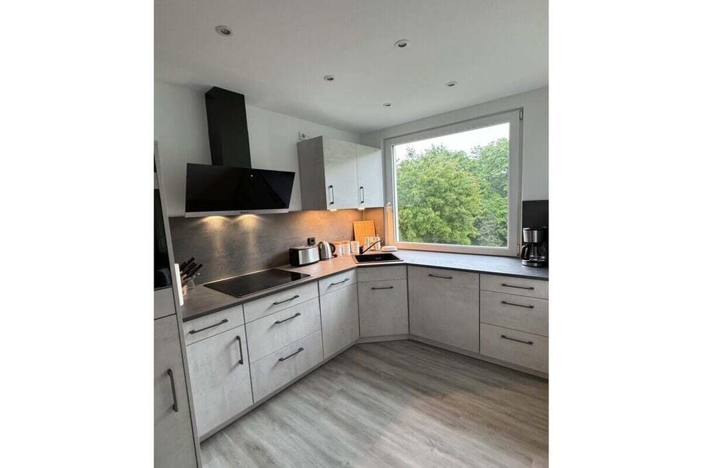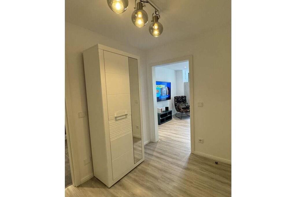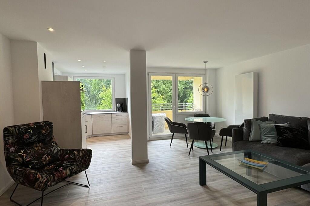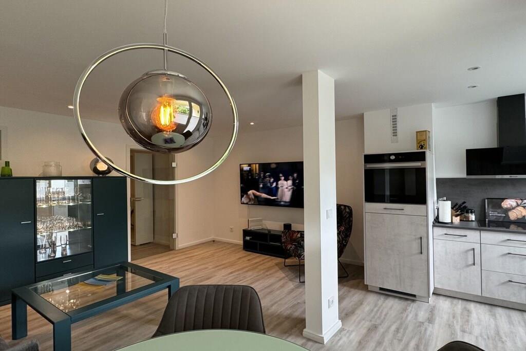Sie betreten das Objekt über einen gepflegten Hausflur mit Fahrstuhl. Die Wohnung befindet sich im 1. OG. Über einen großzügigen Flur mit Garderobe, Schuhschrank und Spiegel gelangen Sie rechter Hand in das Schlafzimmer. Ein 1,80m großes Boxspringbett, 2 Nachtkonsolen und ein großer Schiebeschrank - alles in weiß mit beige sehr hell gestaltet - erwarten Sie. Linker Hand befindet sich das Badezimmer mit Aufsatzwaschbecken, Regal, Spiegelschrank, Hänge-WC und extra großer Glasdusche und Handtuchwärmer in trendigem anthrazit mit weiß. Vom Flur aus geradeaus befindet sich das helle Wohn-Esszimmer mit offener Designerküche, die neben einer Kühl-Gefrierkombi, Ceran-Kochfeld mit Dunstabzugshaube und einem Backofen in praktischer Augenhöhe sowohl eine Spülmaschine als auch einen Waschtrockner bietet. Elektrogeräte (Toaster, Kaffeemaschine, Wasserkocher etc.), Geschirr und Gläser, Topf- und Pfannenset und viele andere Küchenutensilien sind alle von namhaften Herstellern (u.a. WMF, Siemens, Schott etc.) und wie die gesamte Einrichtung neu. Die Farben grau, weiß und türkis geben eine wohnliche Atmosphäre. Vor dem Essbereich befindet sich ein schöner Balkon mit Blick ins Grüne. Hier laden moderne Geflechtmöbel (2 Sessel & Tisch) zum Sun-Downer oder Sommerfrühstück ein.