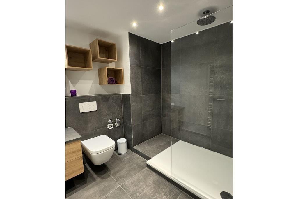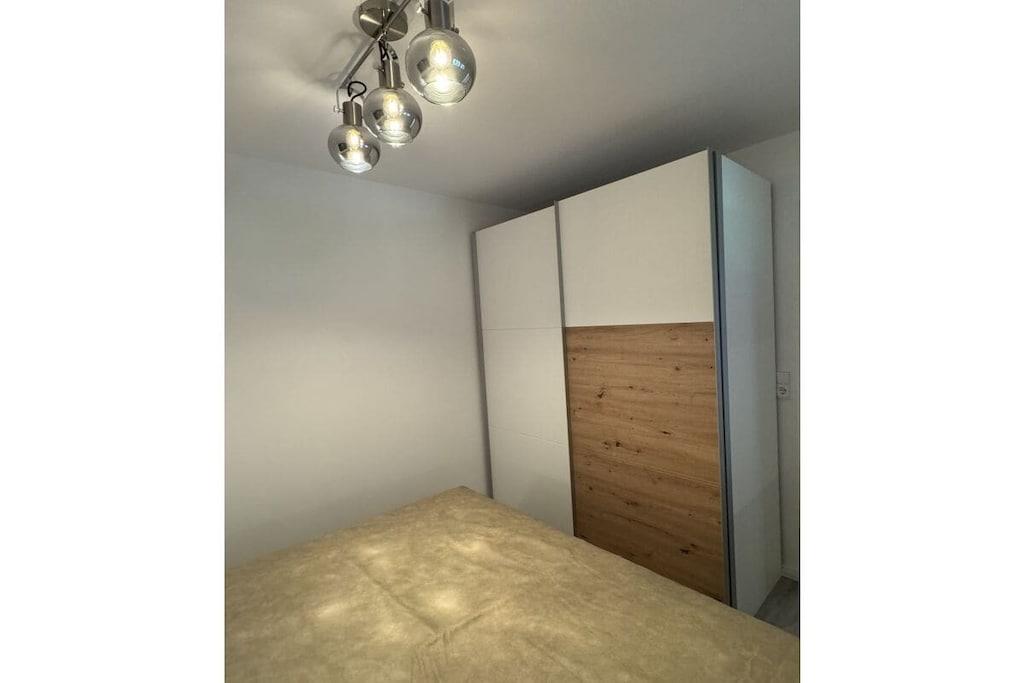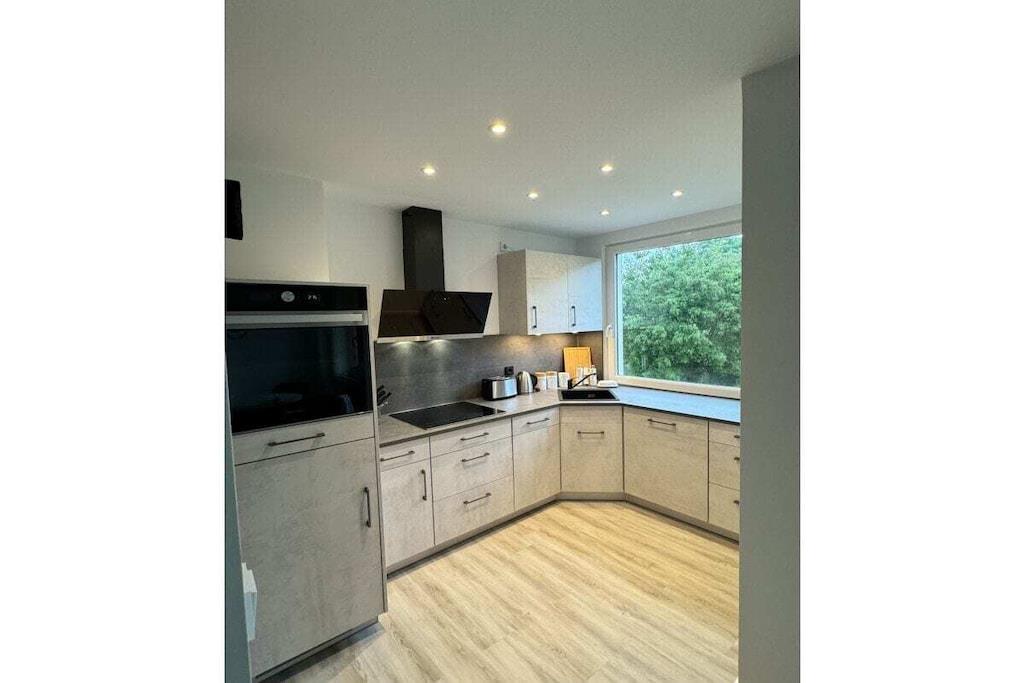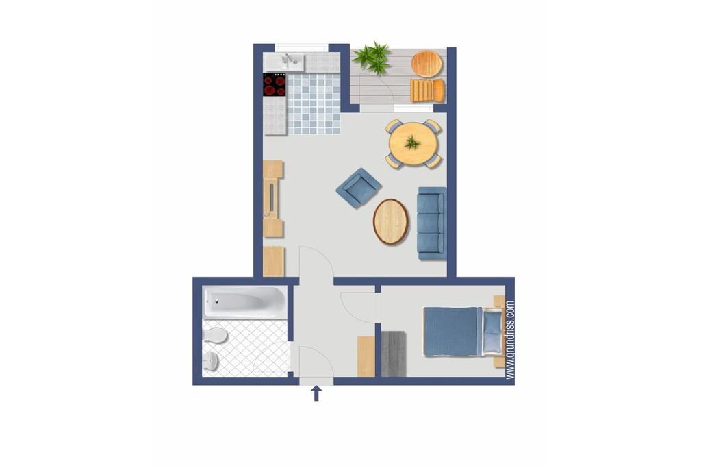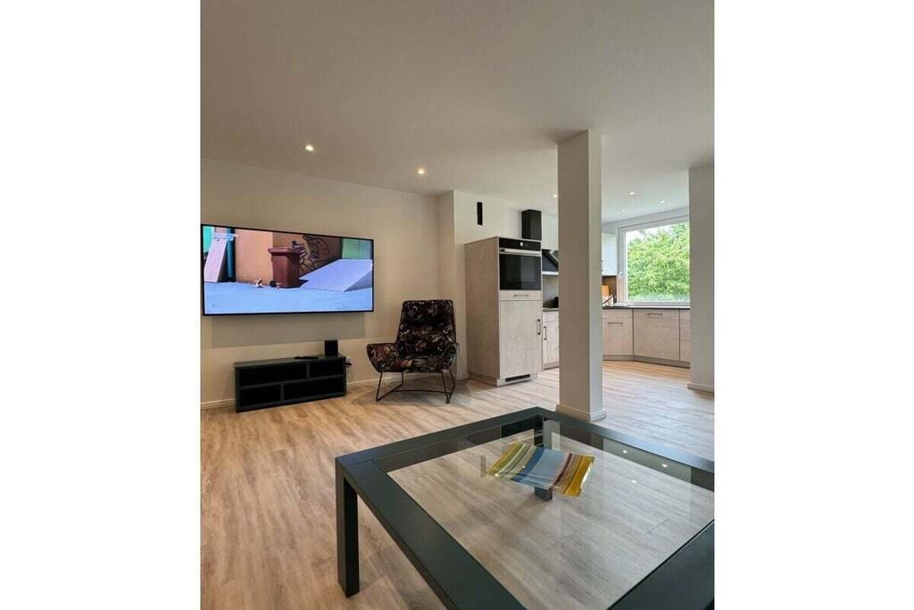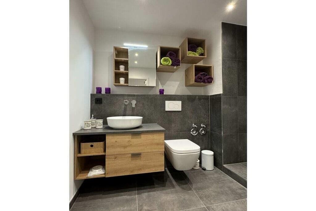 Sie betreten das Objekt über einen gepflegten Hausflur mit Fahrstuhl. Die Wohnung befindet sich im 1. OG. Über einen großzügigen Flur mit Garderobe, Schuhschrank und Spiegel gelangen Sie rechter Hand in das Schlafzimmer. Ein 1,80m großes Boxspringbett, 2 Nachtkonsolen und ein großer Schiebeschrank - alles in weiß mit beige sehr hell gestaltet - erwarten Sie. Linker Hand befindet sich das Badezimmer mit Aufsatzwaschbecken, Regal, Spiegelschrank, Hänge-WC und extra großer Glasdusche und Handtuchwärmer in trendigem anthrazit mit weiß. Vom Flur aus geradeaus befindet sich das helle Wohn-Esszimmer mit offener Designerküche, die neben einer Kühl-Gefrierkombi, Ceran-Kochfeld mit Dunstabzugshaube und einem Backofen in praktischer Augenhöhe sowohl eine Spülmaschine als auch einen Waschtrockner bietet. Elektrogeräte (Toaster, Kaffeemaschine, Wasserkocher etc.), Geschirr und Gläser, Topf- und Pfannenset und viele andere Küchenutensilien sind alle von namhaften Herstellern (u.a. WMF, Siemens, Schott etc.) und wie die gesamte Einrichtung neu. Die Farben grau, weiß und türkis geben eine wohnliche Atmosphäre. Vor dem Essbereich befindet sich ein schöner Balkon mit Blick ins Grüne. Hier laden moderne Geflechtmöbel (2 Sessel & Tisch) zum Sun-Downer oder Sommerfrühstück ein.
