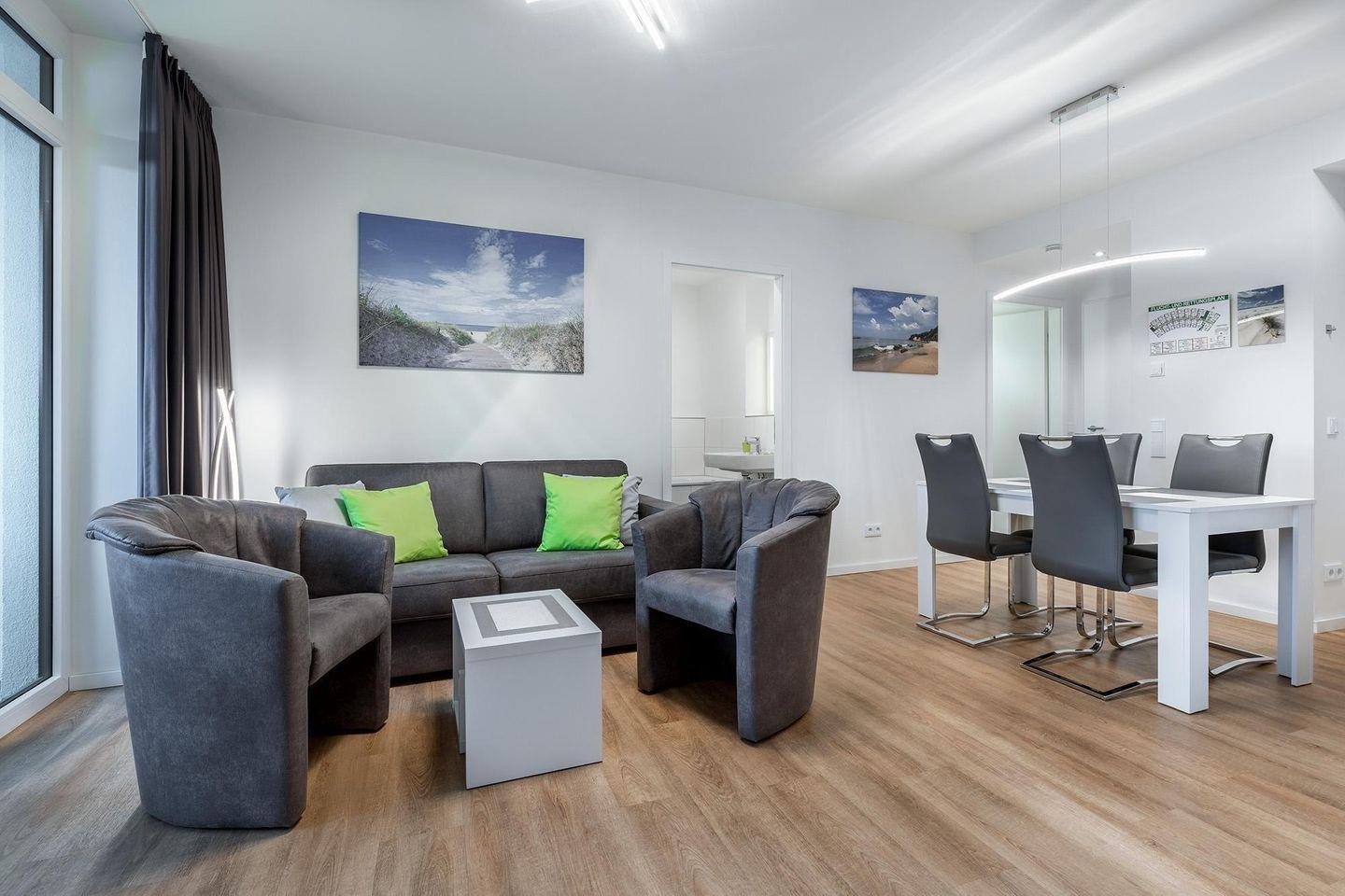 Das helle und stilvoll eingerichtete Nichtraucher-Apartment besticht durch sonnenschutzverglaste, teilweise bodentiefe Fenster, Fußbodenheizung in allen Räumen und kostenfreies WLAN. Der gemütliche Wohnbereich lädt mit einer komfortablen Doppelschlafcouch und einem großen SMART-TV zum Entspannen ein.