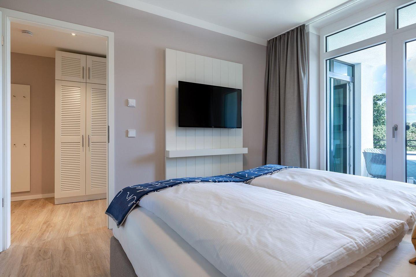 Im separaten Schlafzimmer genießen Sie hohen Schlafkomfort durch ein großes Boxspringbett. Auch hier steht Ihnen ein Flatscreen-TV zur Verfügung – ideal für ruhige Stunden zu zweit.
