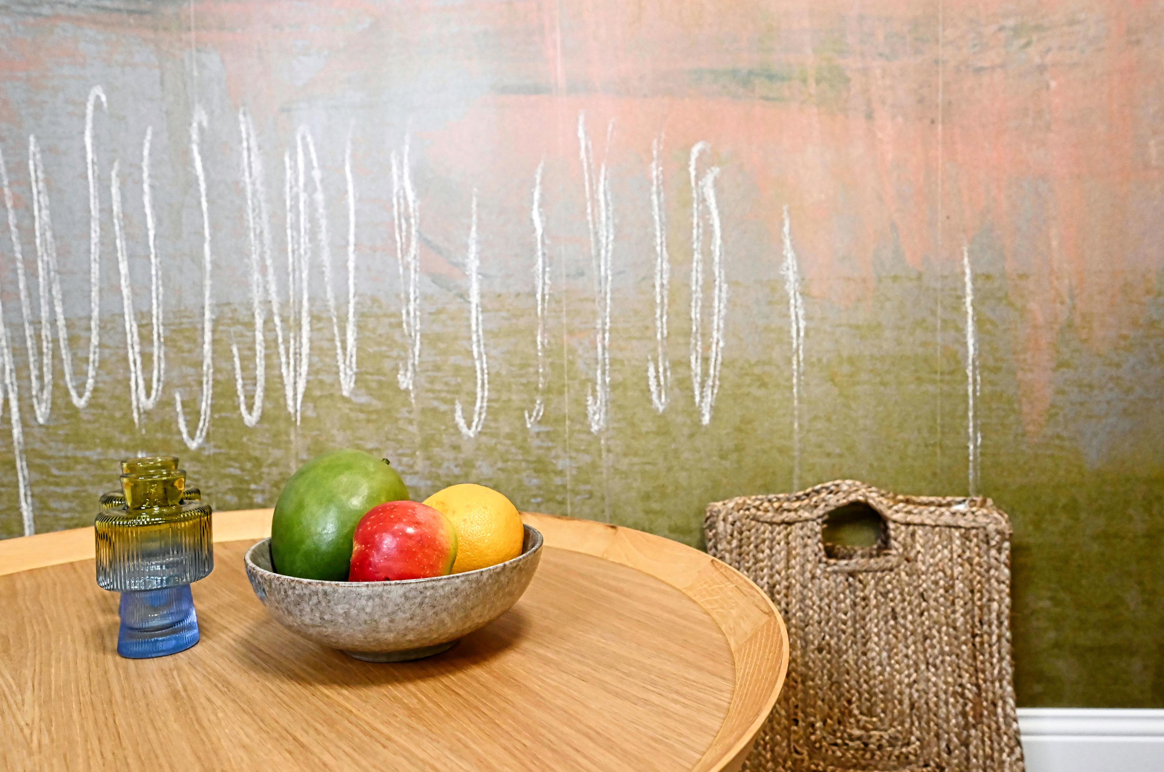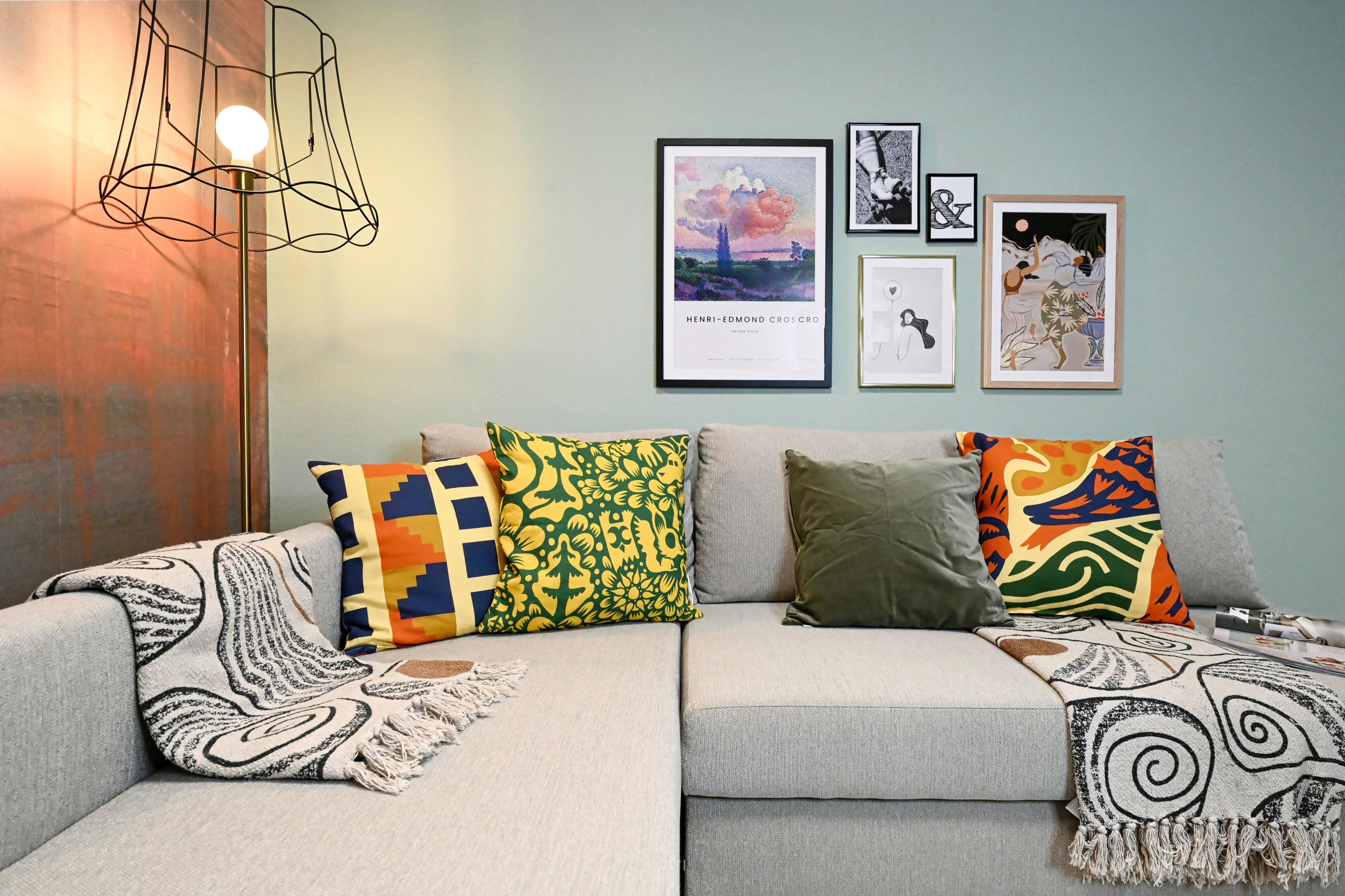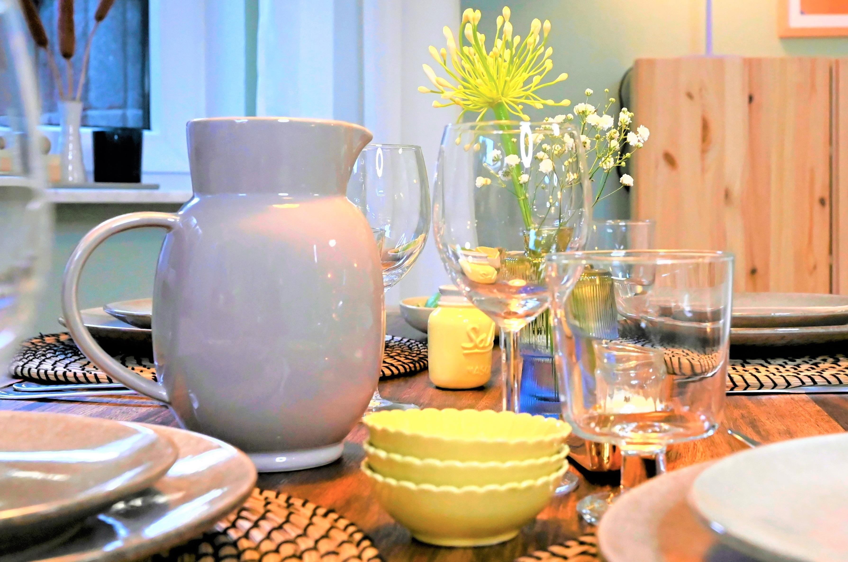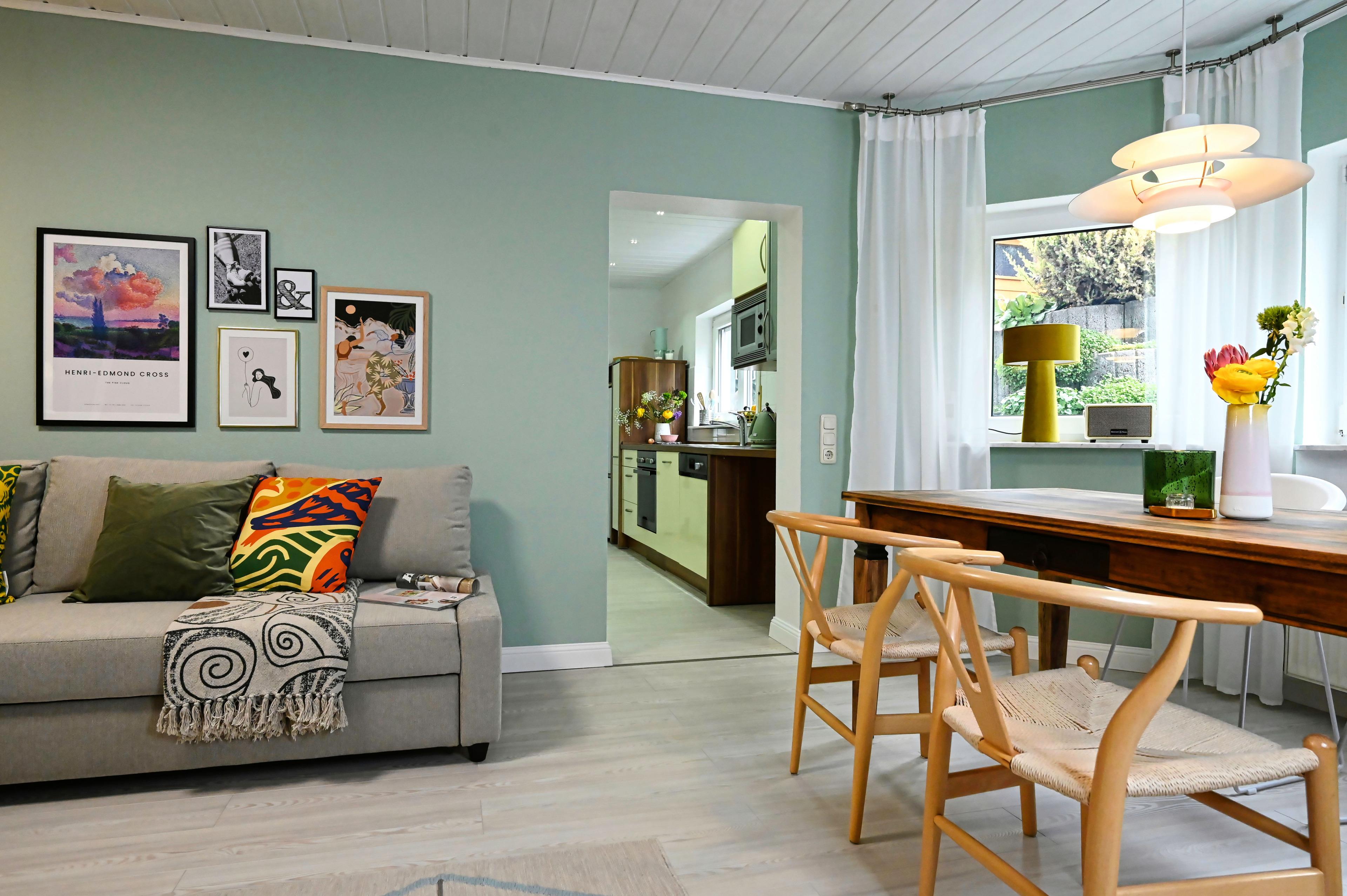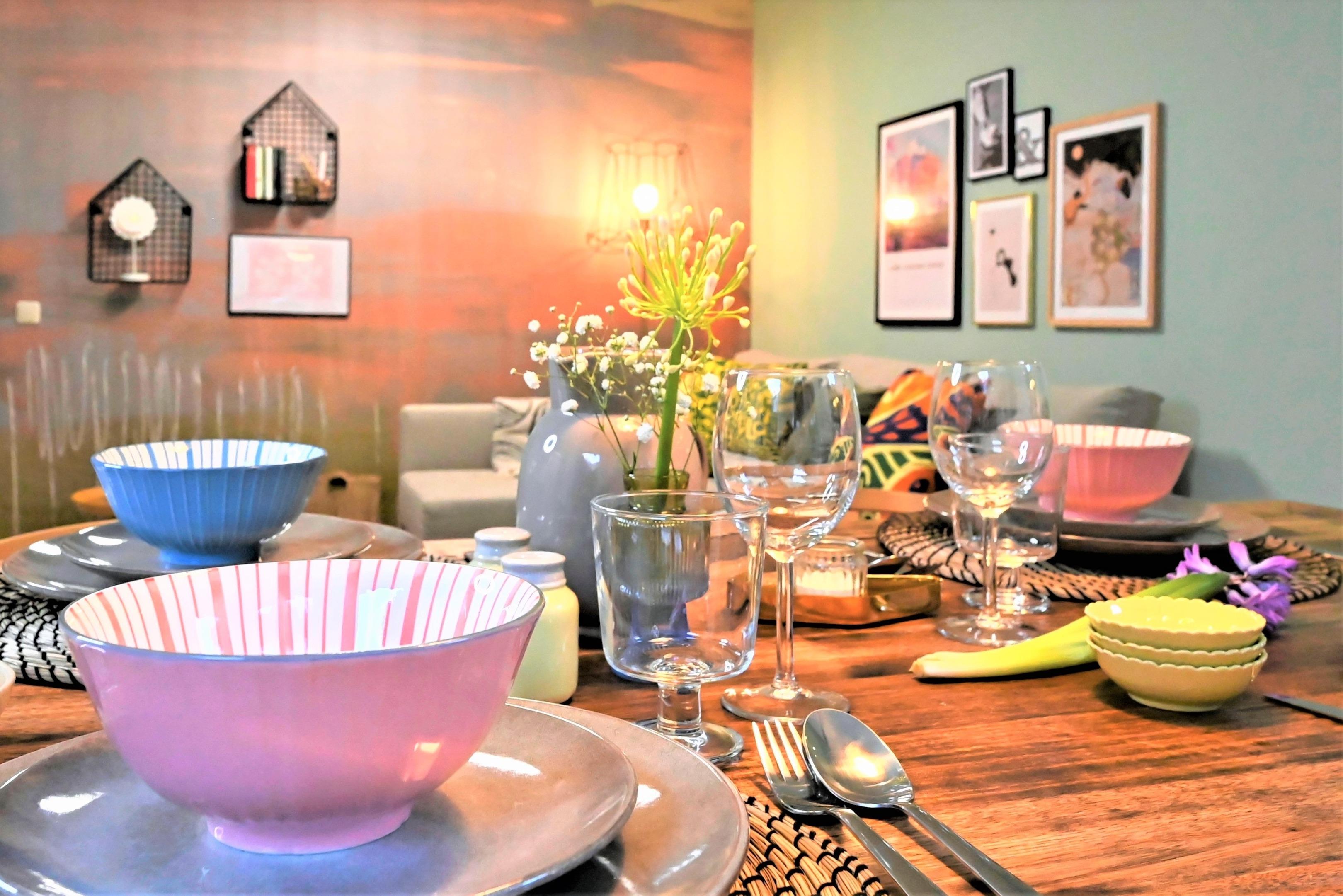 Über einen Durchgang gelangt man in den gemütlich und fröhlich eingerichteten Wohn- und Essbereich. Hier können Sie Ihr Essen genießen, entspannen, beisammen sitzen oder Programme über das Smart-TV streamen. Ein W-Lan-Zugang gehört ebenfalls zur Ausstattung.