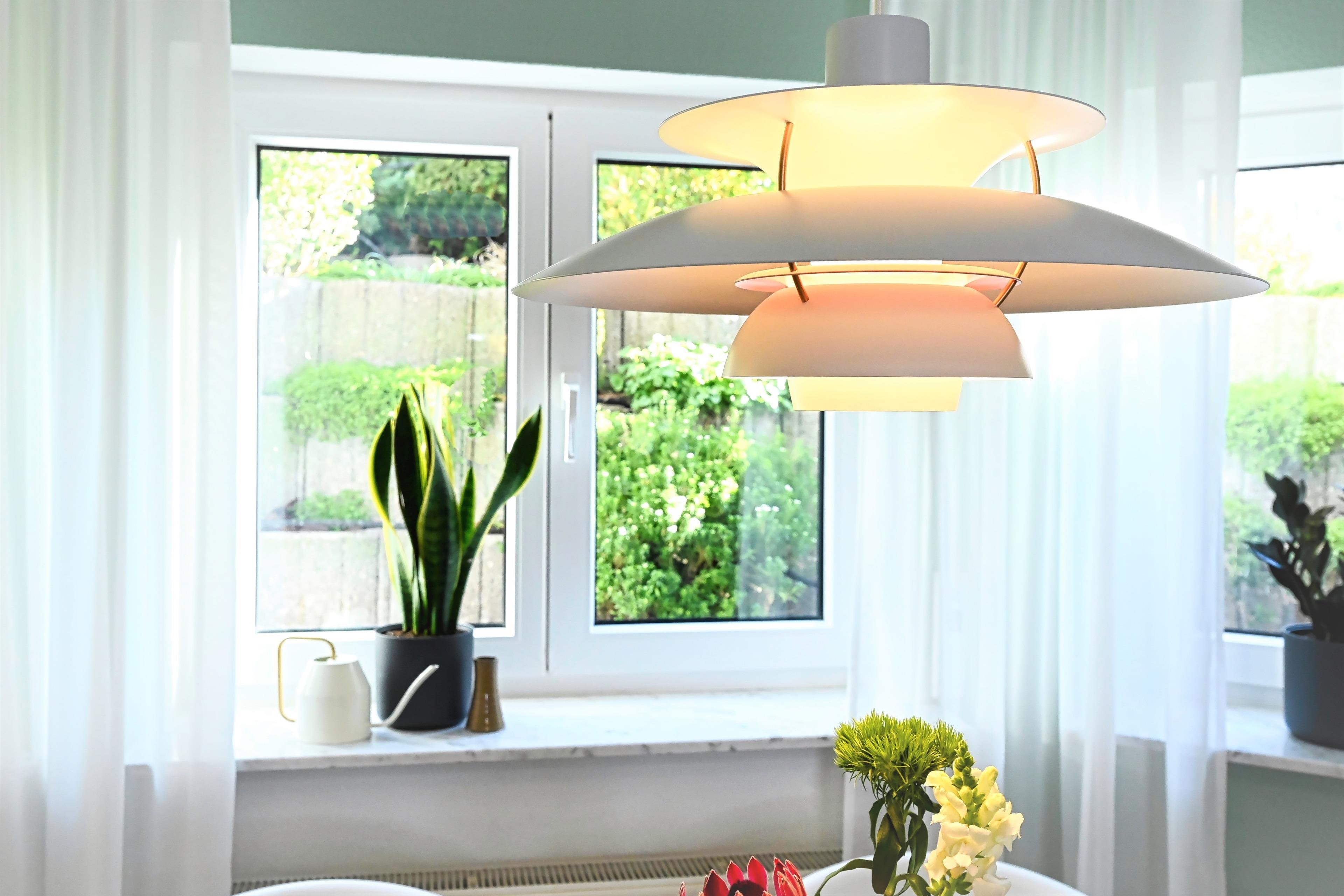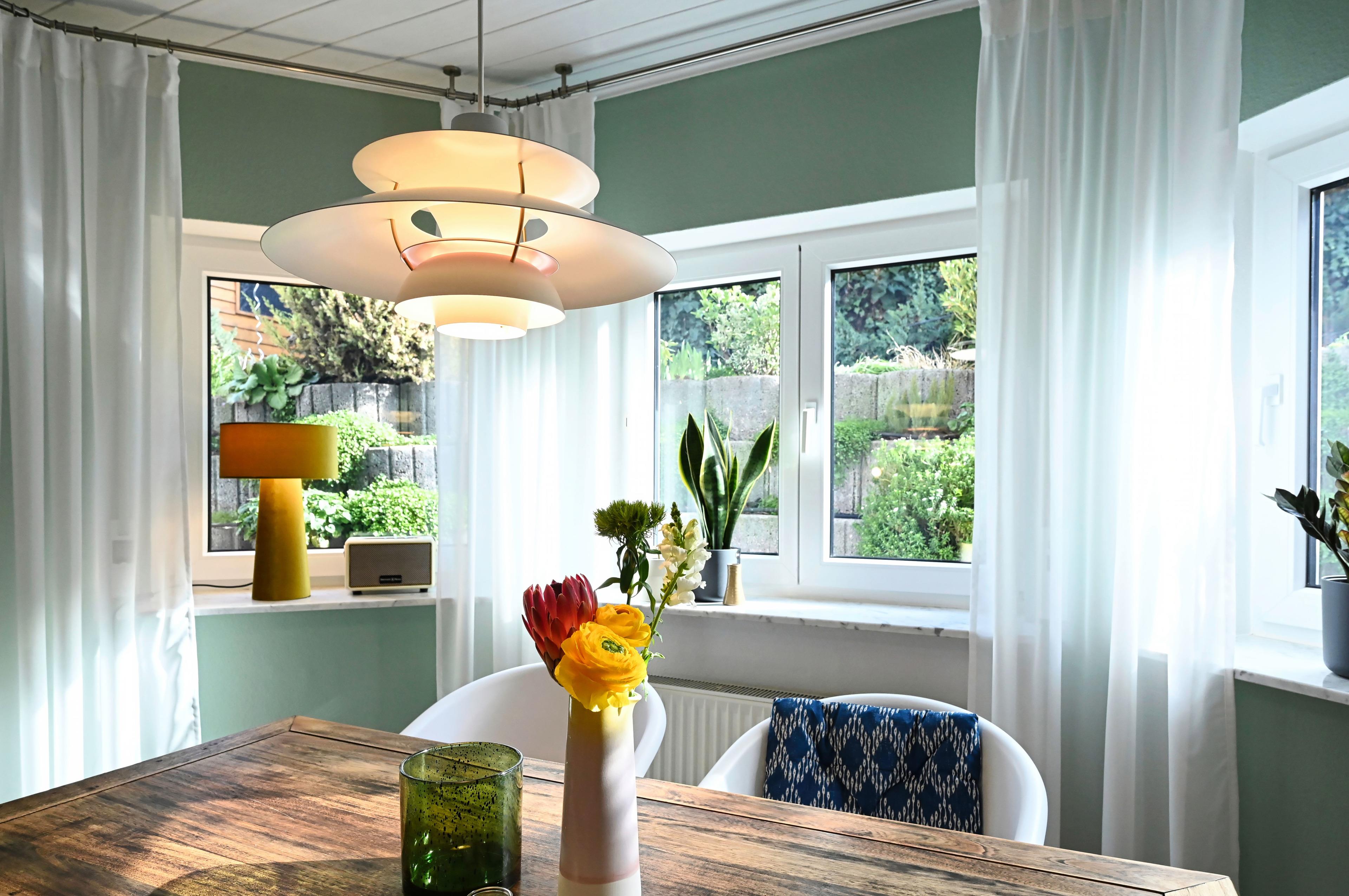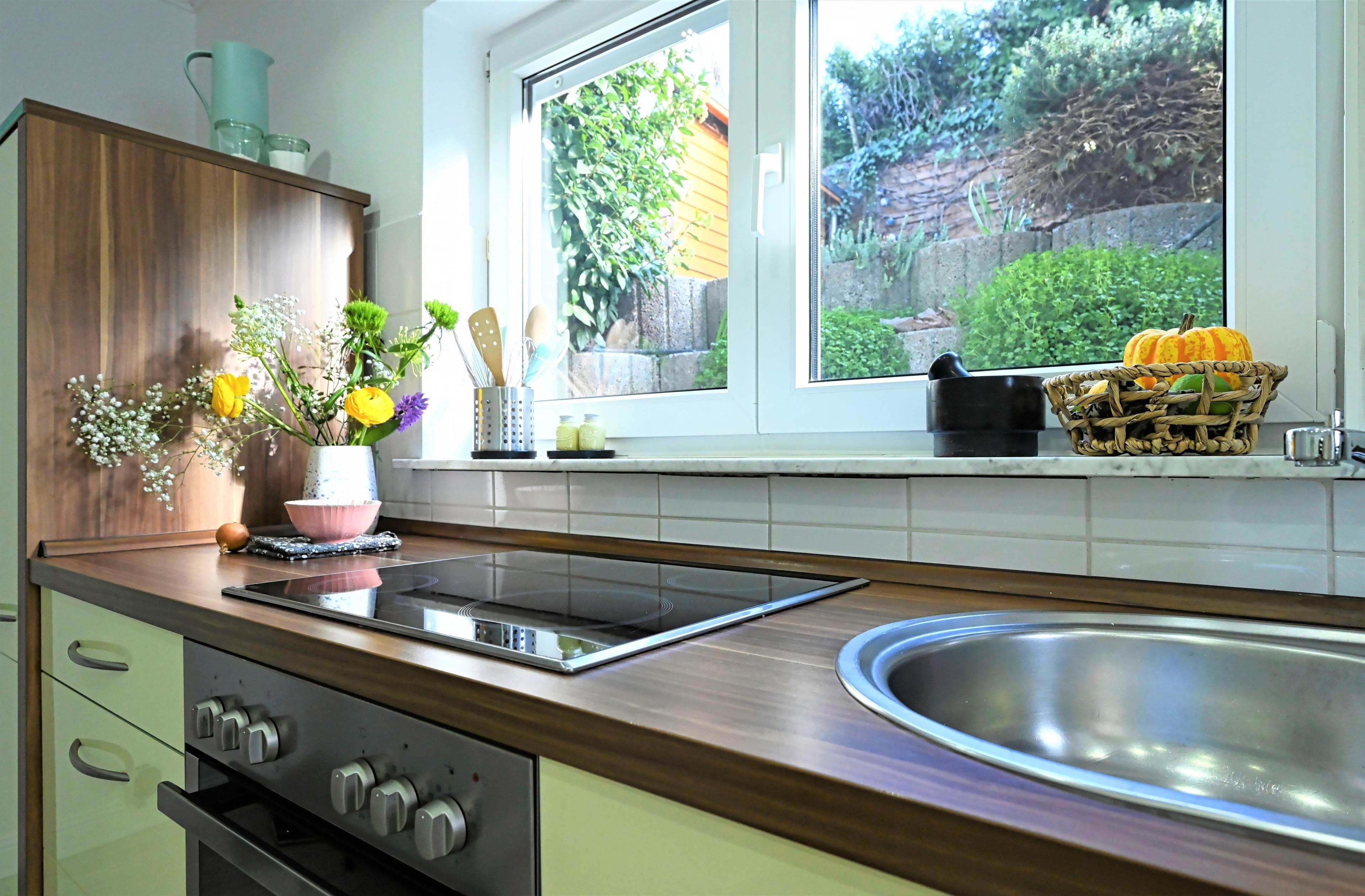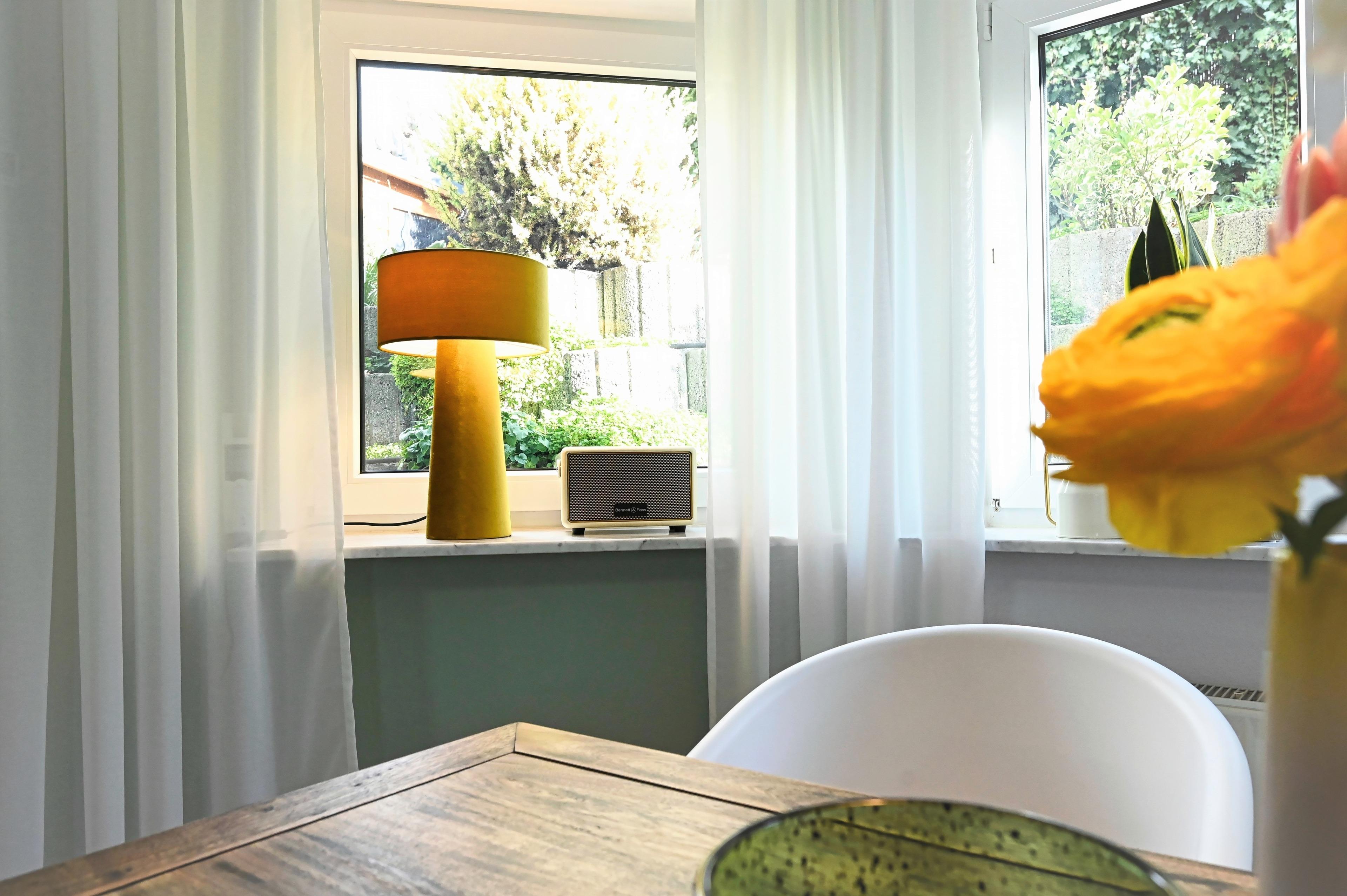 Der Blick aus der Küche und dem Wohnzimmer fällt direkt auf den angrenzenden Gartenbereich, der zur Ferienwohnung gehört.