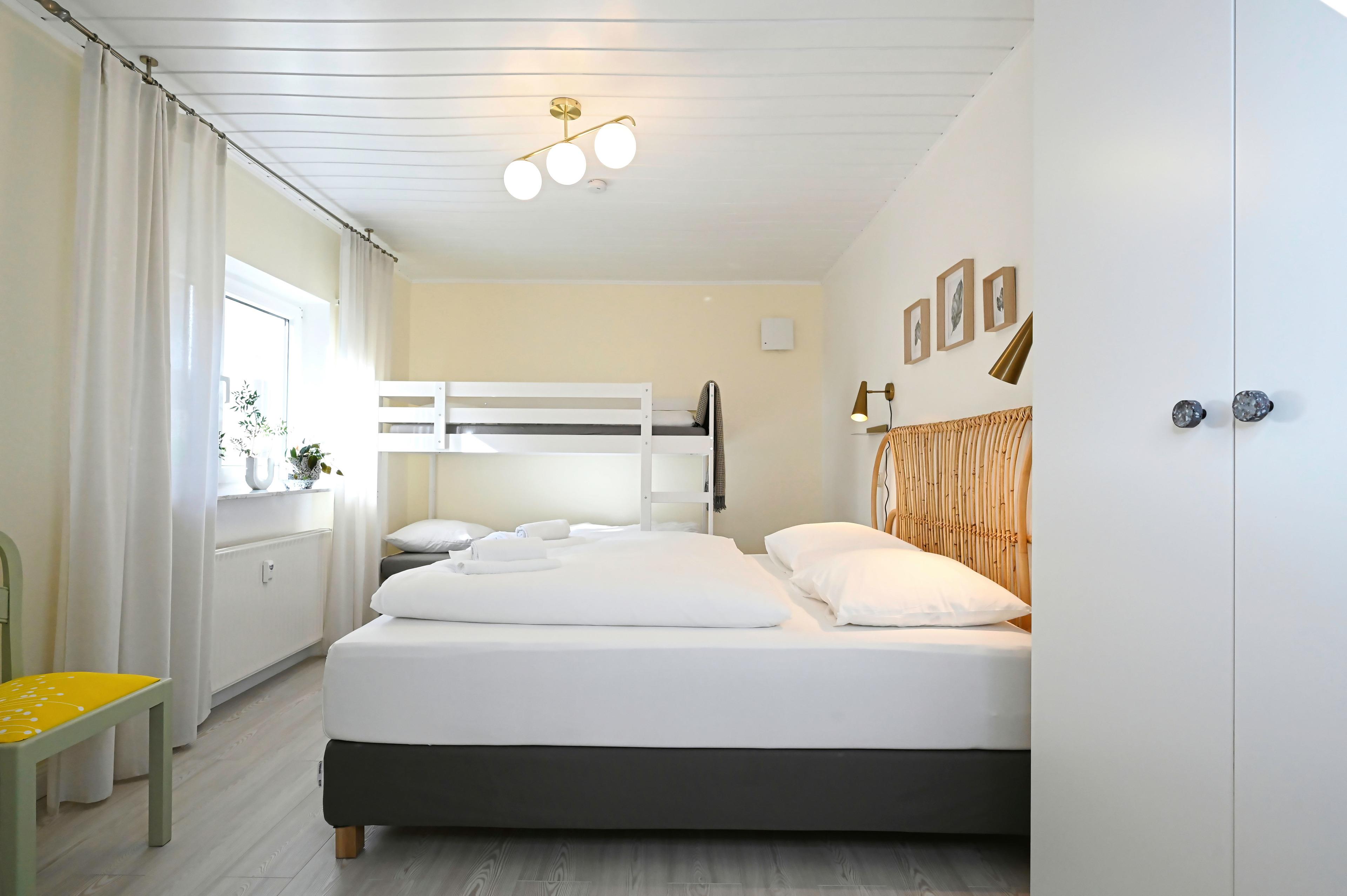 Das Schlafzimmer ist mit einem Boxspringbett (180x200cm) eingerichtet und einem Stockbett (jeweils mit 90x200cm Liegefläche). Bettwäsche ist vorhanden.