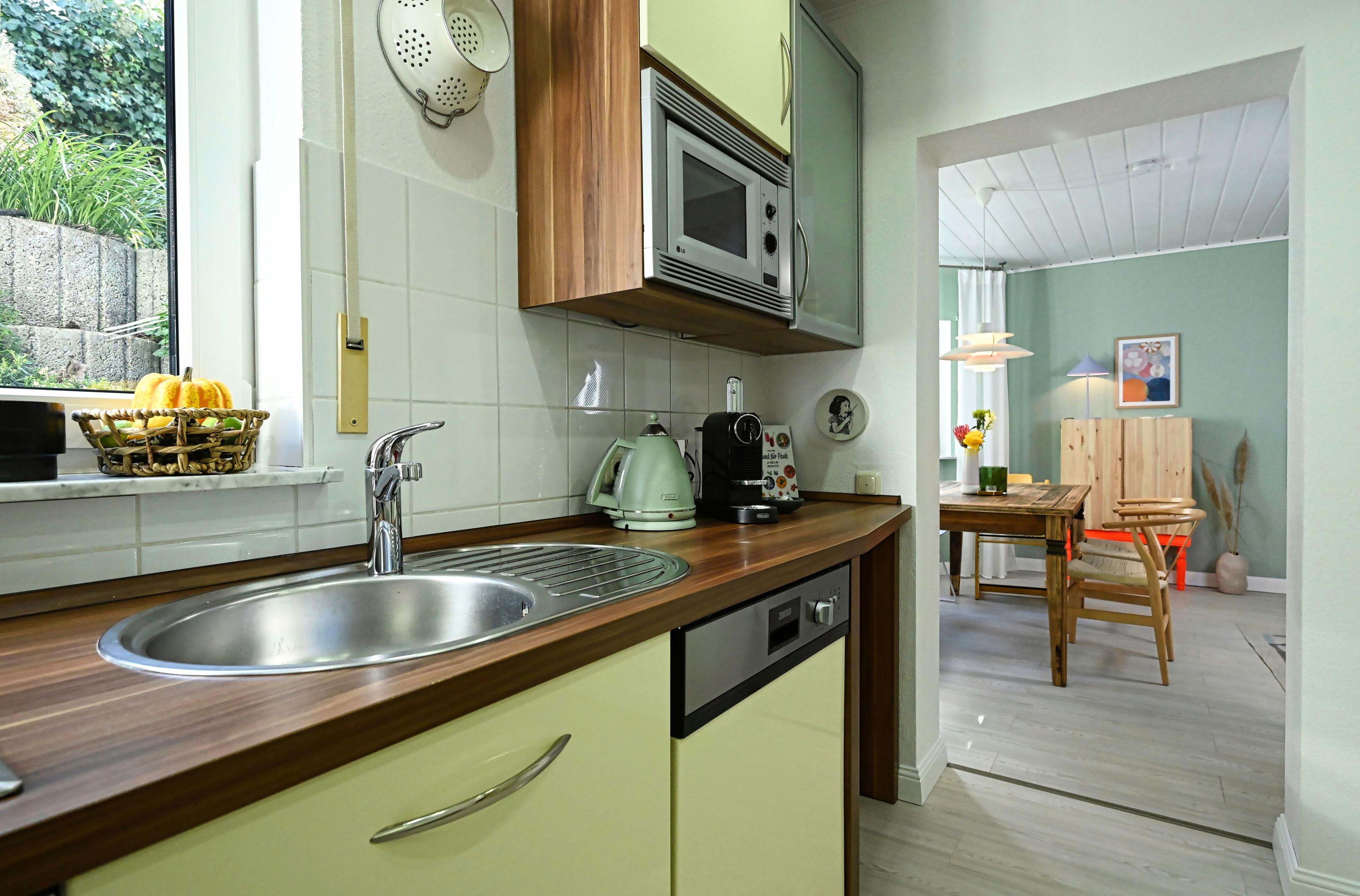 Im Eingangsbereich befindet sich eine Garderobe, von der aus man direkt in die gut ausgestattete Küche gelangt. Hier können Sie sich kleinere oder größere Mahlzeiten wie zu Hause zubereiten.