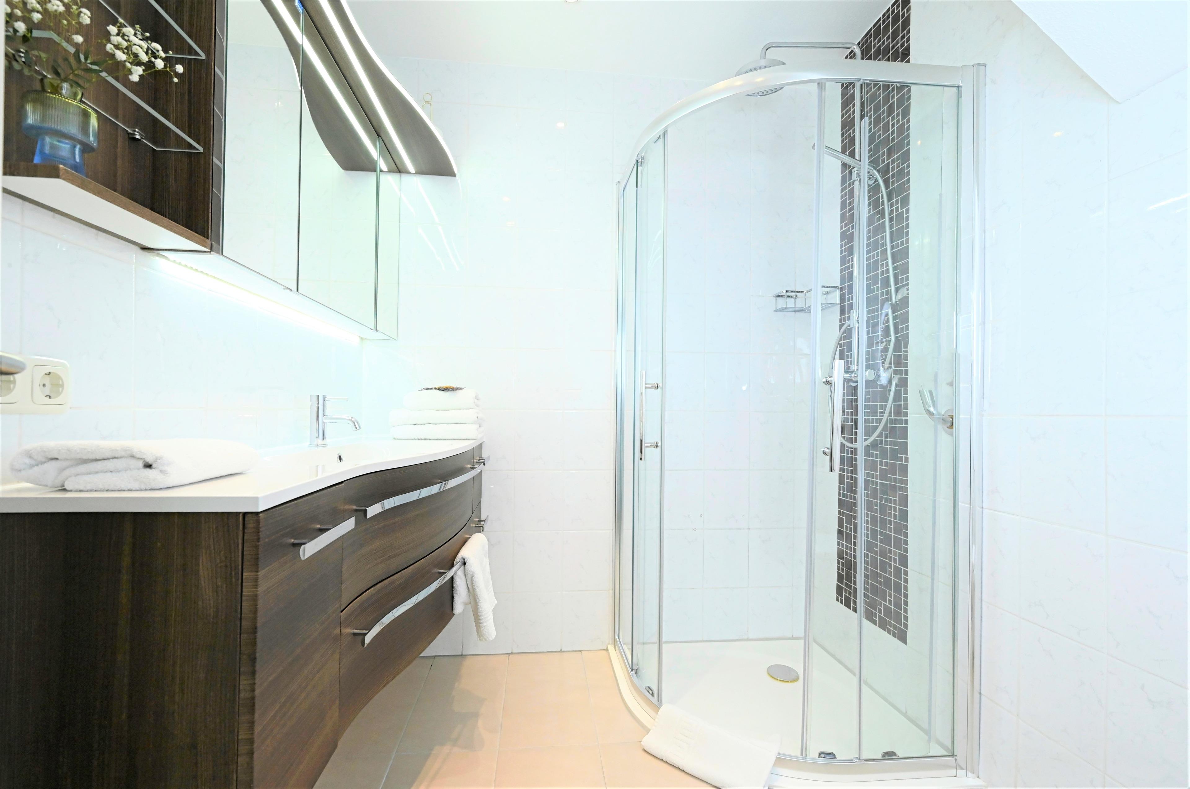 Das Badezimmer mit Waschschrank, WC und Dusche grenzt ebenfalls an den Flurbereich an. Föhn und Handtücher sind inklusive.