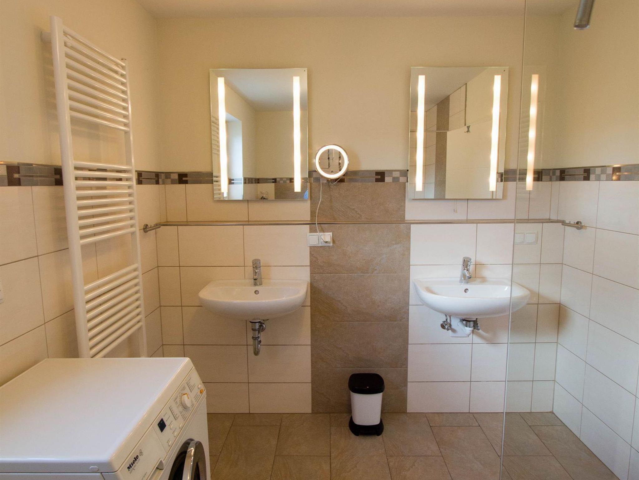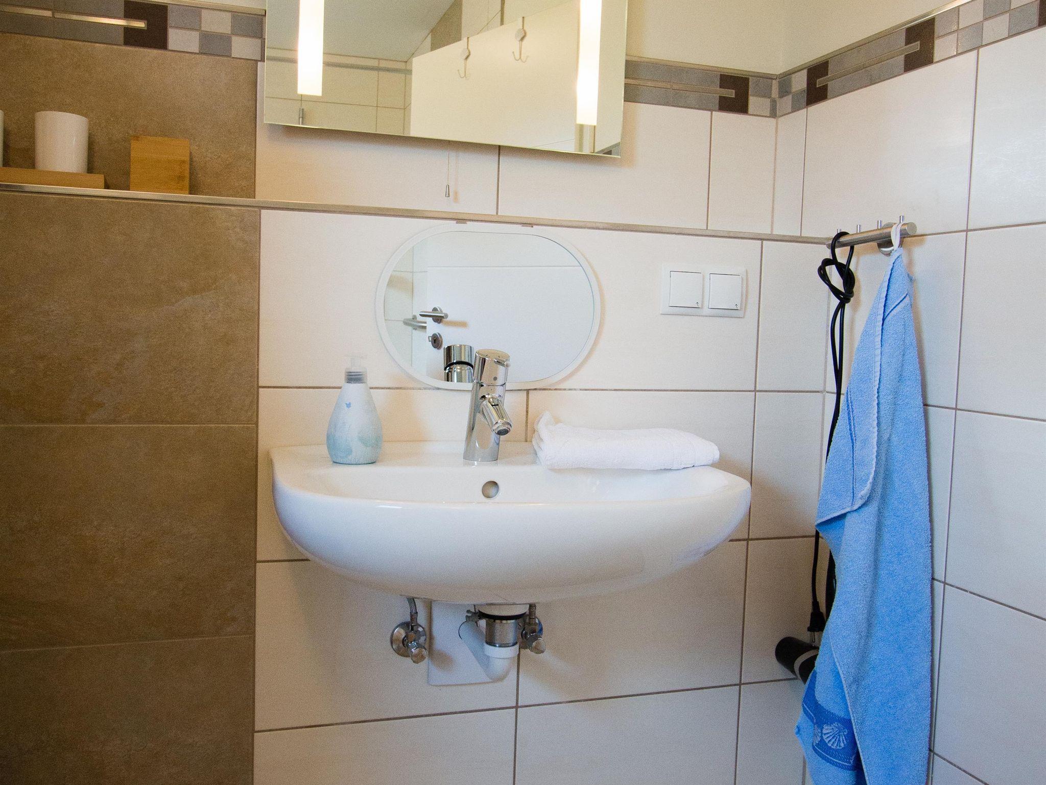 Im großen Bad befindet sich eine ebenerdige befahrbare Dusche. Es gibt zwei Waschgelegenheiten, eine davon ist unterfahrbar.