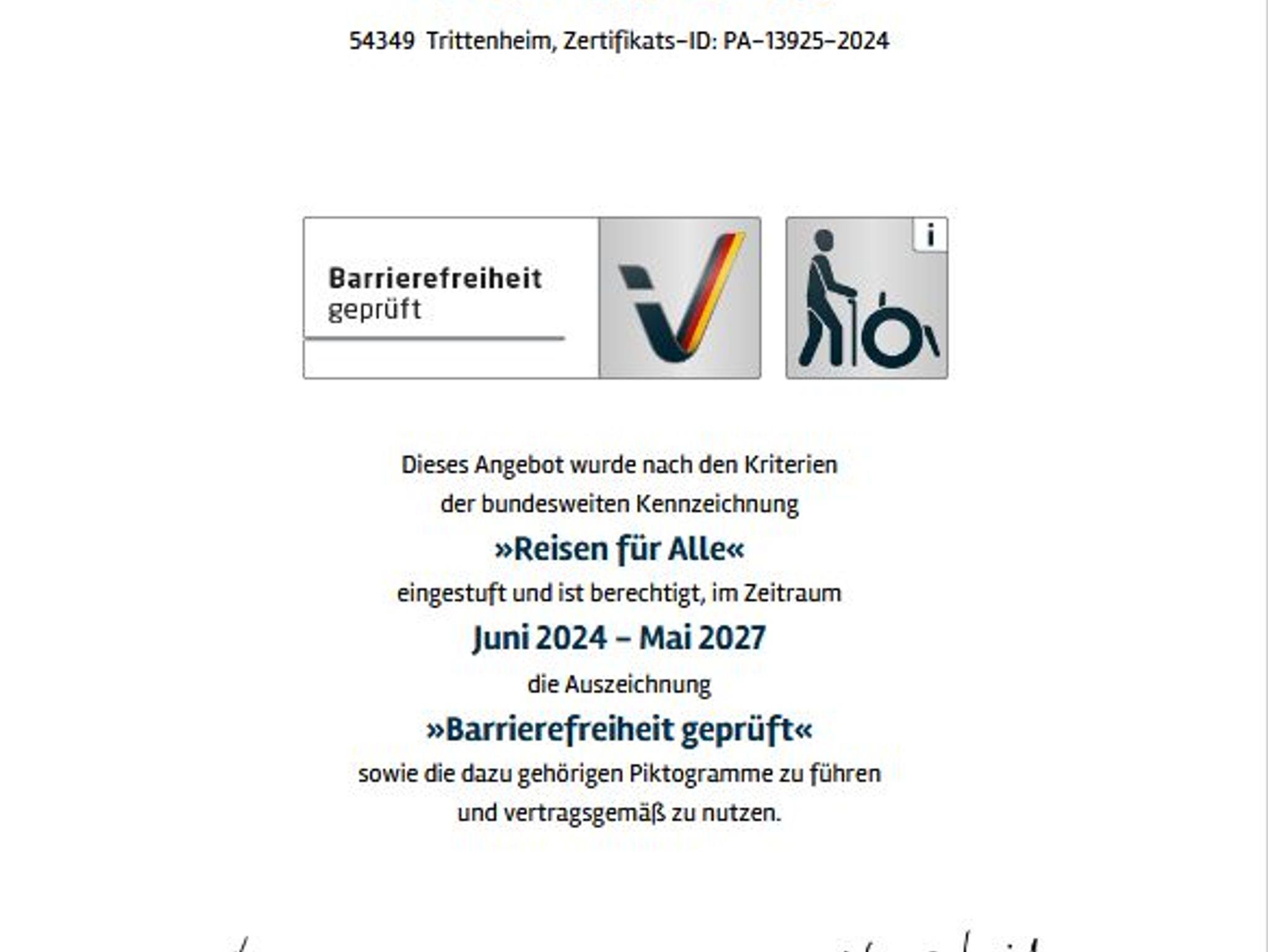 Unser Haus wurde nach den Kriterien der bundesweiten Kennzeichnug Reisen für Alle eingestuft und ist berechtigt, die Auszeichnung Barrierefreiheit geprüft zu nutzen.