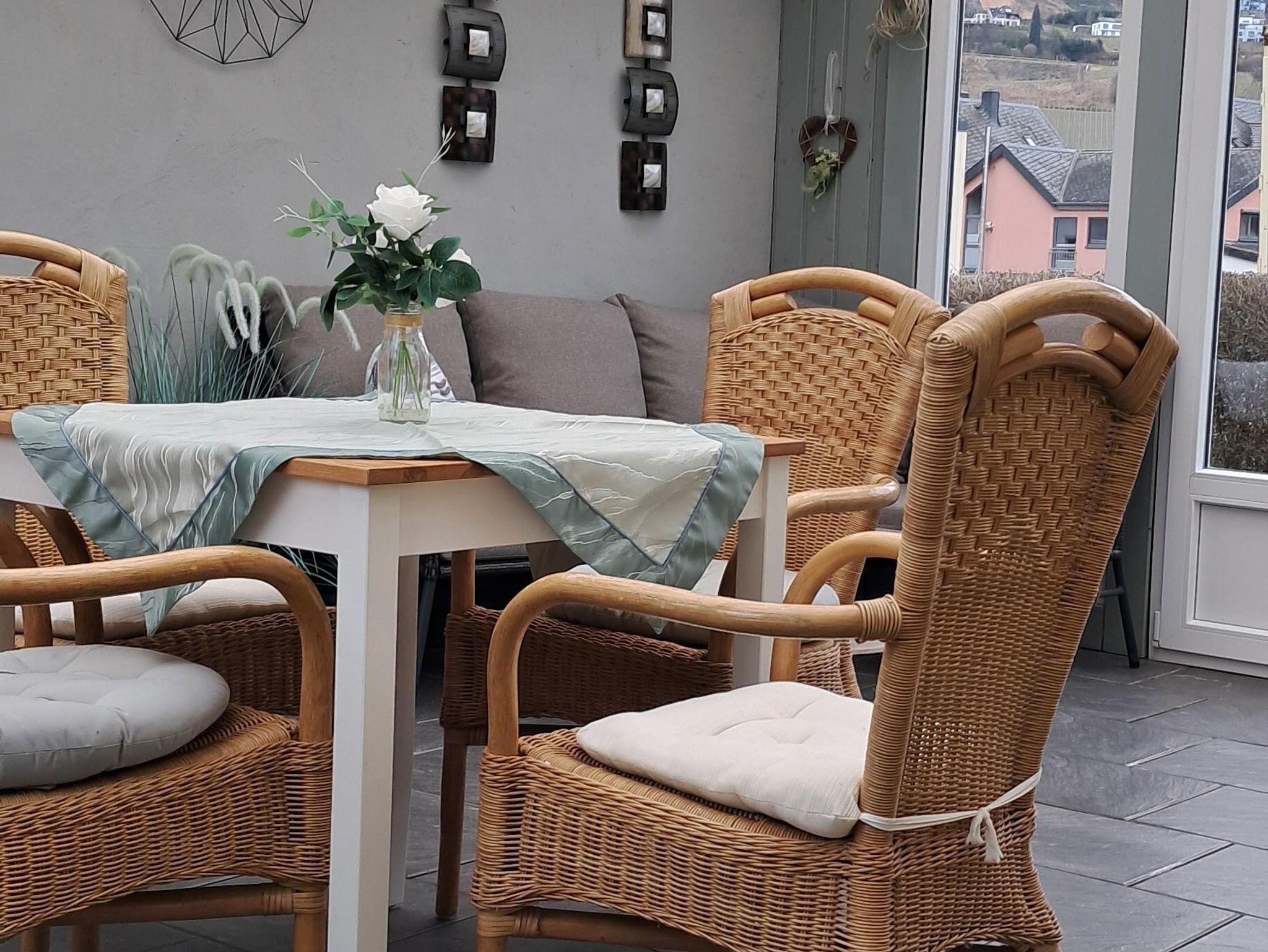 Vom Wintergarten kommt man in den Garten des Ferienhauses mit Sitzgelegenheit.