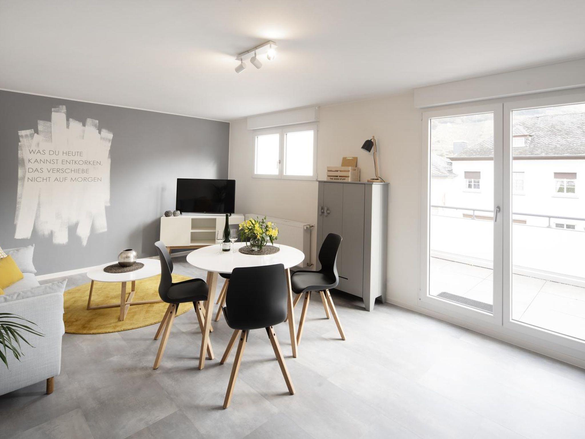 50 m² mit Aussicht in die Weinberge der Trittenheimer Apotheke. Die Ferienwohnung bietet Platz für 2 Personen. Ein großer, heller Wohnraum mit Klimaanlage, voll ausgestatteter Küche, Essecke und Wohnbereich sowie ein separates, ruhiges Schlafzimmer, laden zum entspannten Wohlfühlurlaub ein. Genießen Sie auf dem großzügigen Balkon (12,5 m²) unsere Rieslingweine. Das Appartement kann auch in der kälteren Jahreszeit gebucht werden. In den Wintermonaten sind Spaziergänge und auch Wanderungen im Moseltal möglich. Bäckerei und Metzger sind nur wenige Fußminuten entfernt, in beiden Nachbarorten gibt es gute Lebensmittelgeschäfte. Klein, aber fein - alles da um ein paar nette ruhige Tage zu verbringen!