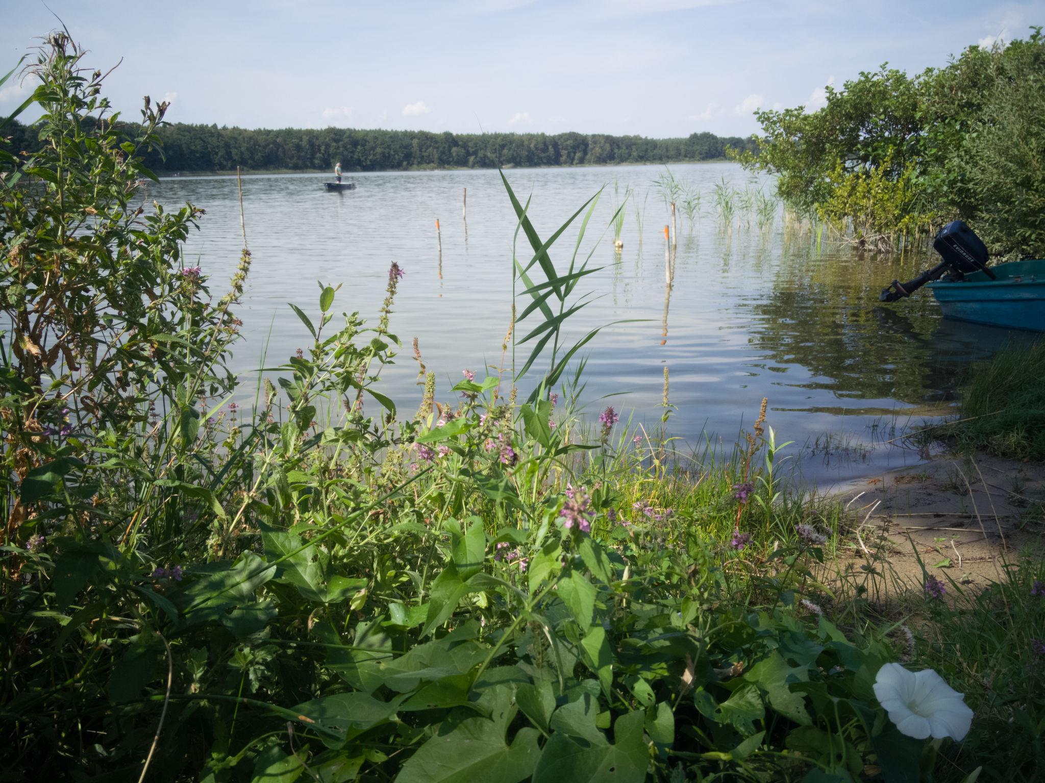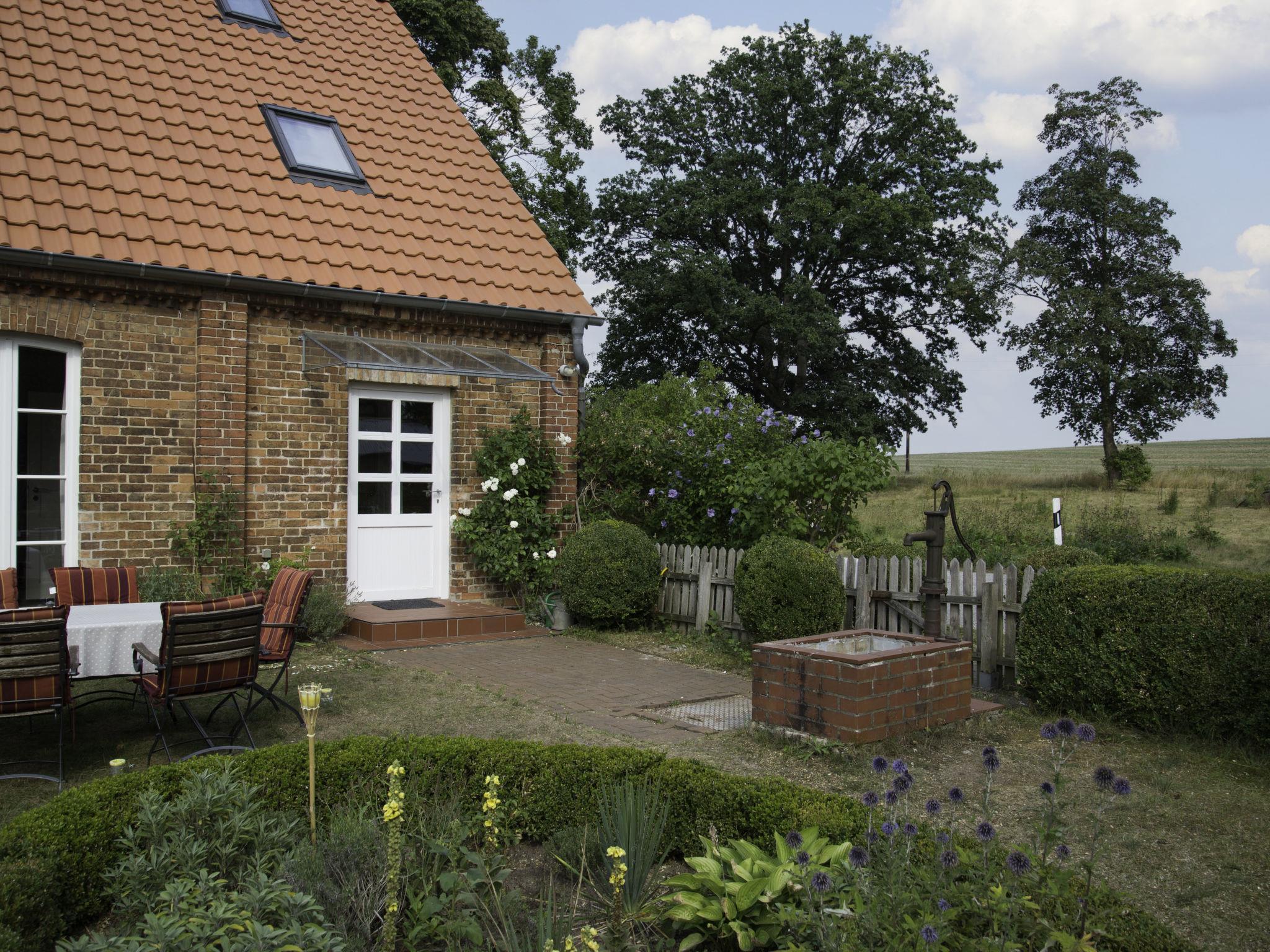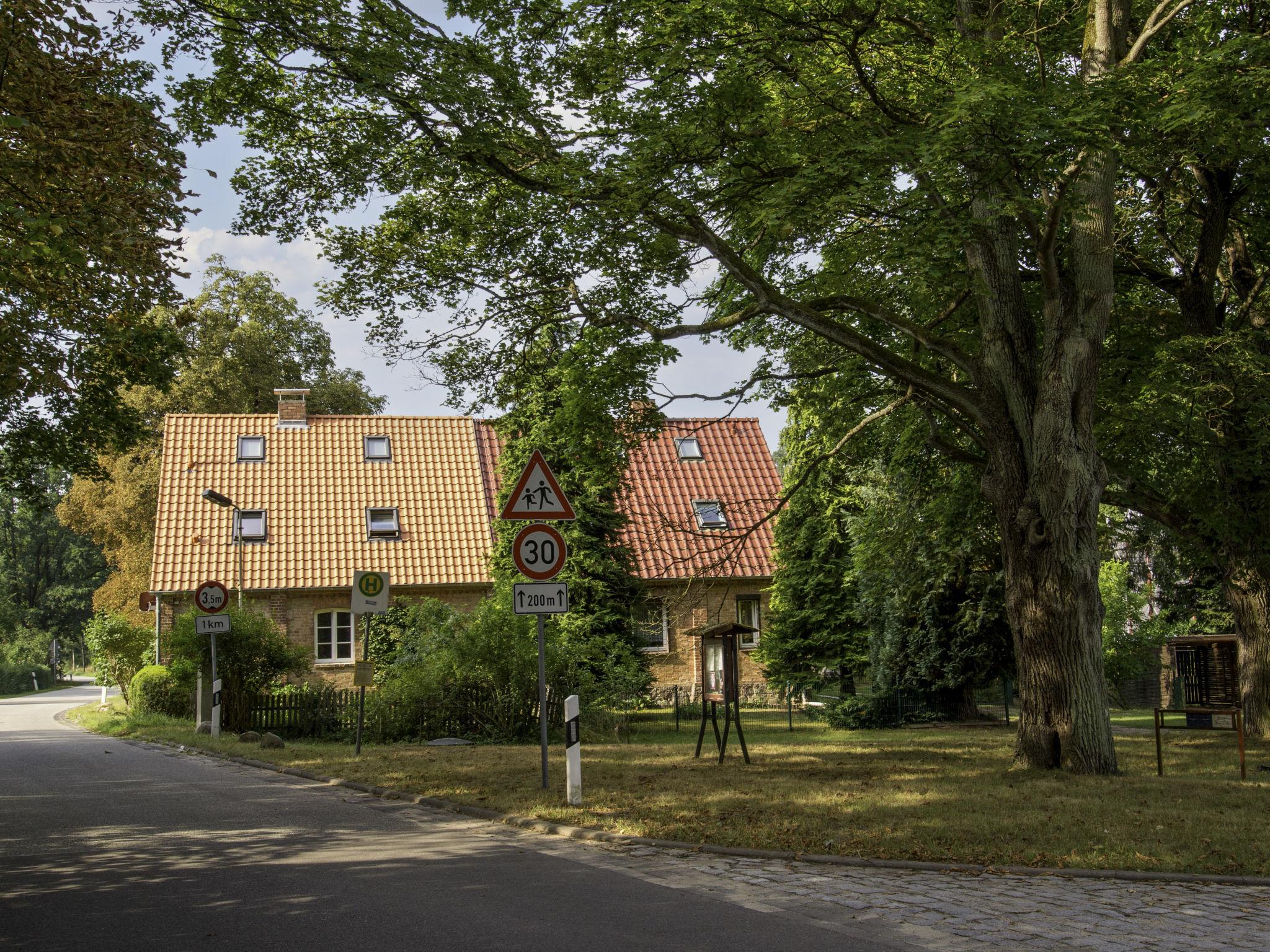 House "Kranich". In the hamlet Troja, 6 km from the centre of Schwarz, 10 km from the centre of Mirow, 2.5 km from the lake. Private: property 600 m2 (fenced) with lawn and trees. Terrace, garden furniture, barbecue, parking at the house at 10 m. Supermarket 10 km, restaurant 6 km, bus stop "Troja" 30 m, grass beach "Krümmel, Nebelsee" 2.5 km, bathing lake 2.5 km. Riding stable 2.5 km. Well-known lakes can easily be reached: Nebelsee 2.5 km. Boat rental in Sewekow 6 km. The second half of the house is occupied by permanent tenants.