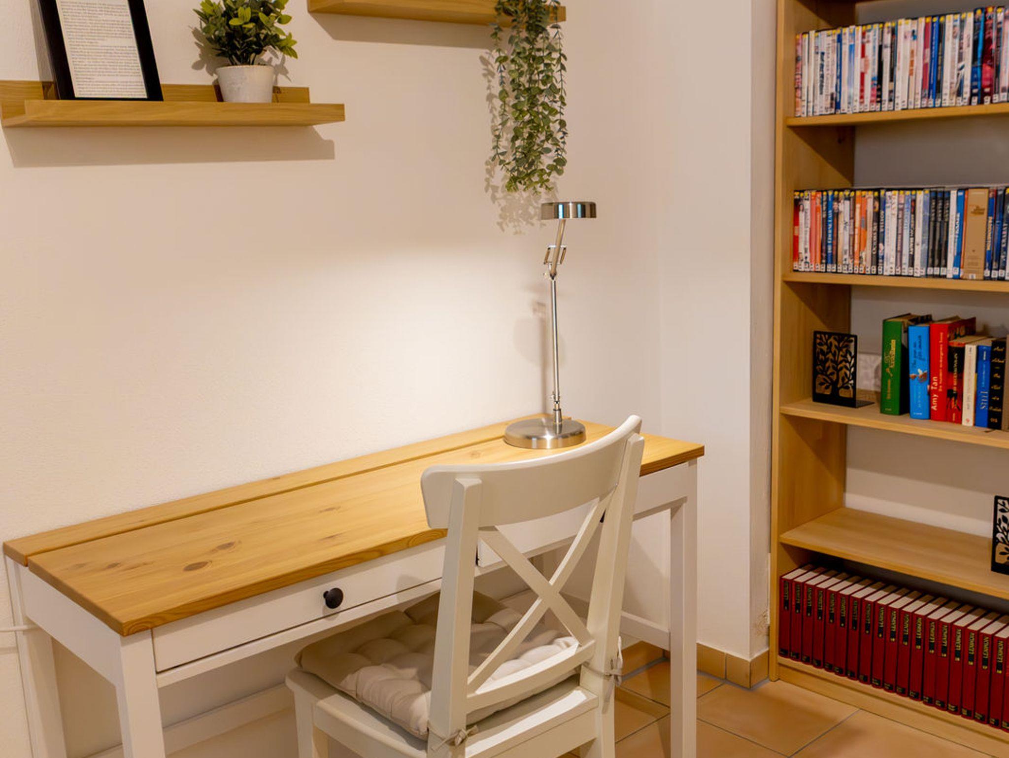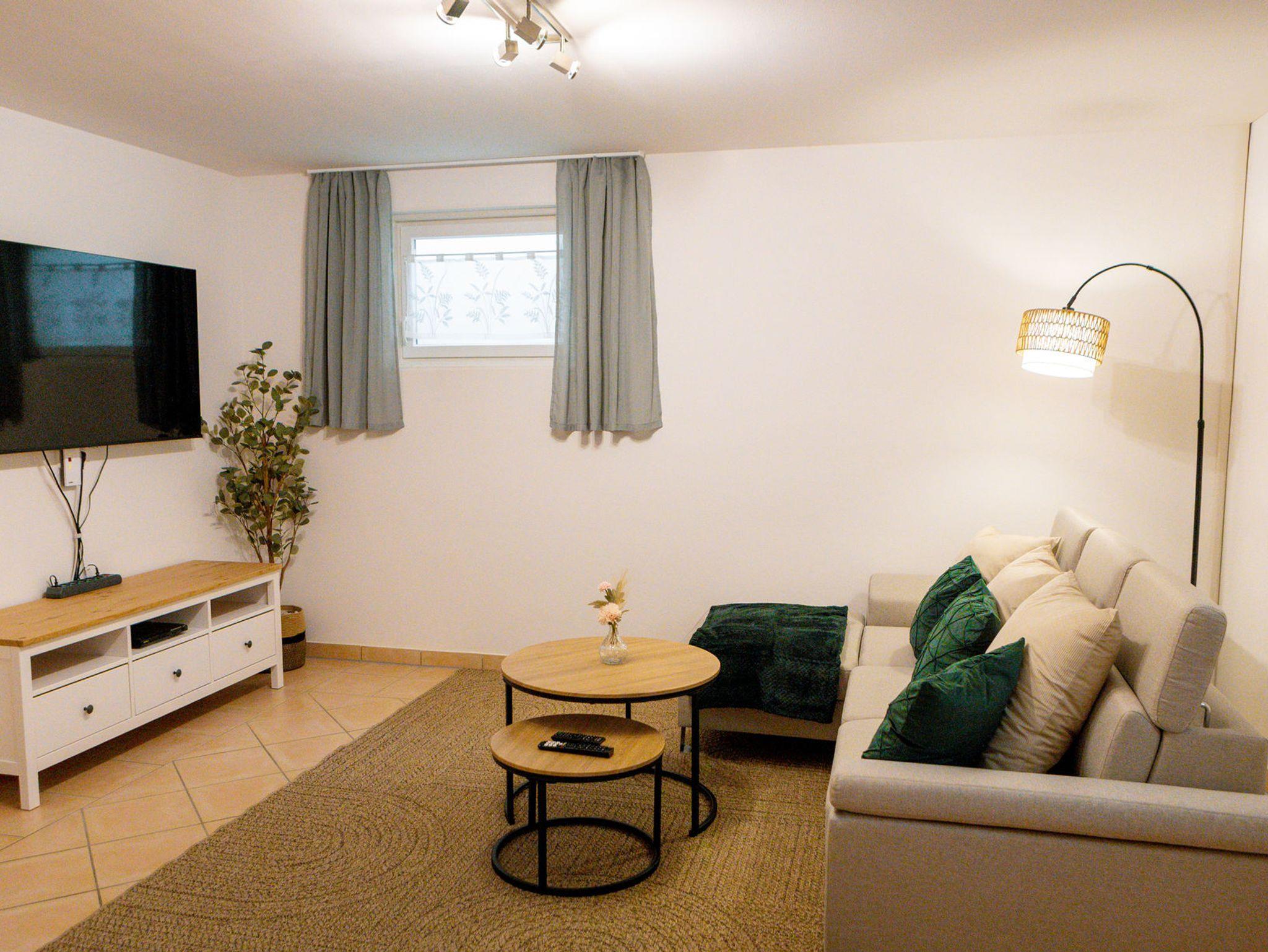 - Gemütliches Wohnzimmer UG mit Couch (+ Schlaffunktion), DVD-Player, einer Auswahl an DVDs, Büchern und einem Schreibtisch.