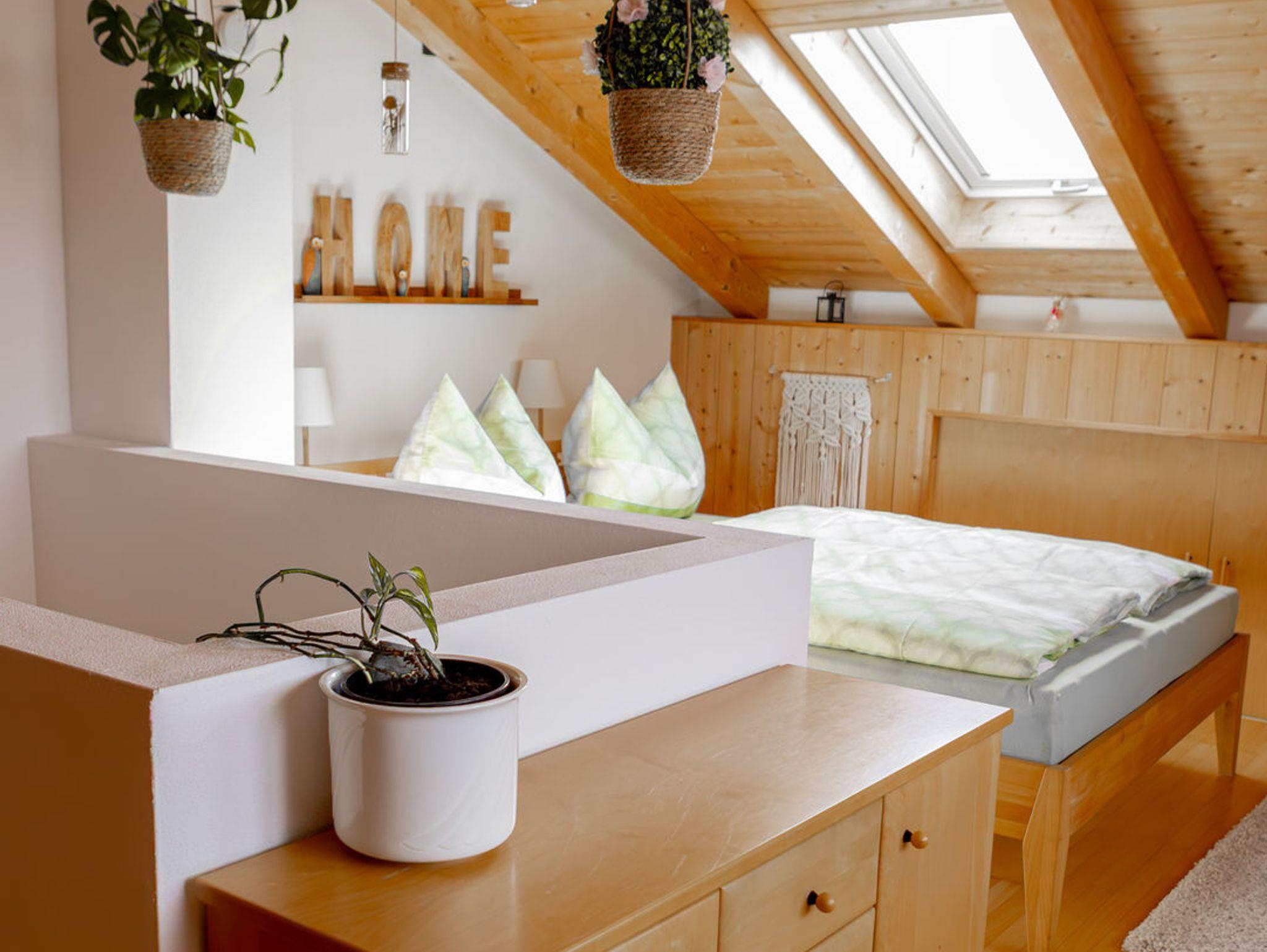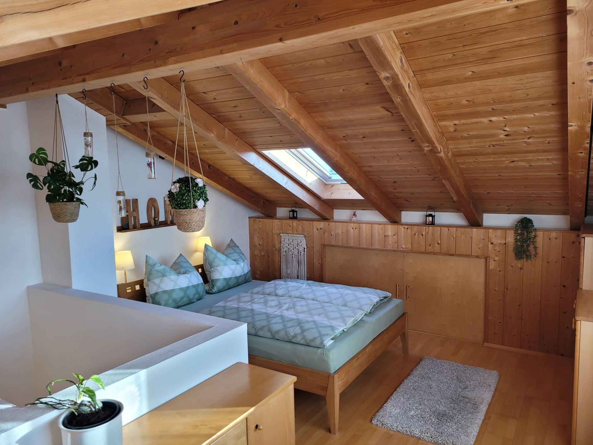 - offenes Schlafzimmer DG mit komfortablem Doppelbett in Überlänge (2,20 m) mit Blick auf die Alz