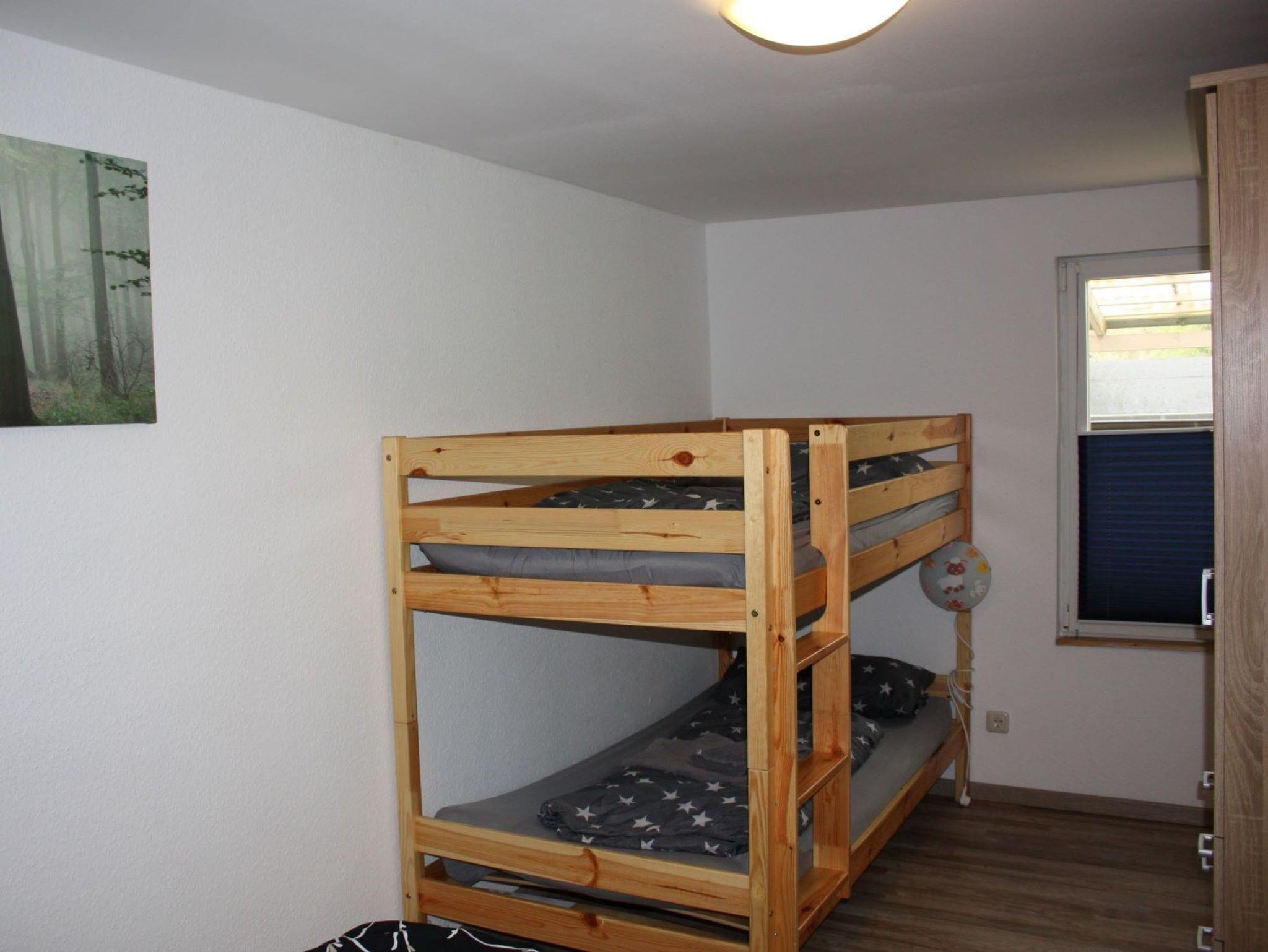 Bungalow am Waldrand bietet:1 Schlafraum für 4 Personen mit Doppelbett und Etagenbett, 1 Wohnraum mit Schlafcouch, Essbereich und offener Küche, sowie ein Bad mit Dusche/WC und Waschmaschine.