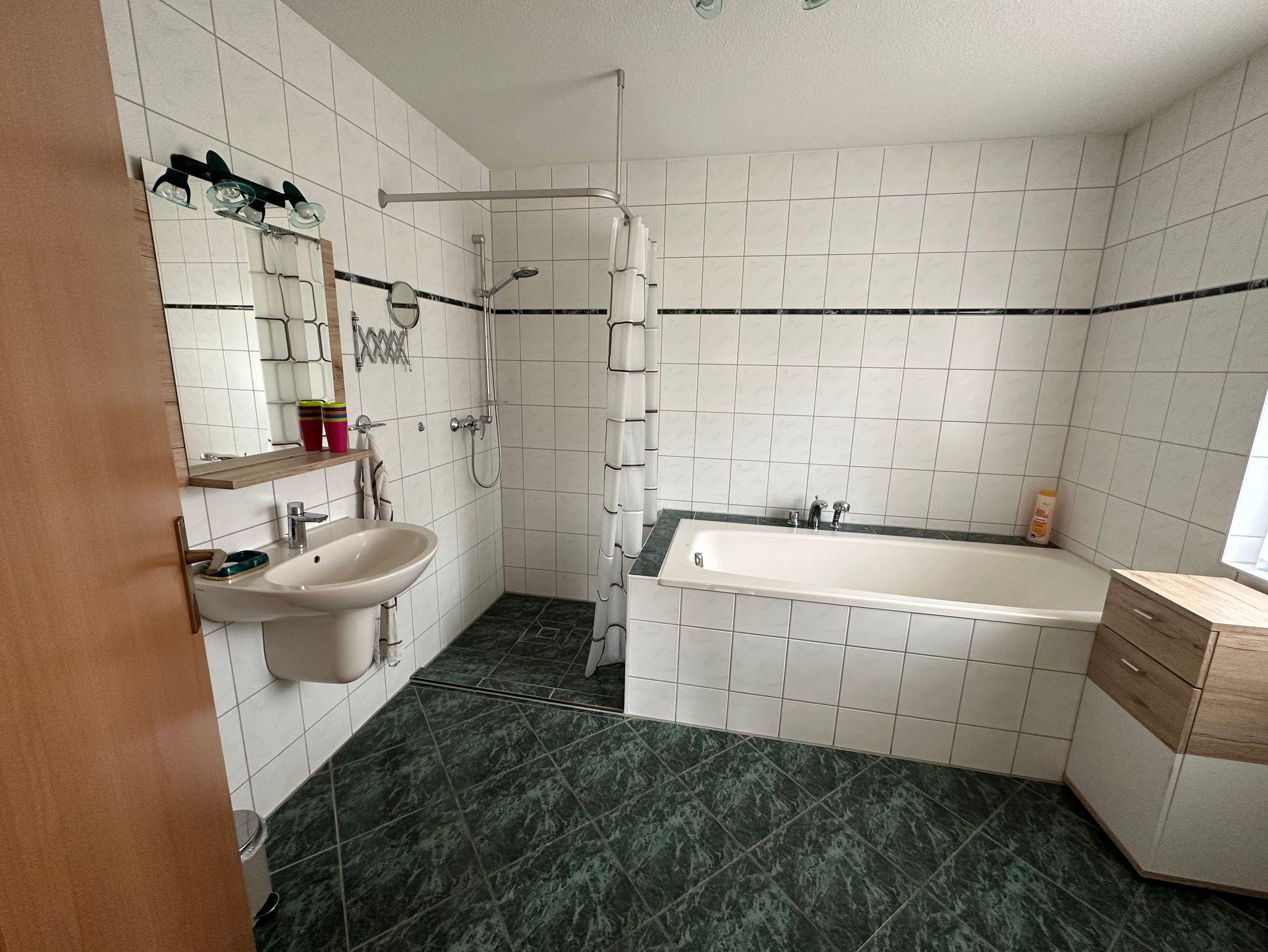 Ein großes Bad mit Dusche und Badewanne und ein kleines Bad mit Dusche