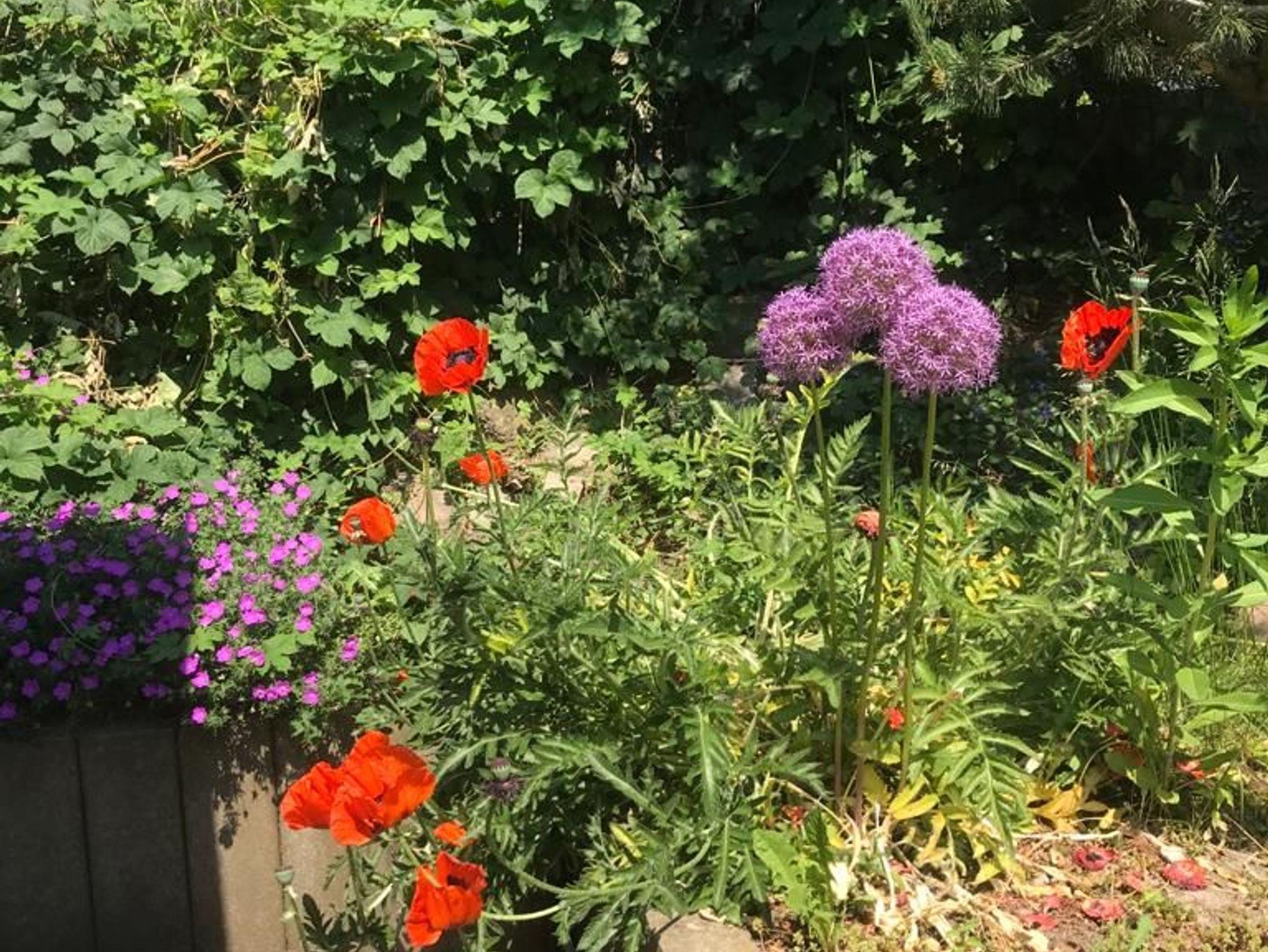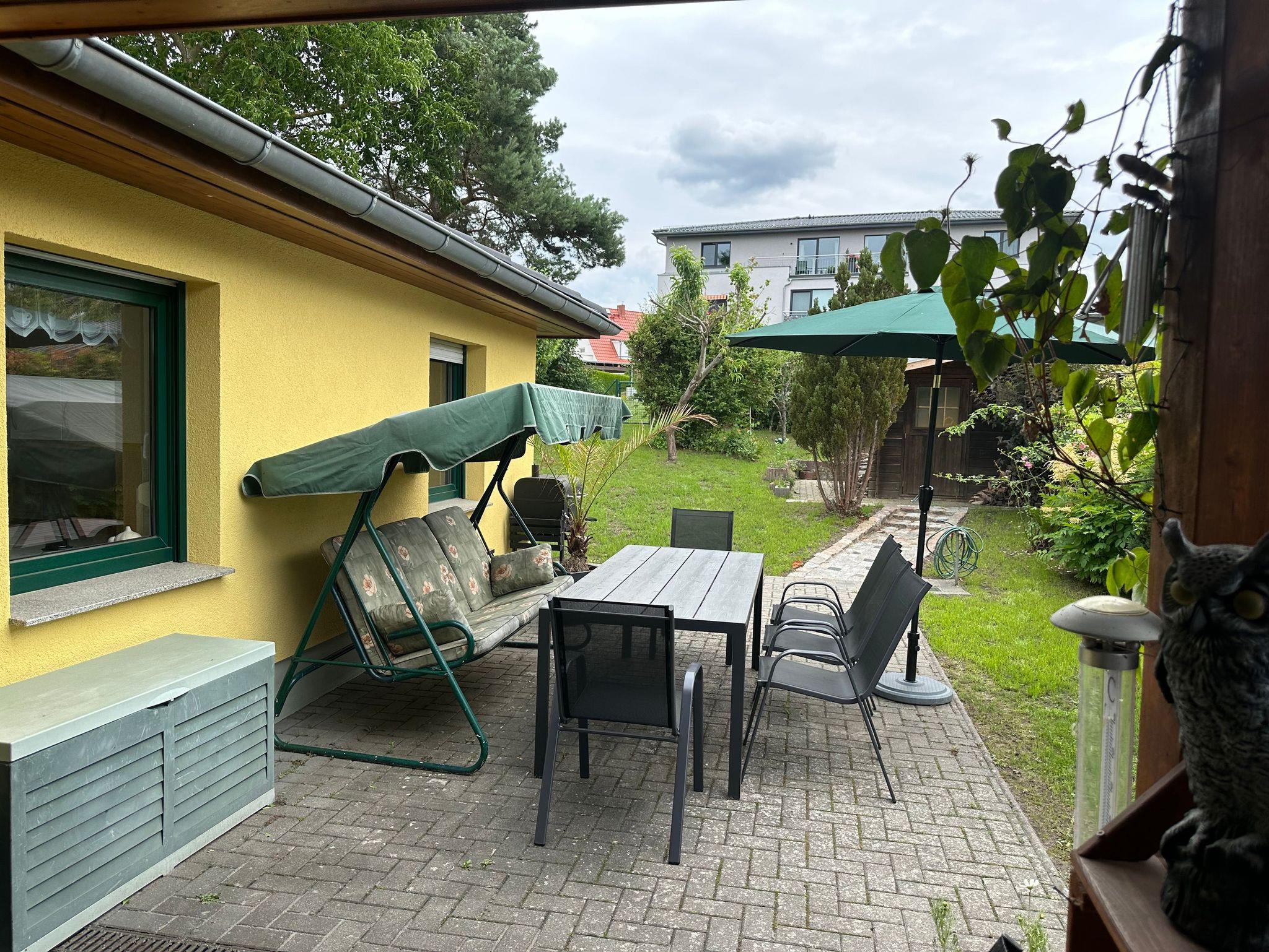 Eine schöne große teilweise überdachte, möblierte Terrasse auf einem schön bepflanztem umzäunten Grundstück.
