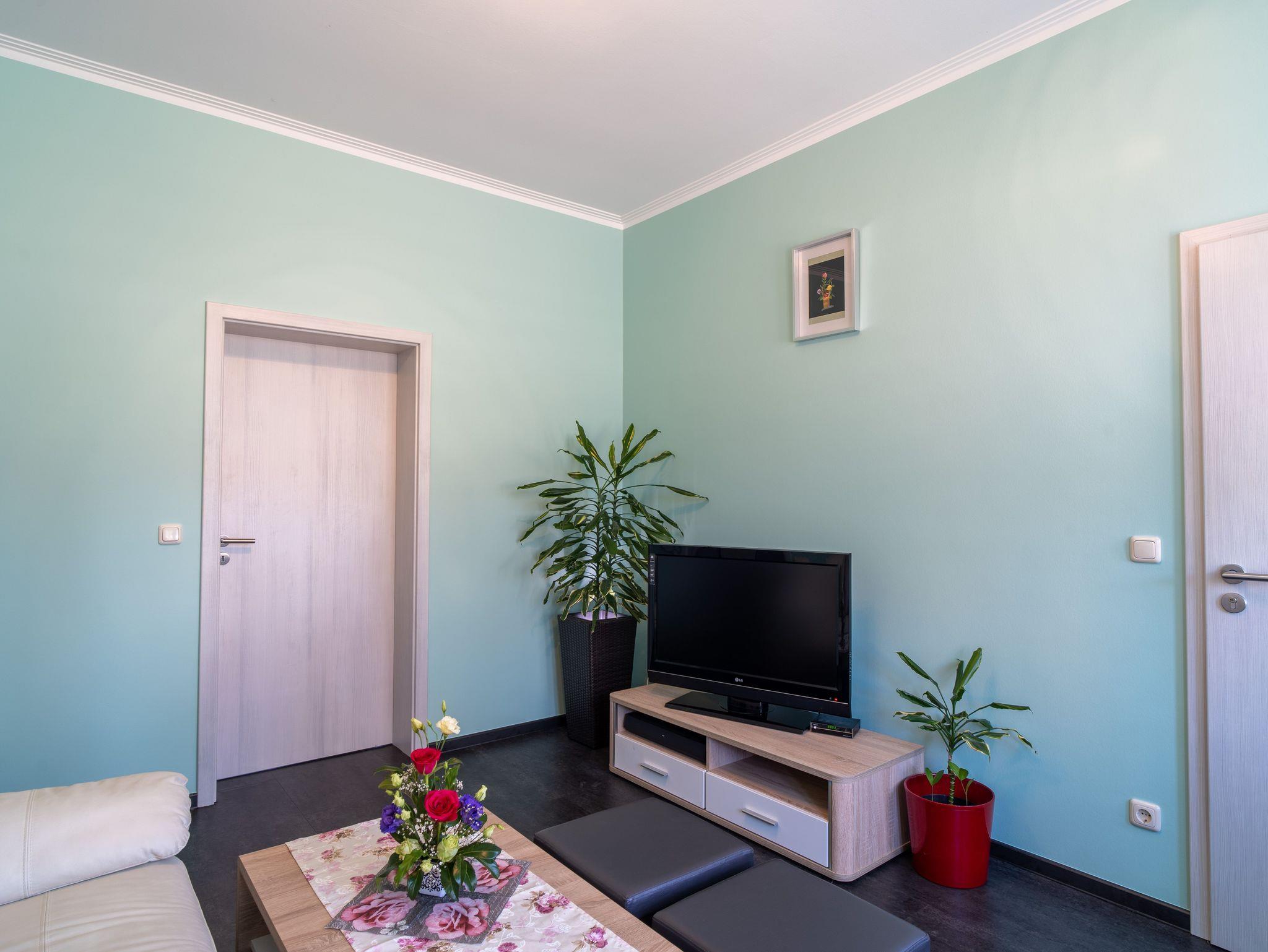 Das Wohnzimmer verfügt über Flachbildfernseher mit Satelliten TV und einer Bluetoothmusikanlage.