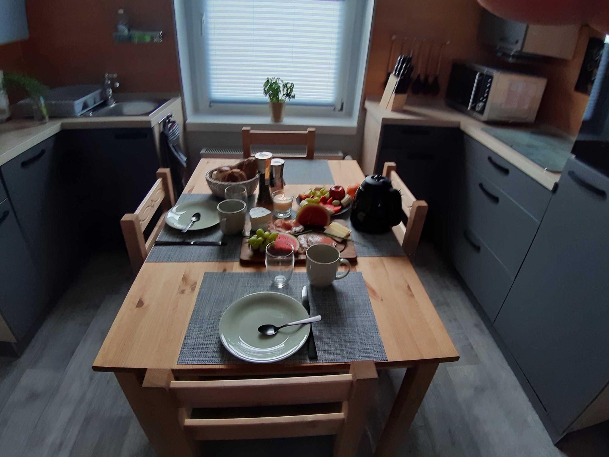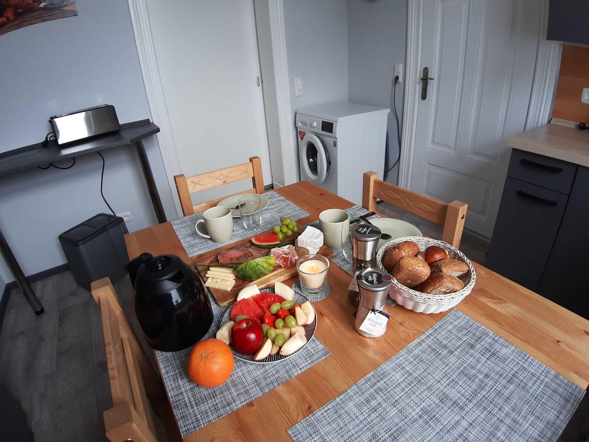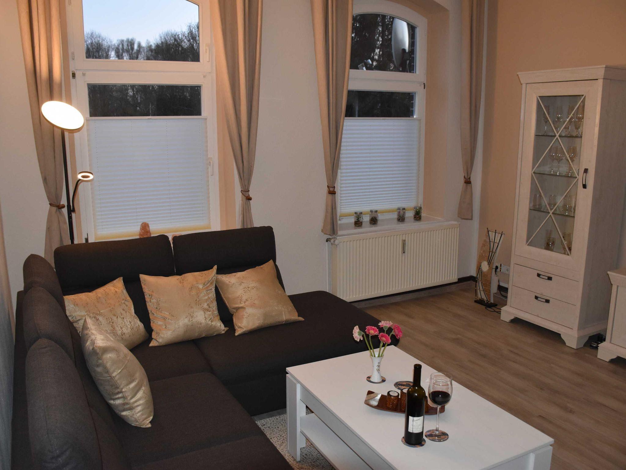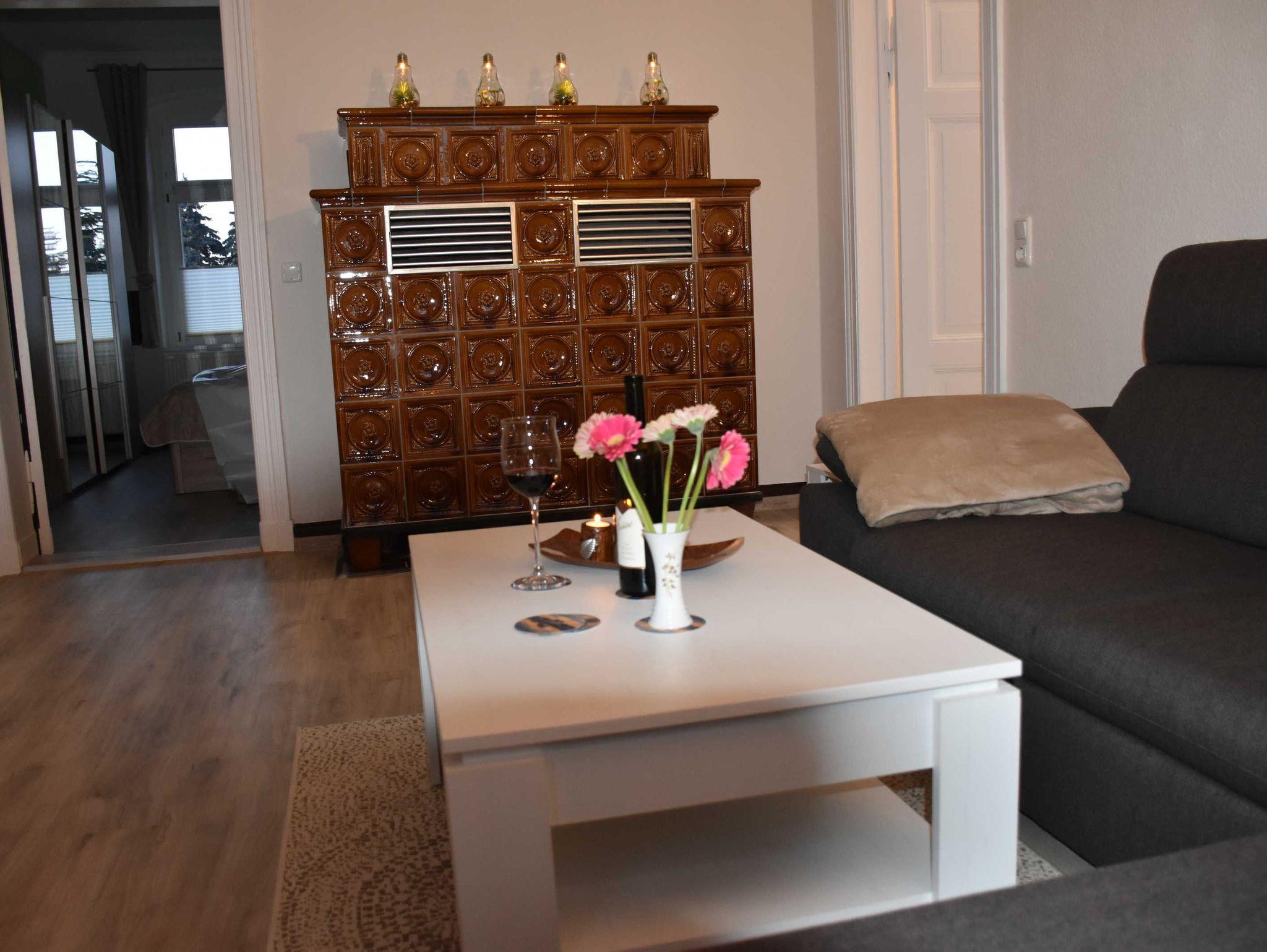 Die Ferienwohnung befindet sich im Erdgeschoss eines Mehrfamilienhauses mit großen, hellen Räumen und hohen Decken.