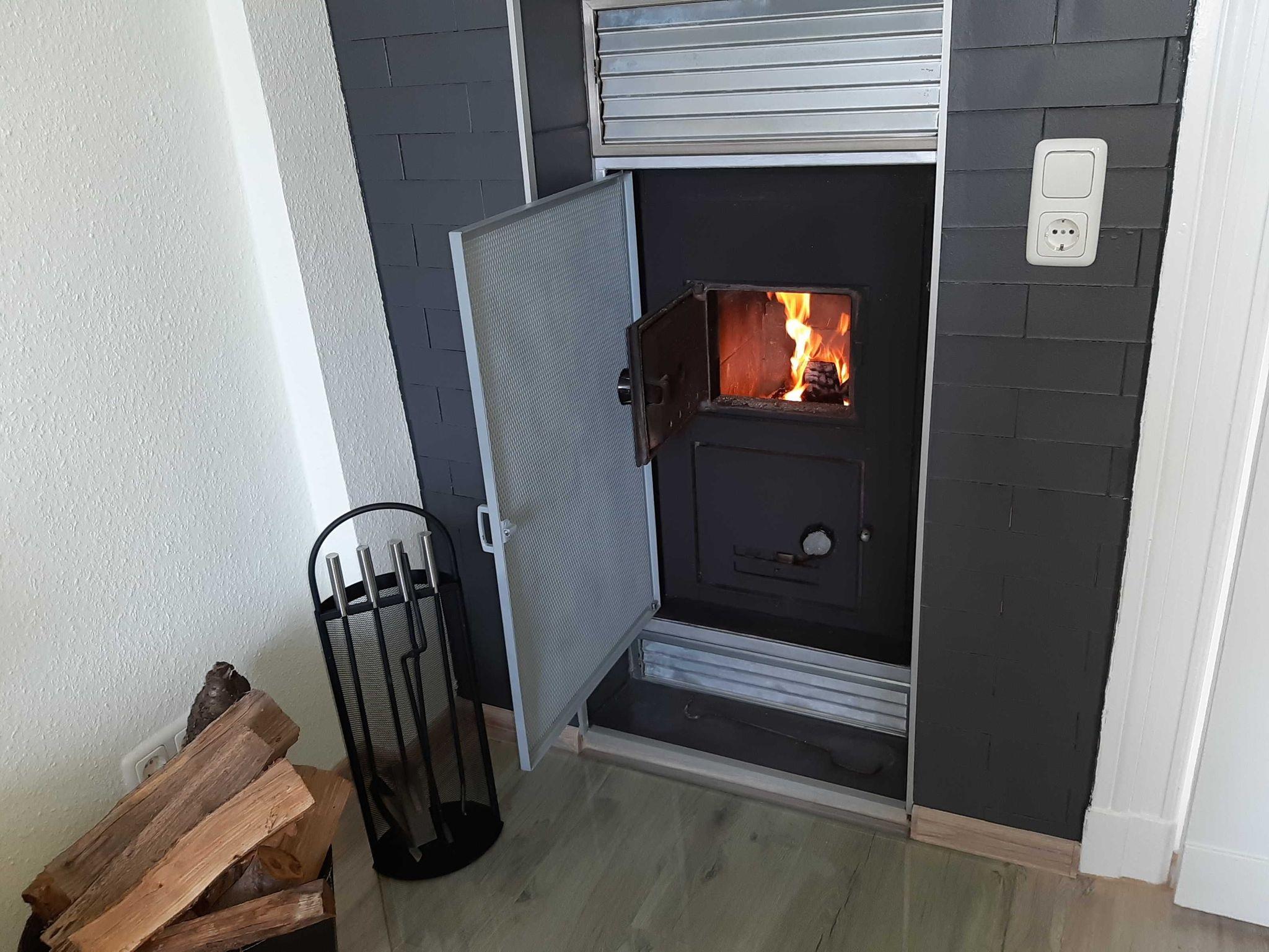 wie einen großen, alten Kachelofen, eine Einbauküche mit modernen Geräten, eine Waschmaschine und eine Badewanne.