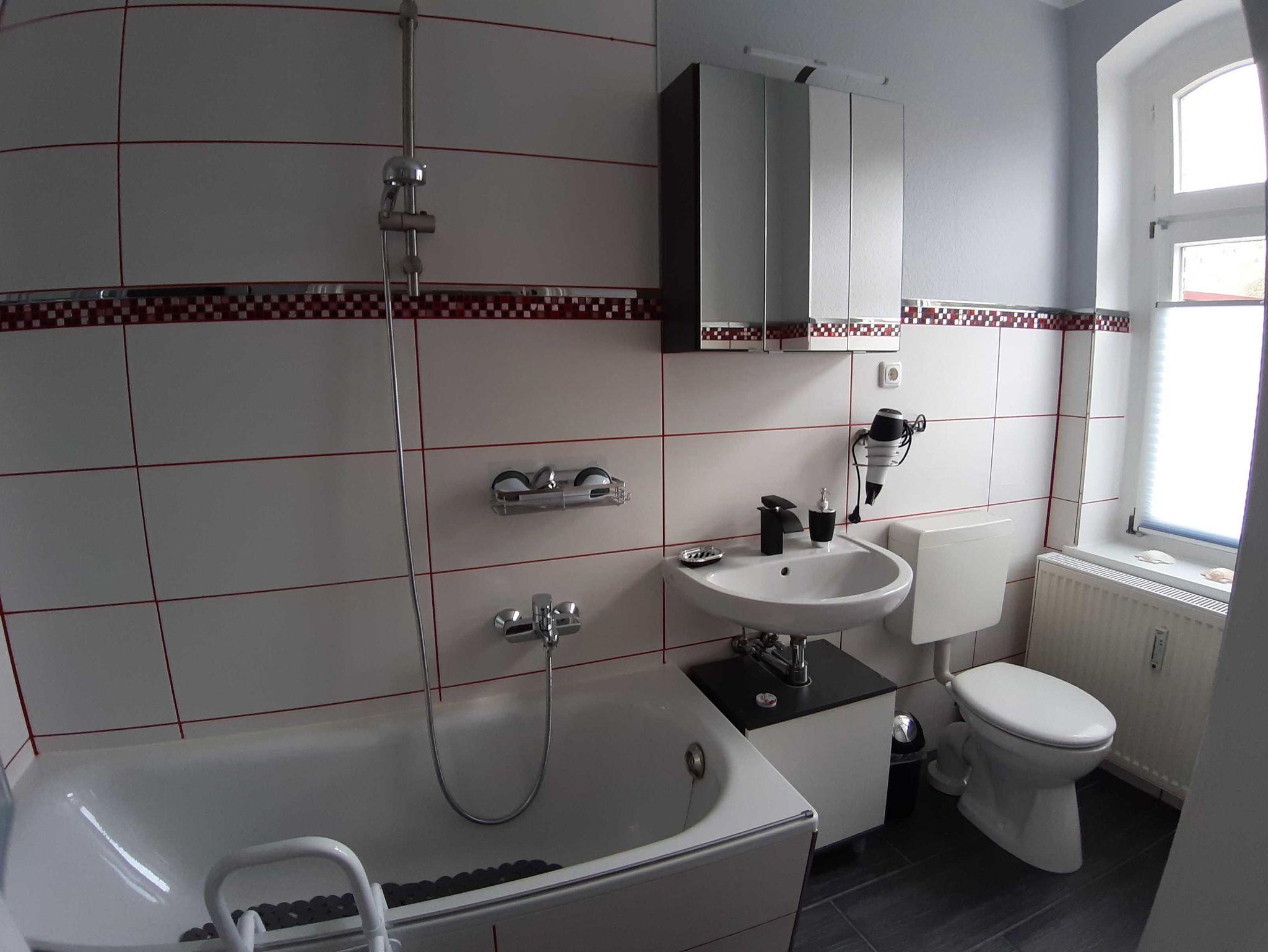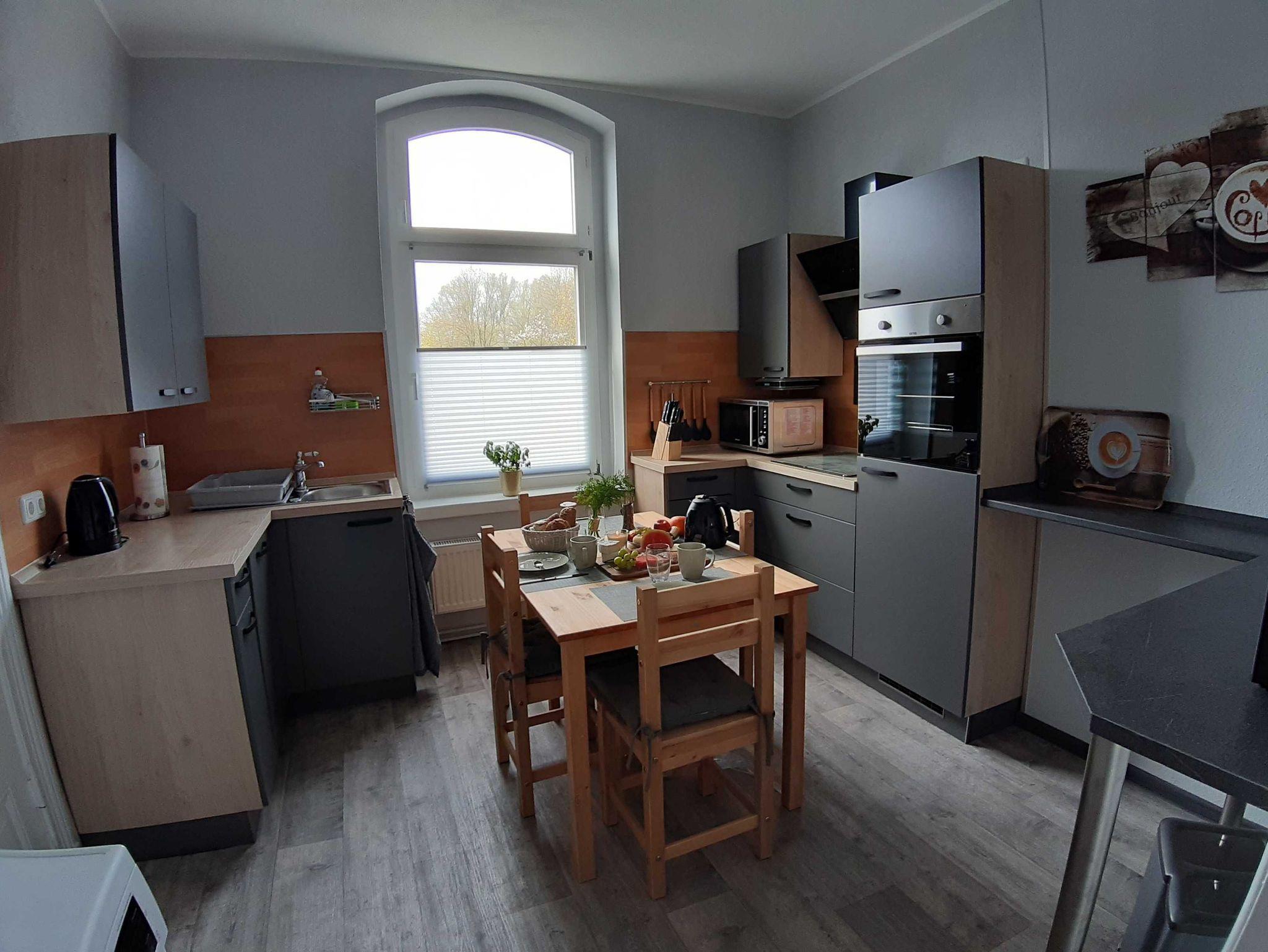 Die Einbauküche mit Essbereich und das Badezimmer mit Badewanne, Duschmöglichkeit und WC verfügen über große Fenster.