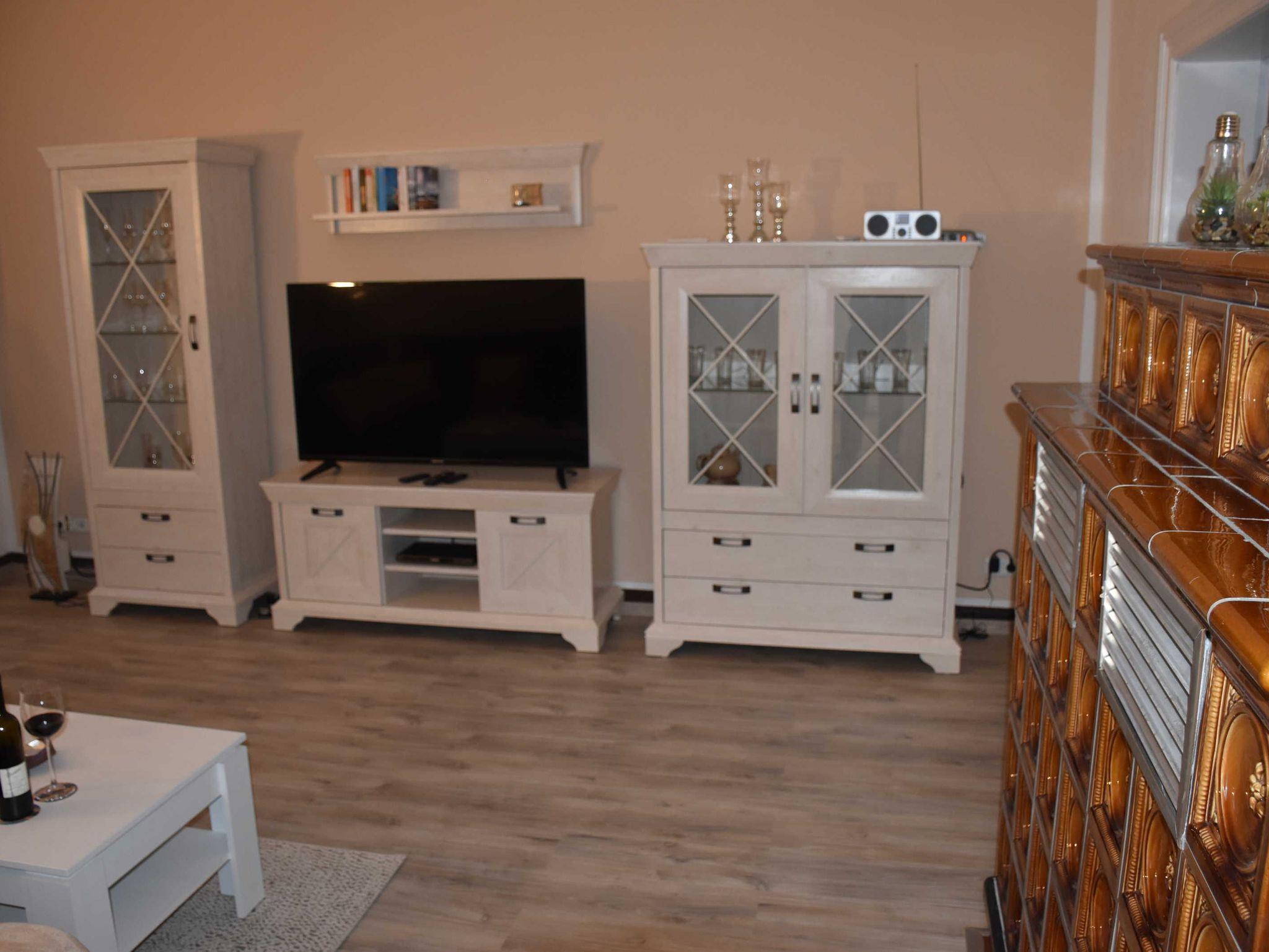 Im Wohn - und Schlafzimmer sind Flachbildfernseher vorhanden. Für Gemütlichkeit sorgen im Wohnzimmer eine große Eckcouch, die ausziehbar ist (auf eine Liegefläche auf eine 1,40 x 1,80 m) sowie ein großer Kachelofen.