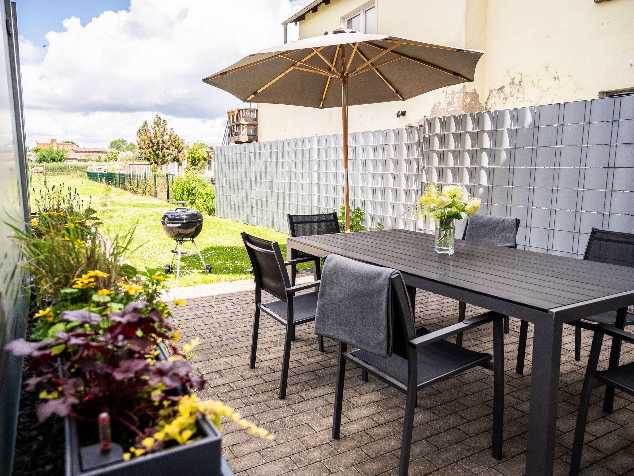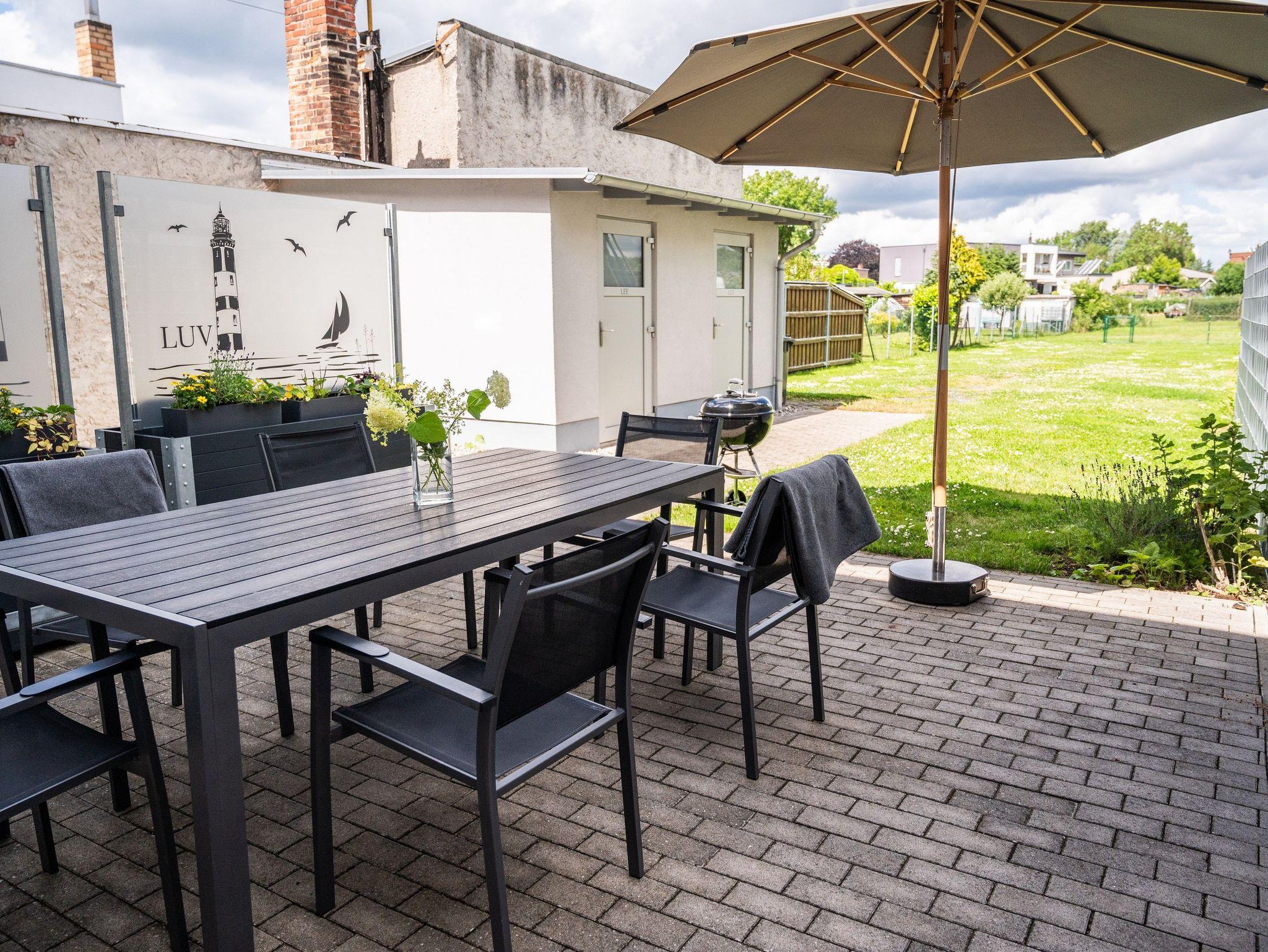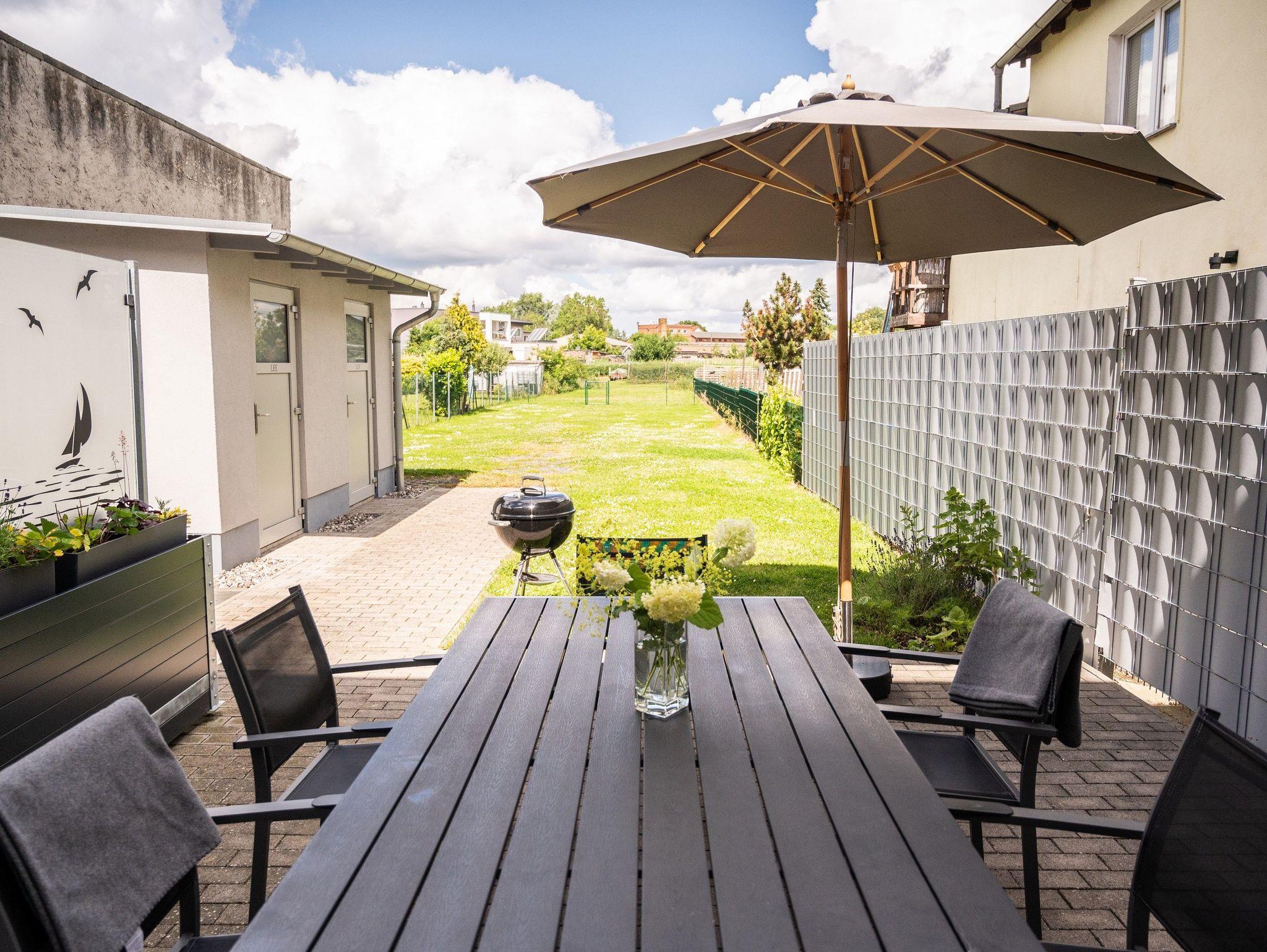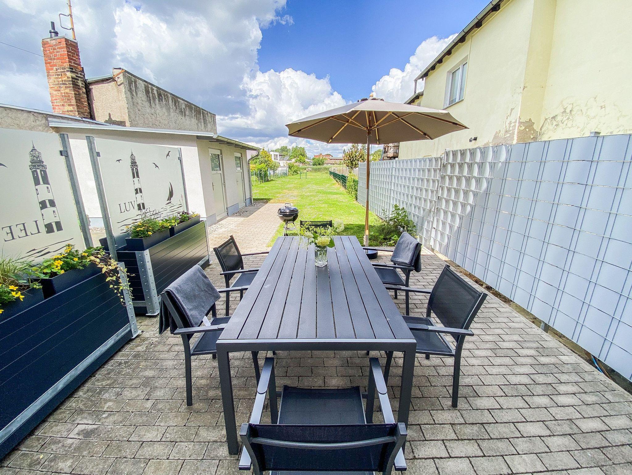 Im Außenbereich gibt es eine möblierte Terrasse, Gasgrill, Sonnenliegen, Unterstellmöglichkeiten für mitgebrachte Fahrräder und einen Parkplatz. Im Gesamtpreis enthalten sind Bettwäsche, Handtücher sowie der Wasser- und Stromverbrauch. Gäste des Seebades Ueckermünde sind kurabgabepflichtig.