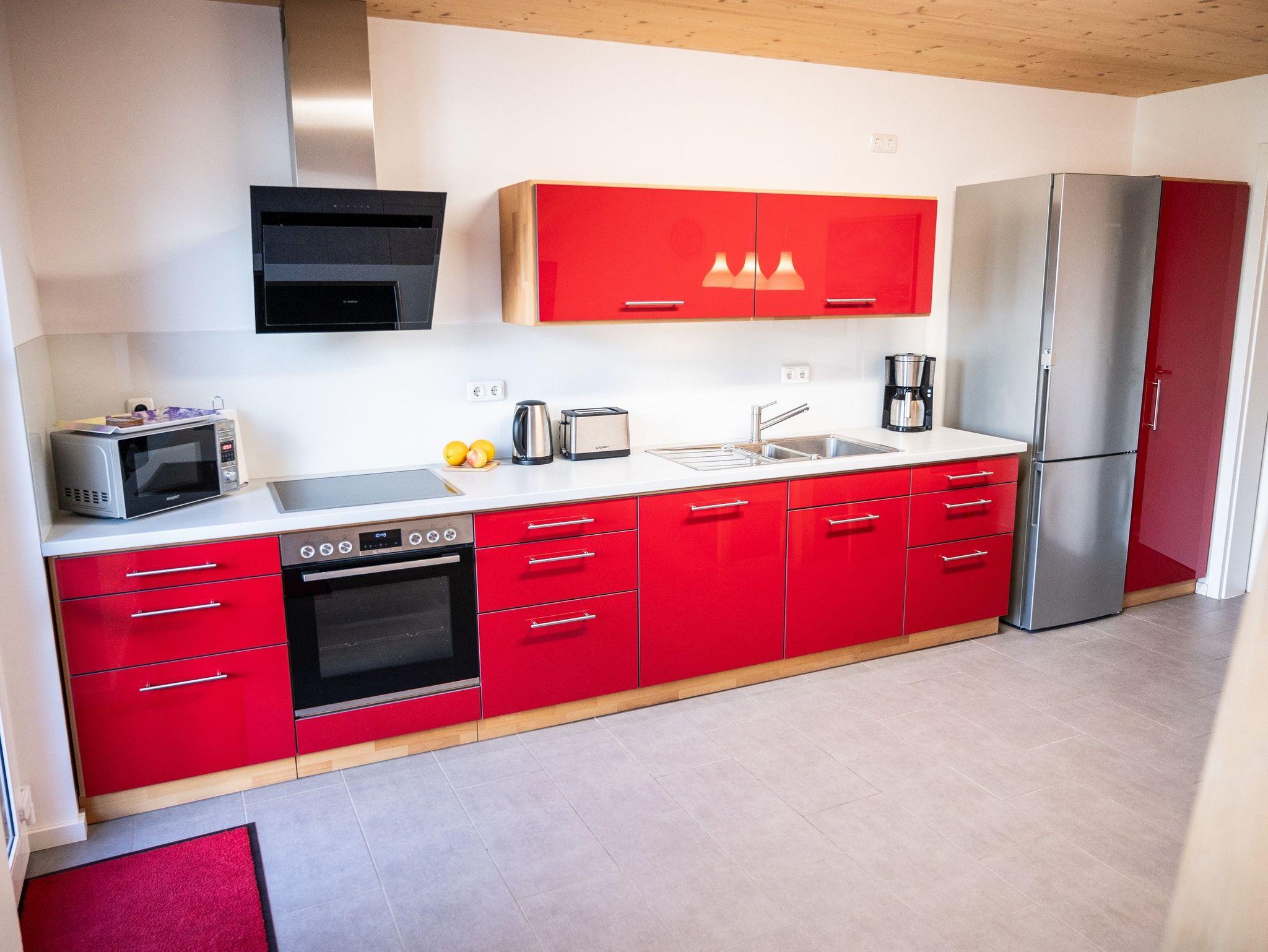 Der Innenausbau einschließlich der Möbel besteht aus geöltem Buchenholz. Die Ausstattung ist insgesamt sehr hochwertig und genügt gehobenen Ansprüchen. Das Haus erstreckt sich über drei Wohnebenen. Im Erdgeschoss befinden sich eine große Küche mit kompletter Küchenzeile (E-Herd mit Backofen, Kühlschrank mit Tiefkühlteil, Geschirrspüler, Mikrowelle, div. Küchengeräte, Esstisch, Flachbild-TV), ein Gäste-WC und ein Hauswirtschaftsraum mit Waschmaschine und Trockner.