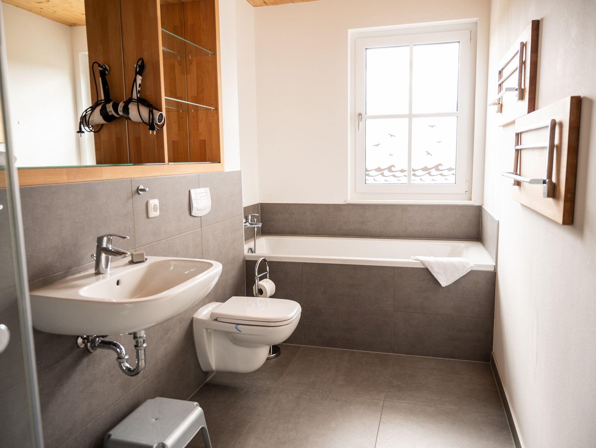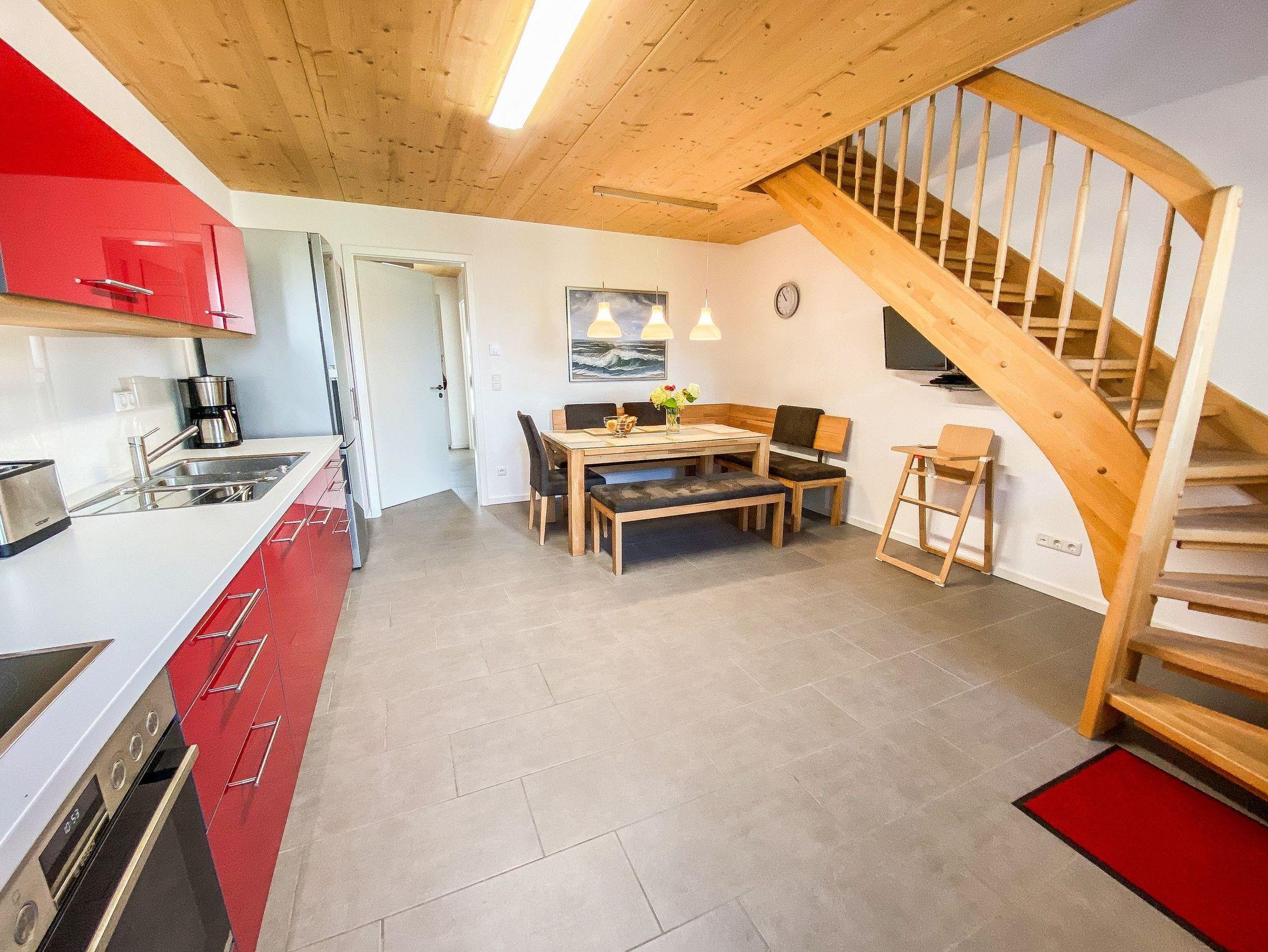 Im 1. OG befinden sich der Wohnraum (Polstermöbel, Flachbild-TV), 1 Schlafraum (2 Einzelbetten) und das Bad mit Dusche und Wanne. Im 2. OG gibt es 2 weitere Schlafräume mit je einem Doppelbett. Diese Schlafräume stehen erst ab einer Belegung von mindestens 3 Personen zur Verfügung.Für Kleinkinder stehen ein Kinderbett und ein Kinderhochstuhl kostenfrei bereit (bitte den Bedarf vor Anreise beim Eigentümer anzeigen). Internet (WLAN) und Magenta-TV sind ebenfalls vorhanden.