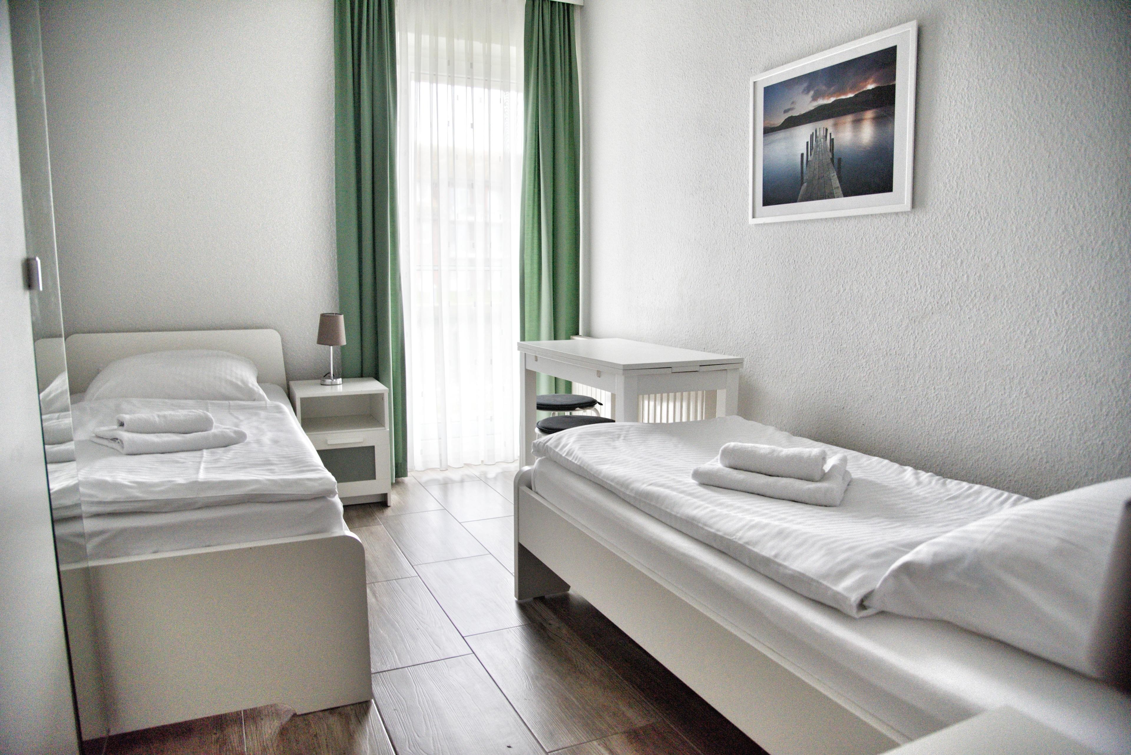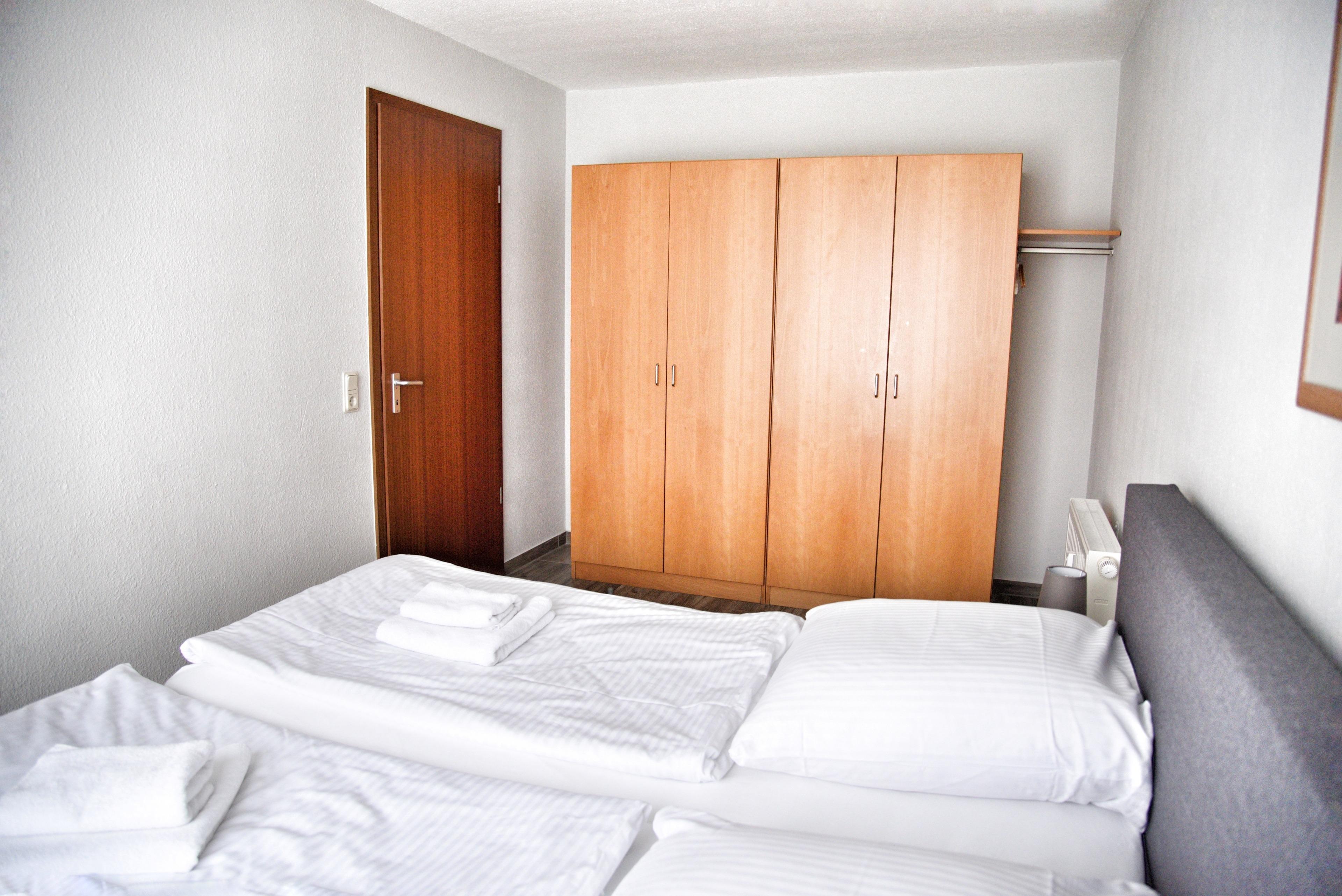 In Ihrem Hauptschlafzimmer befindet sich ein komfortables Boxspringbett. Nachttische, Leselampen und zwei Kleiderschränke komplettieren die Einrichtung für Sie. Im kleinen Schlafzimmer sind zwei Einzelbetten für Sie vorhanden. Ihre Einbauküche ist für Sie voll ausgestattet. Bestandteile sind unter anderem Kochfeld, Backofen, Kaffeemaschine, Mikrowelle, viel Geschirr, eine große Kühl- und Gefrierkombination und weiteres Equipment. Das Badezimmer hält eine Dusche mit Duschkabine, Ablageflächen und einen Fön für Sie bereit. Ihre mitgebrachten Utensilien können Sie hier gut verstauen. Im Flur finden Sie eine Garderobe, einen großen Spiegel und Reinigungsgeräte vor. Das Appartement Neptun liegt im Erdgeschoß des Hauses Störtebeker, im Eingang 3. In unmittelbarer Nähe dieses Appartements befinden sich weitere Ferienappartements unserer Gesellschaft. Eine gemeinsame Anmietung ist hier sehr gut möglich.
