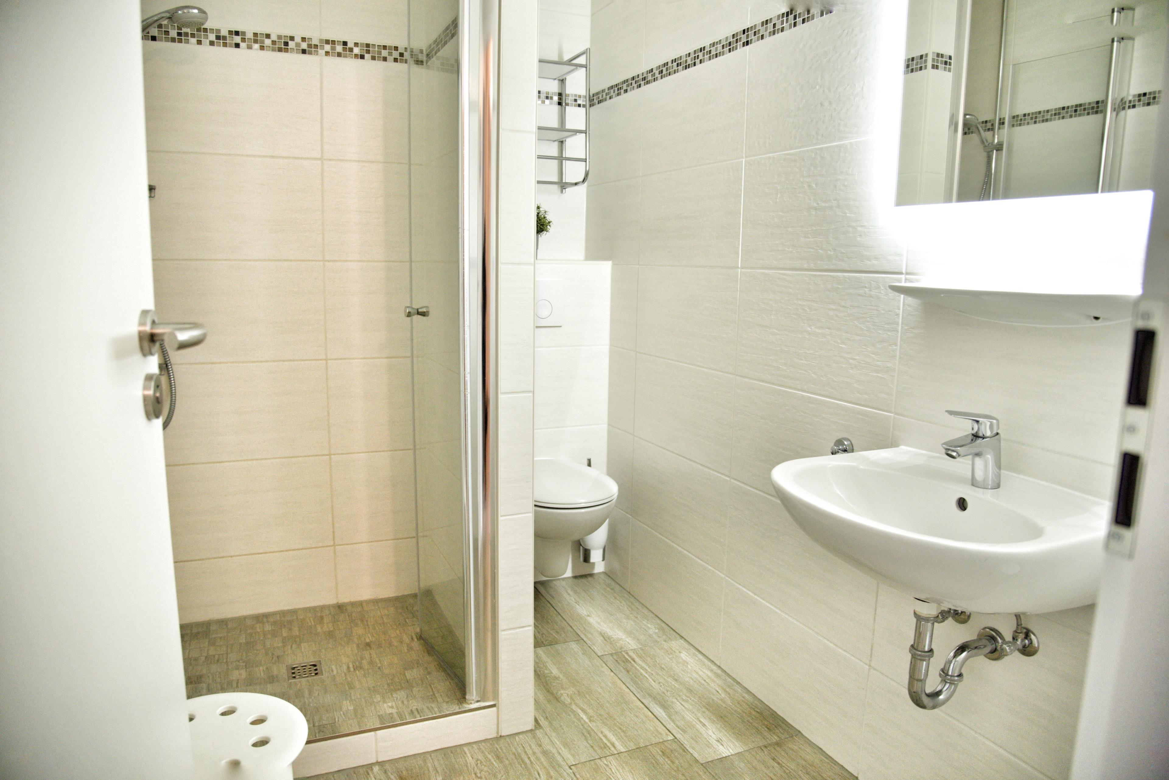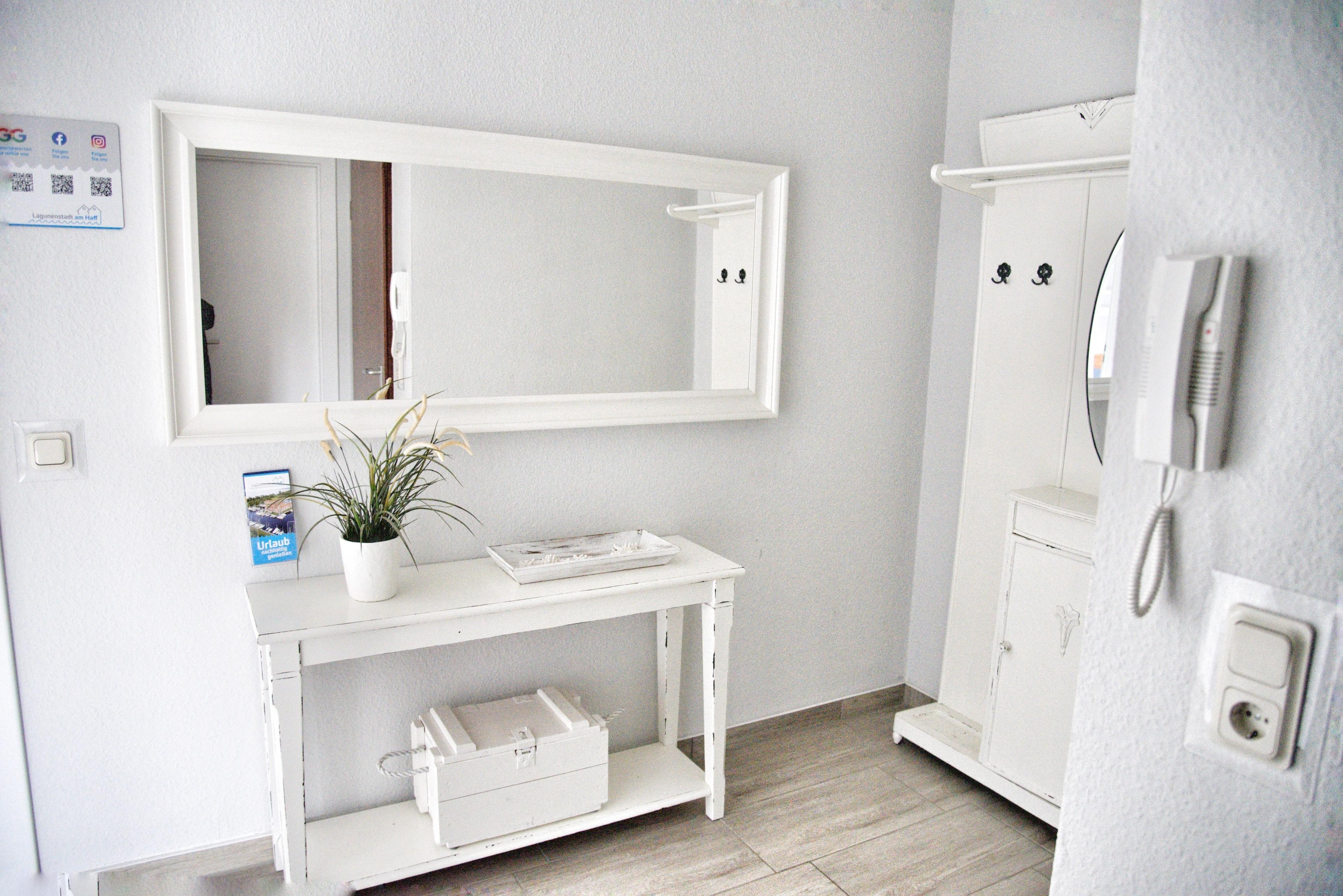 Das lichtdurchflutete Wohnzimmer verfügt über einen Esstisch mit vier Stühlen, ein ausziehbares Schlafsofa mit einem Schlafplatz für zwei Personen und zwei Sesseln. Für die Übernachtungsgäste des Wohnzimmers steht Ihnen ein separater Kleiderschrank zur Verfügung. Multimedial können Sie auf einen großen Flachbildfernseher zurückgreifen. Ihre Ferienwohnung hat einen Kabelanschluss. Einige Gesellschaftsspiele warten hier schon auf Sie. In Ihrem Schlafzimmer befindet sich ein Doppelbett mit höhenverstellbaren Lattenrosten. Nachtische, Leselampen, ein Spiegel und Garderoben möchten hier von Ihnen genutzt werden. Der große Schrank und das Kofferbord werden Ihnen gute Dienste leisten und genügend Stauraum für Ihr Gepäck bieten. Die Wohnküche ist zum Wohnzimmer hin teiloffen, was den Raum großzügig erscheinen lässt. Ihre Sterneküche ist für Sie voll ausgestattet. Bestandteile sind unter anderem ein Cerankochfeld, ein Backofen, eine Kaffeemaschine, eine Mikrowelle, viel Geschirr, ein Geschirrspüler sowie eine große Kühl- und Gefrierkombination. Das große Badezimmer ist mit einer extrahohen Duschkabine und ausreichend Ablageflächen ausgestattet. Vom großen Flur, wo Sie auch eine Garderobe und einen großen Spiegel vorfinden, gehen alle Räume ab. Zusätzlich zu den schon beschriebenen Räumen, hält die Ferienwohnung Brigg auch noch eine kleine Kammer für Sie bereit. Die Ferienwohnung Brigg befindet sich im zweiten Obergeschoss des Hauses Störtebeker im Eingang 2. In unmittelbarer Nähe dieses Appartements befinden sich weitere Ferienappartements unserer Gesellschaft. Eine gemeinsame Anmietung ist hier sehr gut möglich.