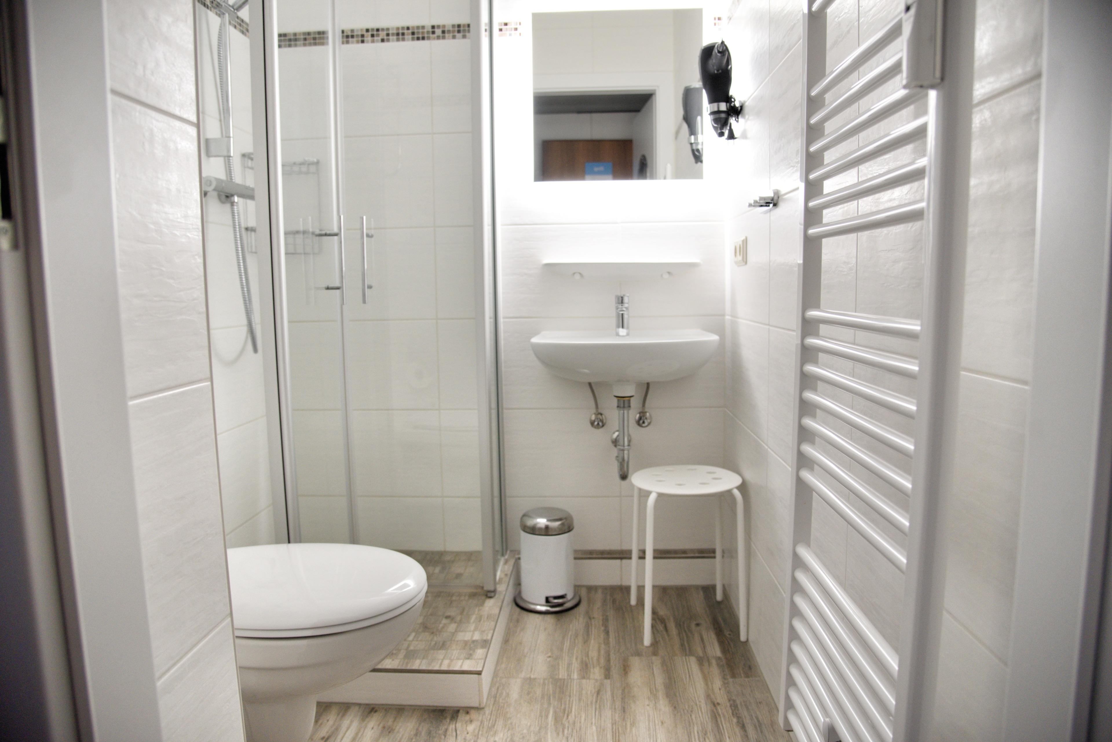 Im offenen Wohn- und Essbereich steht Ihnen ein Esstisch mit zwei Stühlen zur Verfügung. Die Küchenzeile ist sehr gut ausgestattet. Bestandteile sind unter anderem ein Cerankochfeld und Backofen, eine Kaffeemaschine, eine Mikrowelle, ein Geschirrspüler sowie ein Kühlschrank. Multimedial stehen Ihnen hier ein Flachbildfernseher mit Kabelanschluss, eine Playstation 3 mit Spielen und DVDs zur Verfügung. Gesellschaftsspiele und Bücher dürfen nicht im Bestand fehlen. Beidseitig Ihres Bettes finden Sie einen Nachttisch mit einer Leselampe vor. Auch steht Ihnen ein großer Kleiderschrank zur Verfügung. Das Badezimmer hat eine Dusche und natürlich finden Sie auch hier Ablageflächen. Der Flur beherbergt eine Flurgarderobe und einen weiteren Kleiderschrank.
